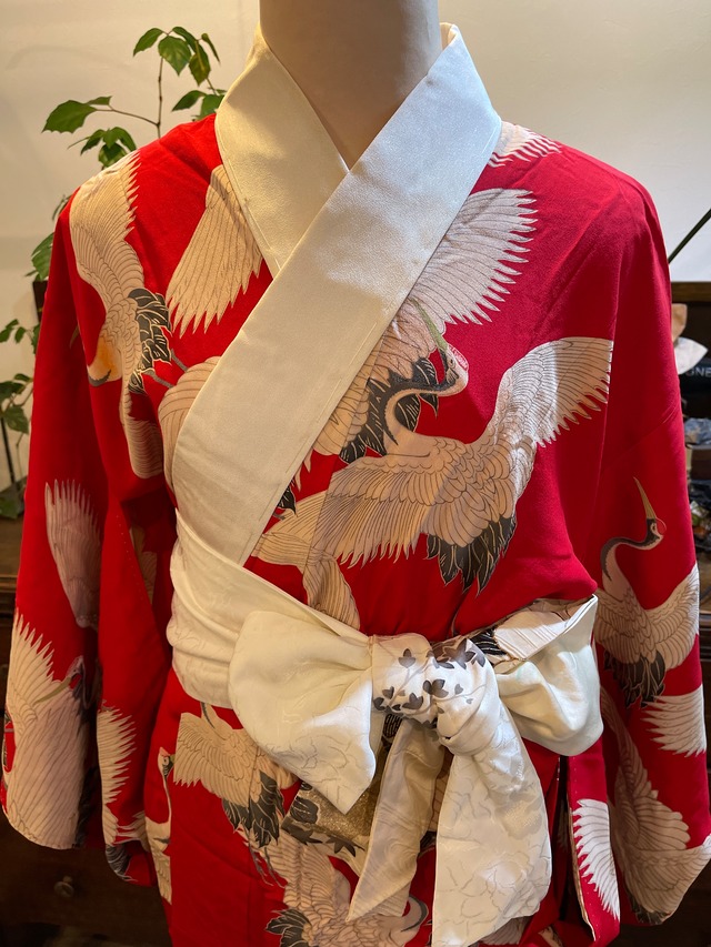 長襦袢 アンティーク長襦袢 赤系 鶴 紅絹 袷仕立て 部屋着 ガウン