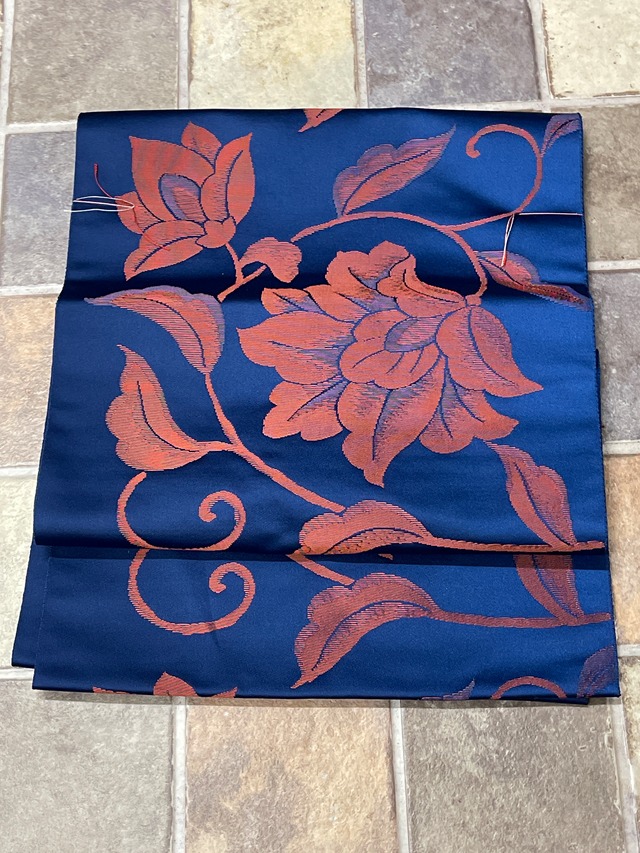 八寸名古屋帯 紺地 赤洋花 カジュアル 普段着 日常着 お稽古