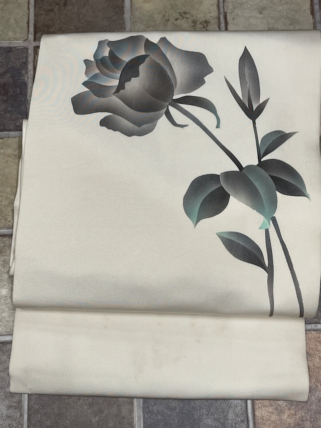 九寸名古屋帯 塩瀬 白地 グレー バラ一輪 カジュアル 女子会 食事会 お稽古