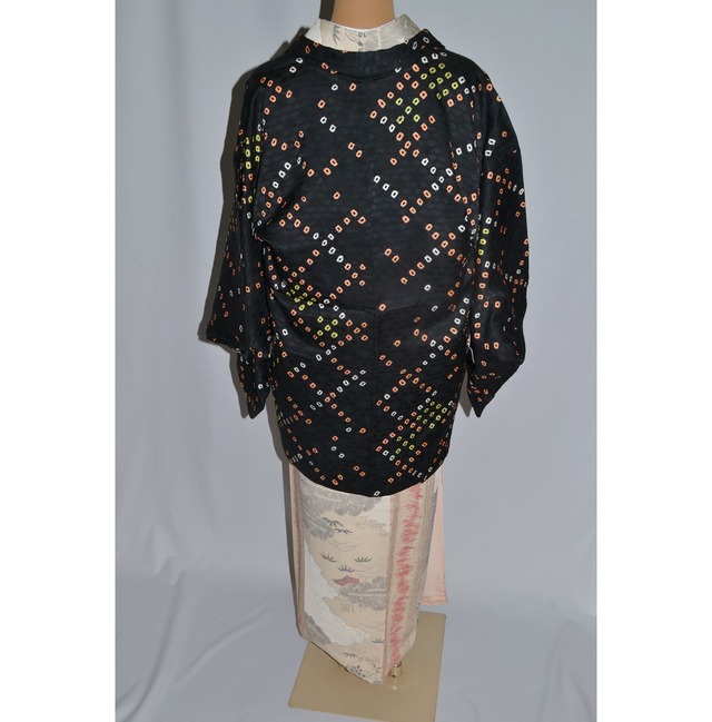 フォーマルにお使いいただける、つたの縫い取り紋の入った羽織です。 黒地に同色でアラレのような地紋と扇か銀杏のような柄がとび柄で入っています。 また袖、腰などに絞りのとび柄が白く抜かれています。 羽織 身丈 79cm 袖丈 48cm 裄 65cm 前巾 -cm 後巾 -cm 状態:正絹、裏地くすみ、つたの縫い取り紋入り、羽織ひも付 ※ 検品には、できるだけ注意を払い、シミ・汚れ等を記載しておりますが、微小の汚れ等につきましては、見落としがある場合もありますので、ユーズド品であることにご理解いただきご購入をおねがいします。 ※写真は撮影環境上や、モニターの違いや光のあたり具合により、色や雰囲気が実物と若干異なる場合がございますので、ご了承ください ※当店は一点ものを出品しています。同時出品しているため、実店舗や他ネット店での売り切れもございます。迅速な更新を心がけておりますが先着順となります、あらかじめご了承ください。