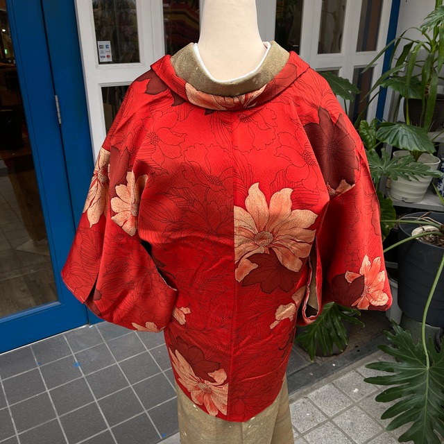 縮緬生地だと思います、黒地にピンクや黄色の花が大きく染められています。 お花畑を切り取ったような華やかな道行コートです。 身丈 86cm 袖丈 54cm 裄 67cm 前巾 35cm 後巾 30cm 状態:正絹、裏地薄く黄変、表目立ったシミ汚れなし ※ 検品には、できるだけ注意を払い、シミ・汚れ等を記載しておりますが、微小の汚れ等につきましては、見落としがある場合もありますので、ユーズド品であることにご理解いただきご購入をおねがいします。 ※写真は撮影環境上や、モニターの違いや光のあたり具合により、色や雰囲気が実物と若干異なる場合がございますので、ご了承ください ※当店は一点ものを出品しています。同時出品しているため、実店舗や他ネット店での売り切れもございます。迅速な更新を心がけておりますが先着順となります、あらかじめご了承ください。