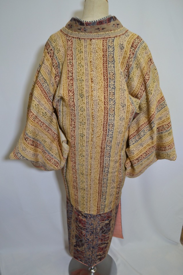 何とも素晴らしい織柄の道行コートです。 横うねがポコポコした織で、なおかつ透かし紋様が入っています。 模様はカラフルな更紗の個性的な柄です。 道行ですが、襟元が丸くなっています。 これもアンティークの道行コートの特徴です。 着丈 91㎝ 裄 63㎝ 袖丈 48㎝ 前巾 55.5㎝ 後巾 48㎝ 状態:美品 ※ 検品には、できるだけ注意を払い、シミ・汚れ等を記載しておりますが、微小の汚れ等につきましては、見落としがある場合もありますので、ユーズド品であることにご理解いただきご購入をおねがいします。 ※写真は撮影環境上、またモニターの違いや光のあたり具合により、色や雰囲気が実物と若干異なる場合がございますので、ご了承ください。