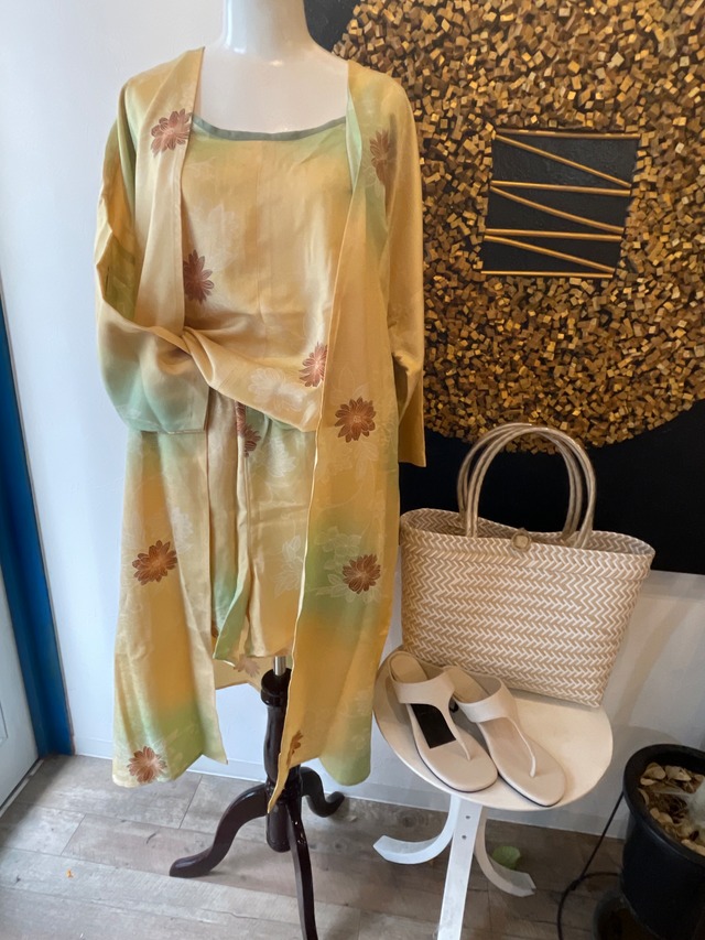 ルームウェア ローブ ガウン着物リメイク イエロー 抹茶グリーン 部屋着