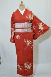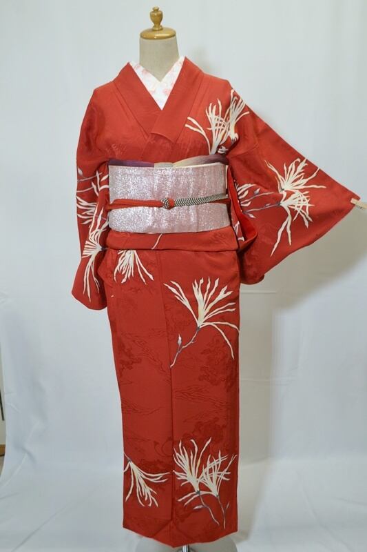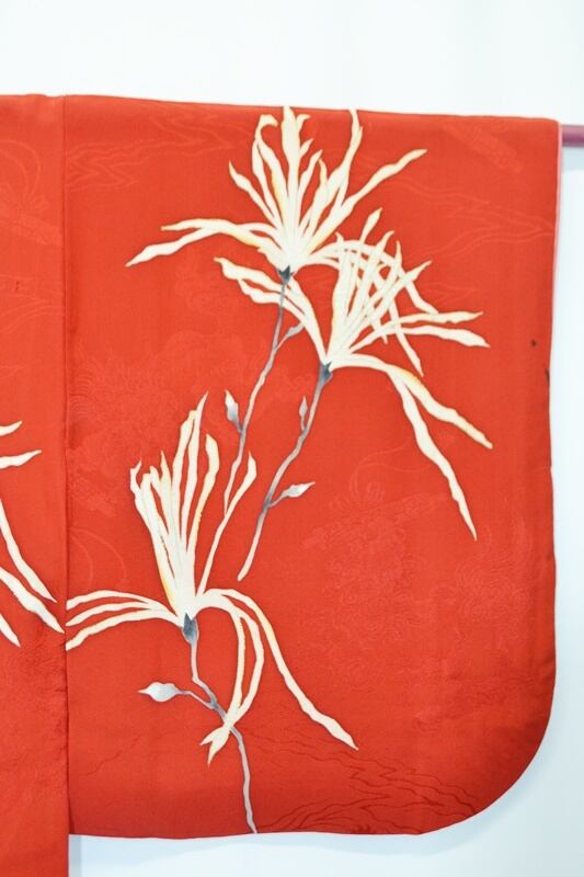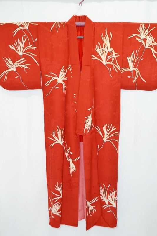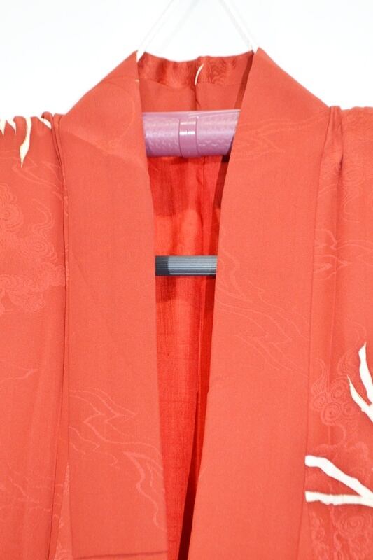 希少柄!アンティーク着物 唐獅子の地紋様に糸菊 紅絹 真紅 貴重