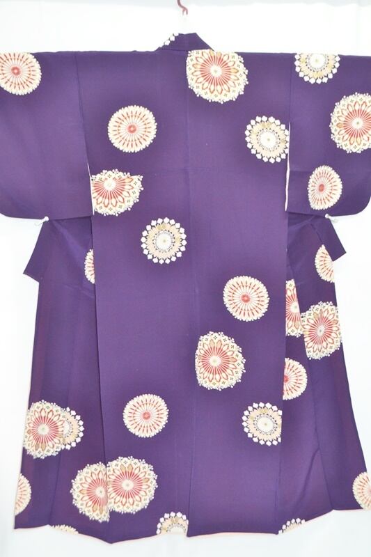 アンティーク着物 濃紫 ゴールド 花丸紋 アンティーク 着物 錦紗縮緬 大正浪漫 大正ロマン カジュアル 普段着 レトロ 可愛い