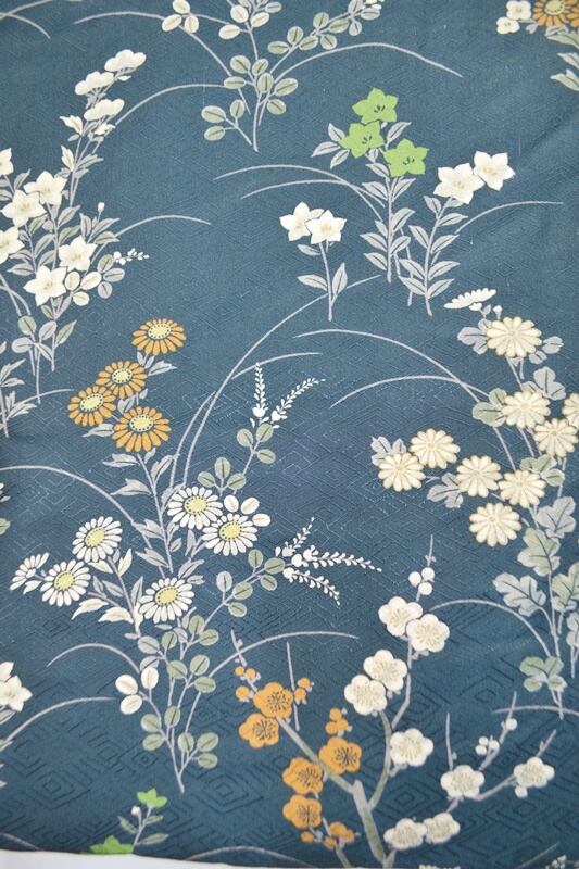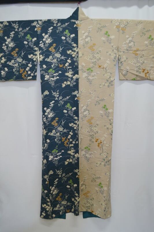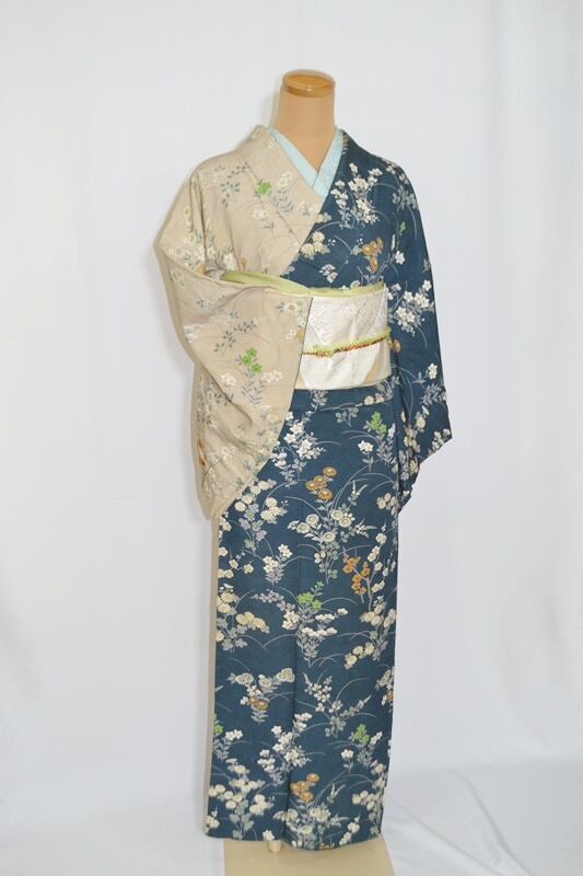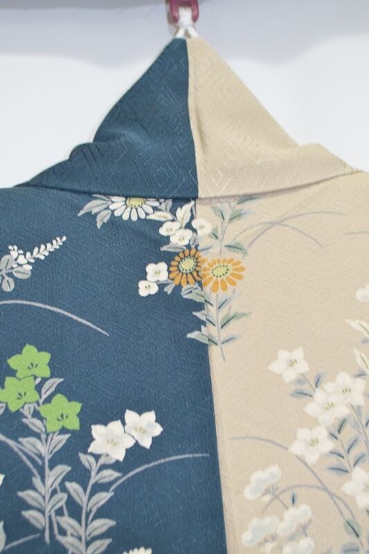片身替り 四季の花 ブルー ベージュ 小花 古典柄 可愛い 個性的 片身代わり 小紋 普段着 カジュアル