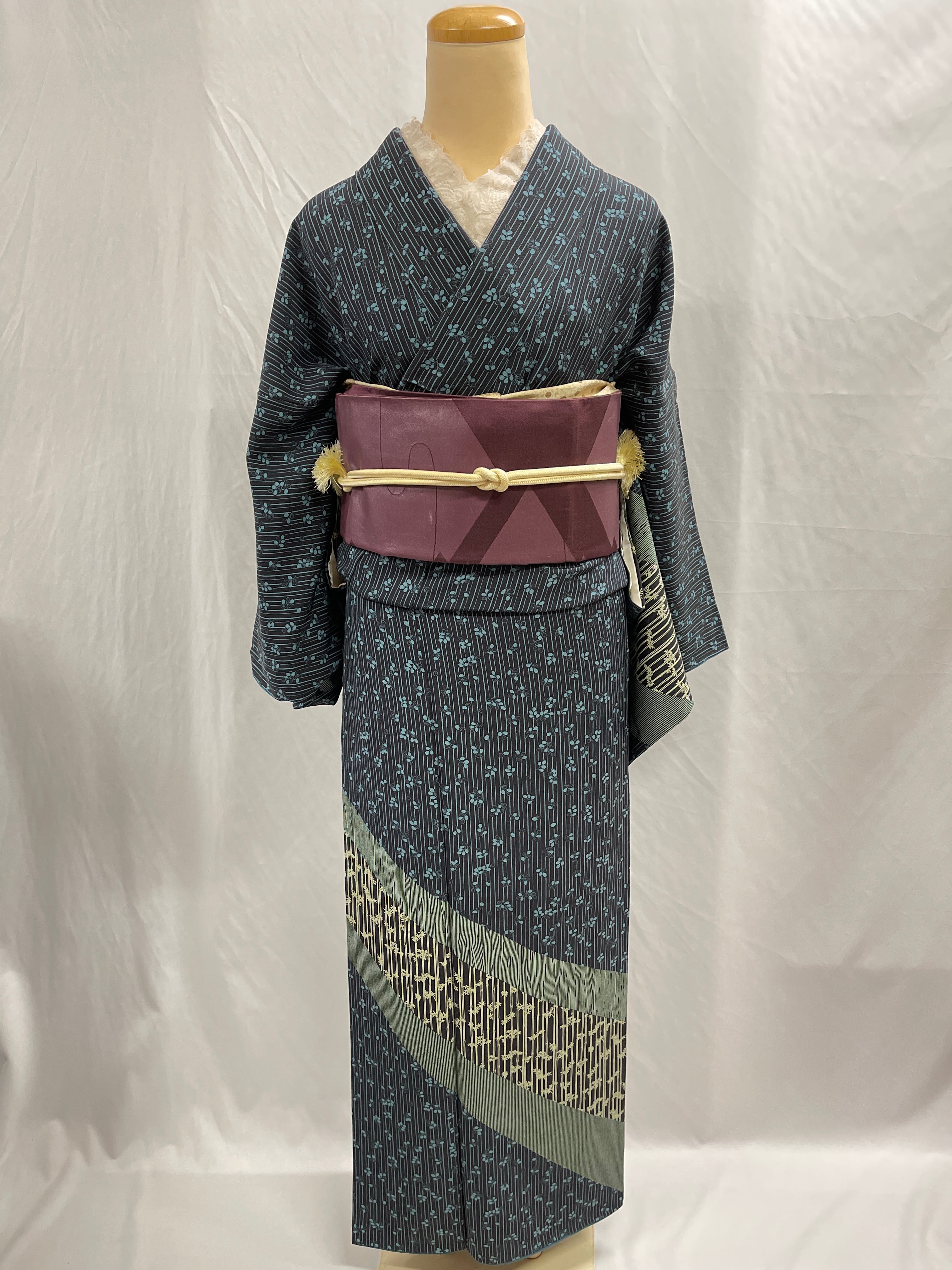付下げ 小紋 裄68.5cm ゆったりサイズ 紺地 萩 竹