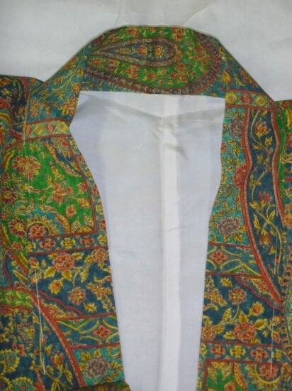 派手に見えがちな更紗ですが、間に配色された、オリエンタルな柄の中のモスグリーンがシックにまとめて、大人の着こなしがお楽しみいただけます。