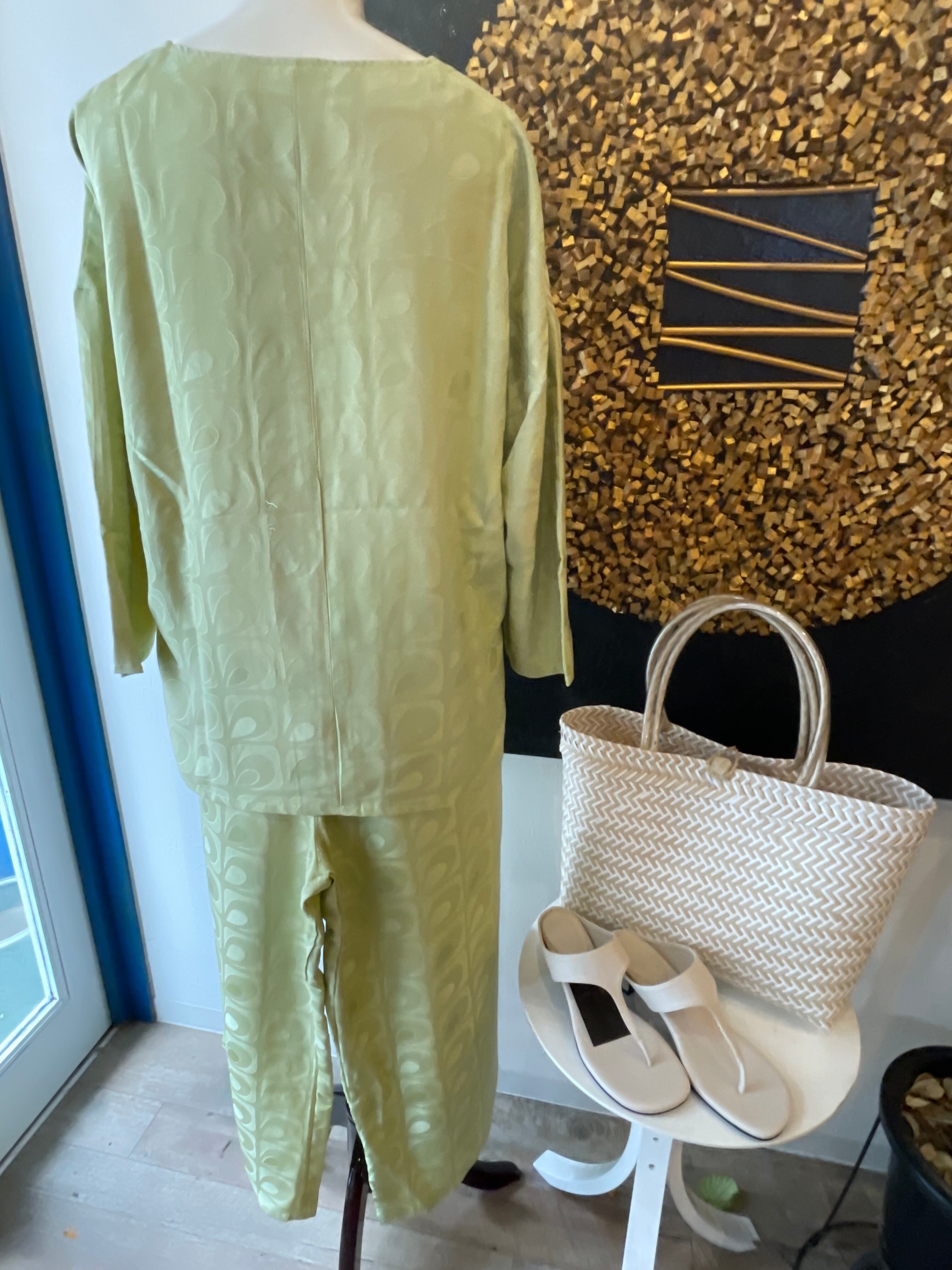 ルームウェア 抹茶グリーン 着物リメイク オリジナルルームウェア シルクセットアップ 長袖プルオーバー パンツ 2点セット パジャマ 部屋着 旅行