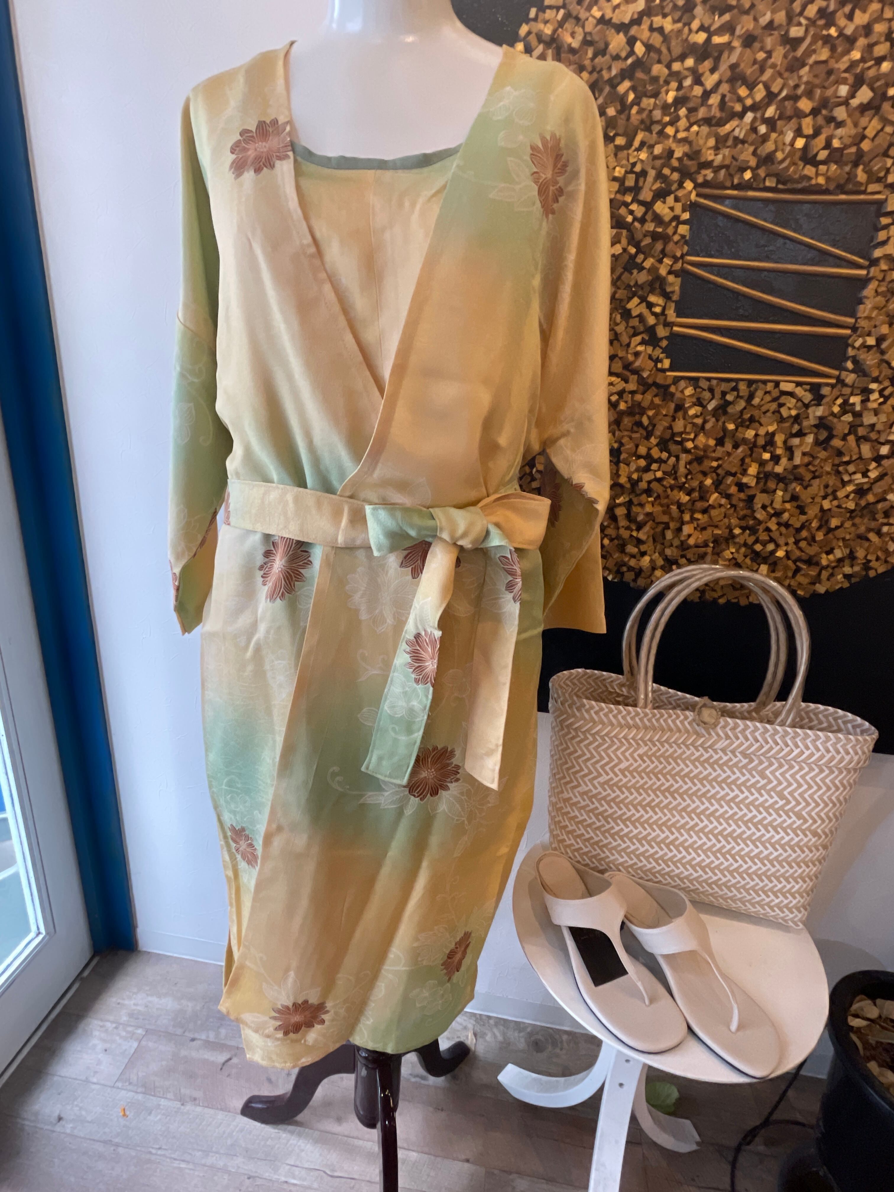 イエローと抹茶グリーンの美しい色合いが特徴のルームウェアは、着物をリメイクして作り上げた特別なガウンです。シルク素材を使用し、軽やかで心地良い着心地を実現しました。自宅でのリラックスタイムや旅行先での着用にもぴったりのデザインが魅力です。