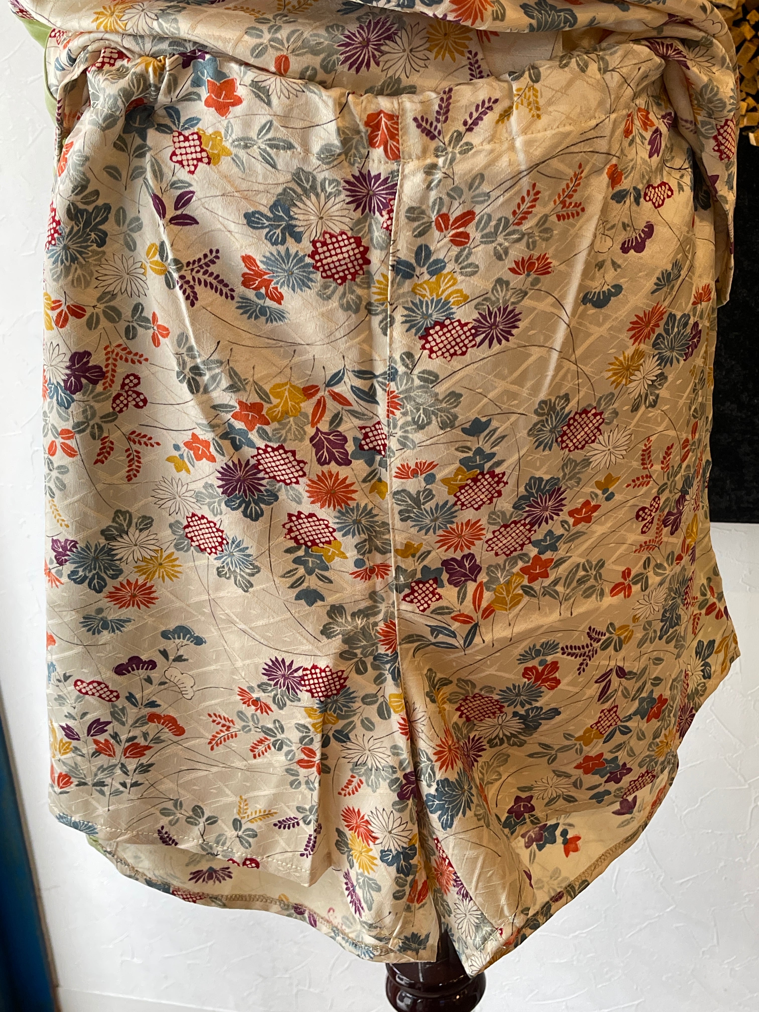 ルームウェア シルクセットアップ 着物リメイク キャミソール トップスアンドショートパンツ 2点セット ベージュ お花 古典柄 パジャマ 部屋着 旅行
