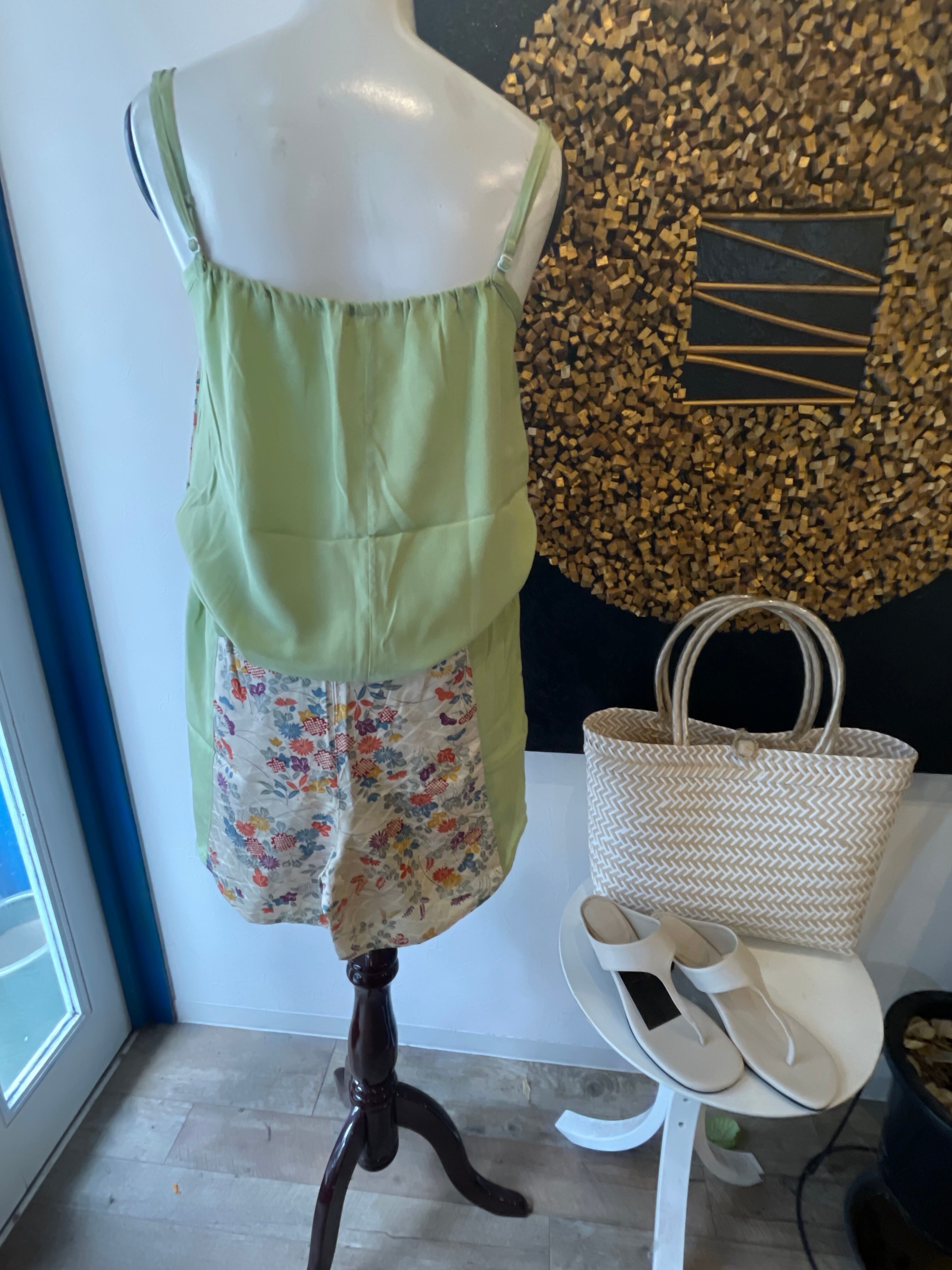 着物をリメイクして作り上げた特別なアイテムです。シルク素材を使用したキャミソールとショートパンツの組み合わせは、軽やかで心地良い着心地を実現しました。おうち時間を優雅に過ごすための必需品として、また旅行先でのリラックスタイムにも最適なデザインが魅力です。