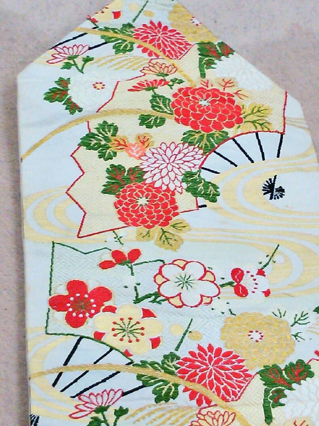 帯地をはみ出すほど大胆な流水紋にこれまた大きな扇が開いています。