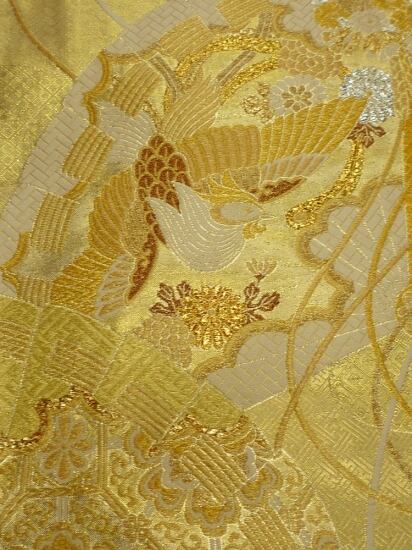 ゴールドづくしの扇に鳳凰、花束と周りは吉祥文様で織りなす帯は豪華の一言!