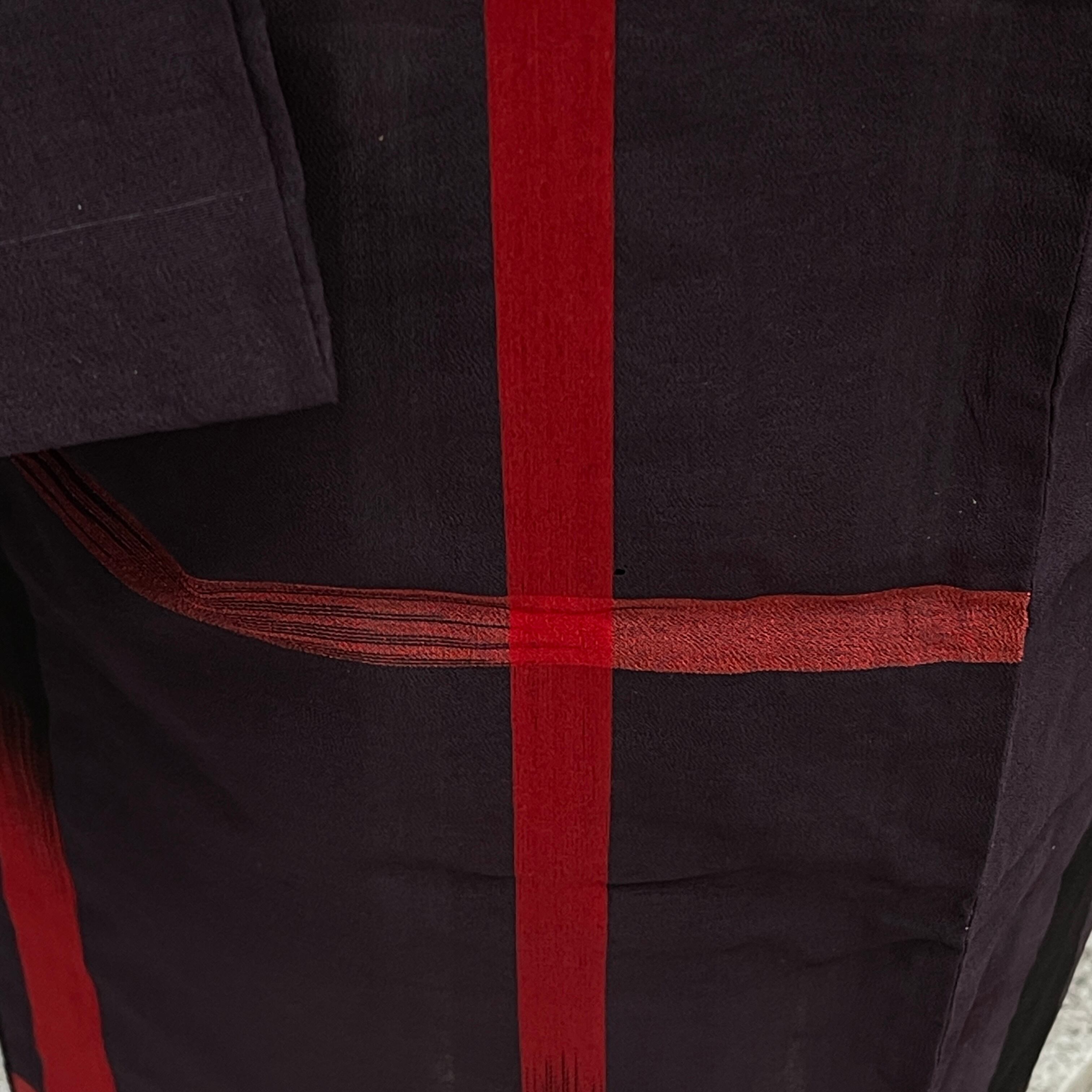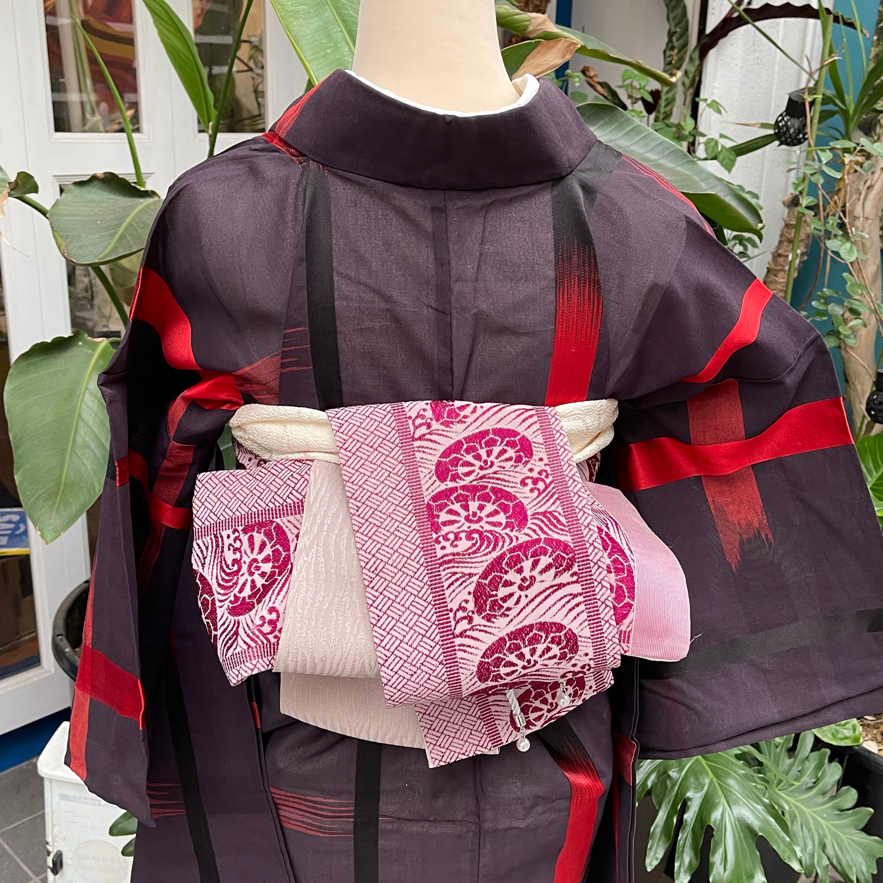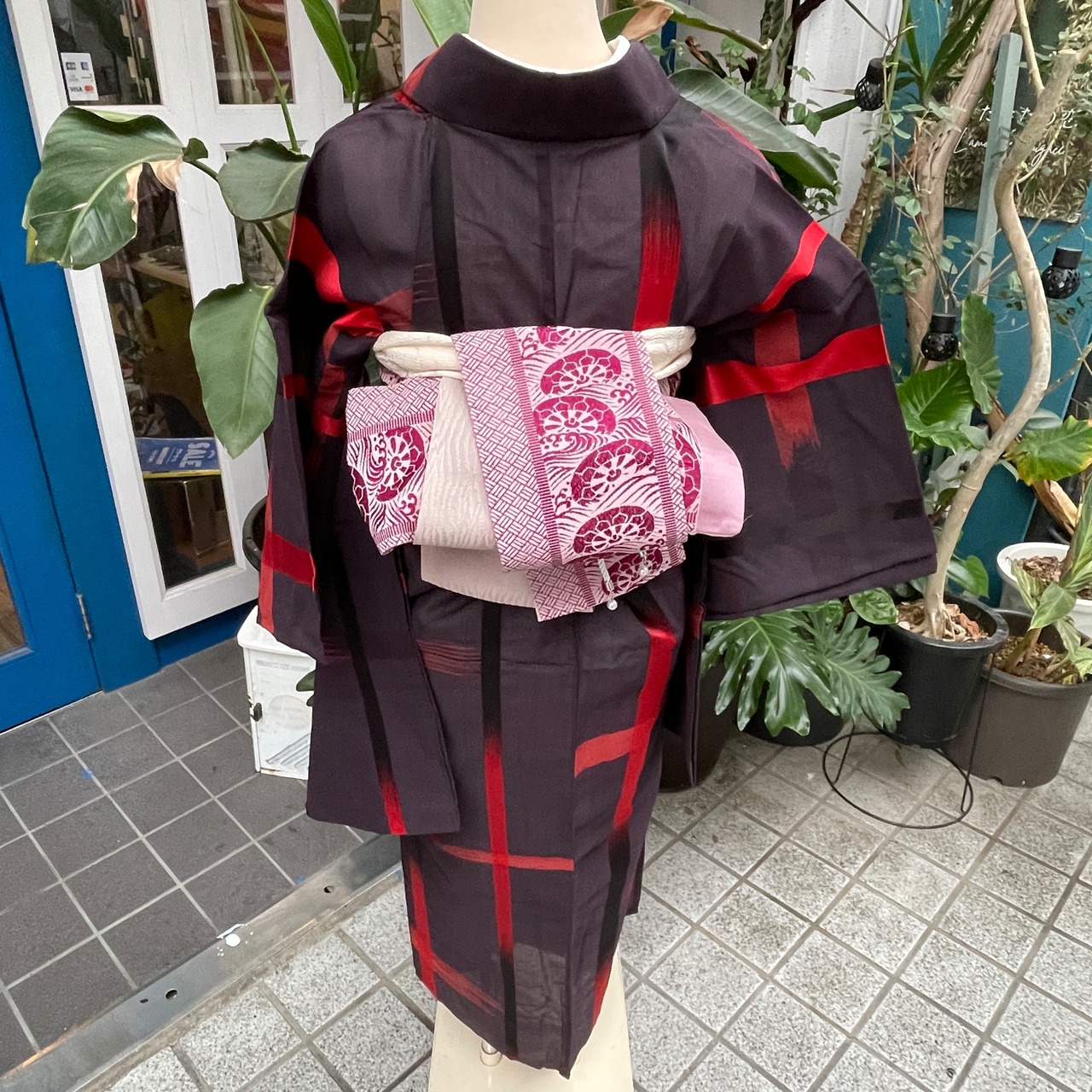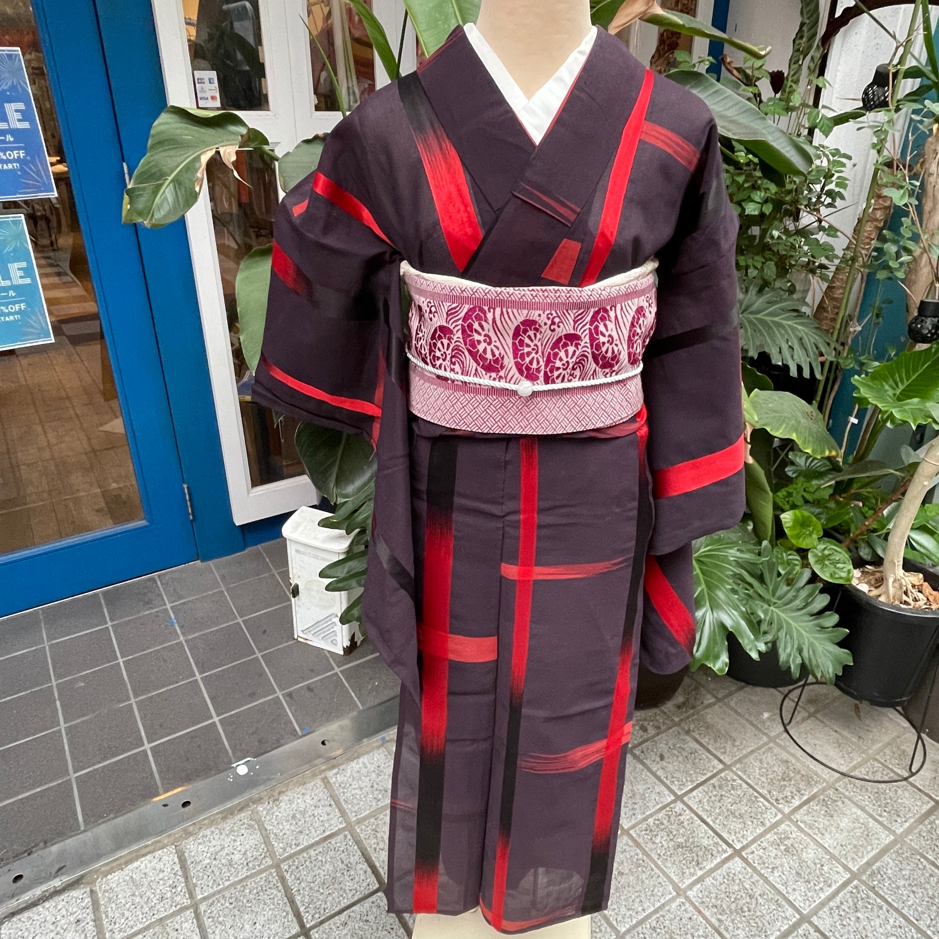 アンティーク着物 夏着物 紗 茄子紺絣 赤 格子カジュアル