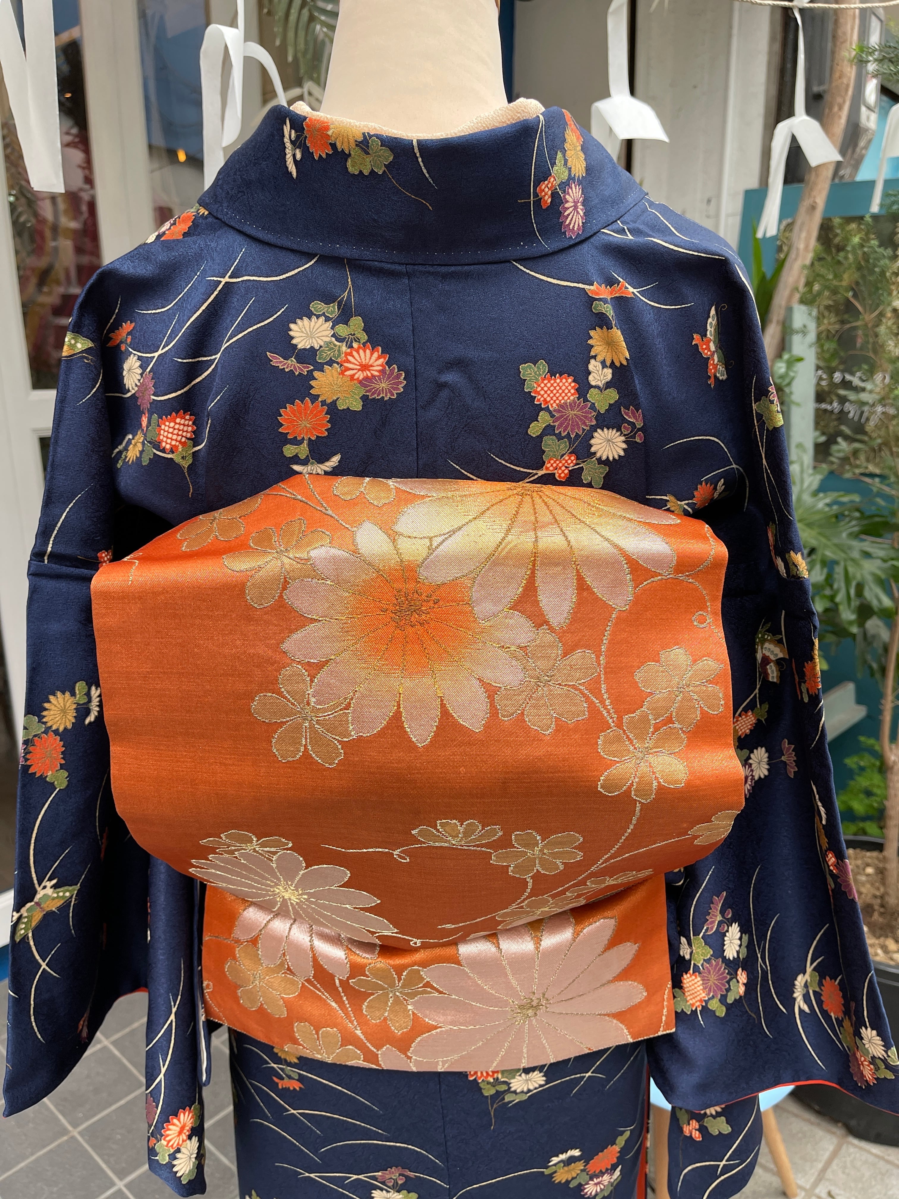 小紋 セミアンティーク トールサイズやまとちょう 綸子 紺地 菊 蝶 カジュアル 日常着 普段着 お稽古 お茶席 女子会 食事会