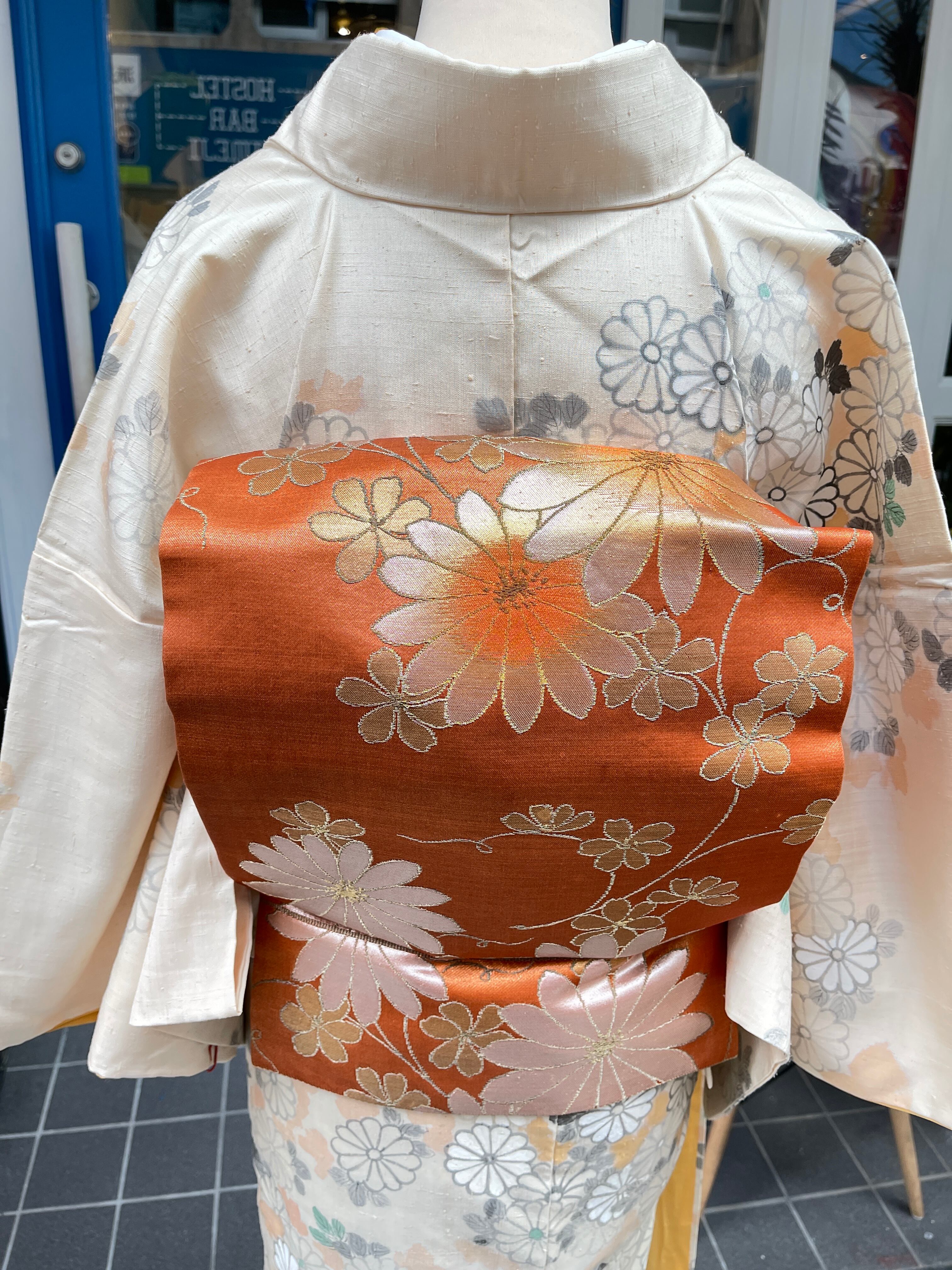 九寸名古屋帯 やまとオリジナル オレンジ地 花唐草 カジュアル 普段着 日常着 お稽古 女子会 食事会