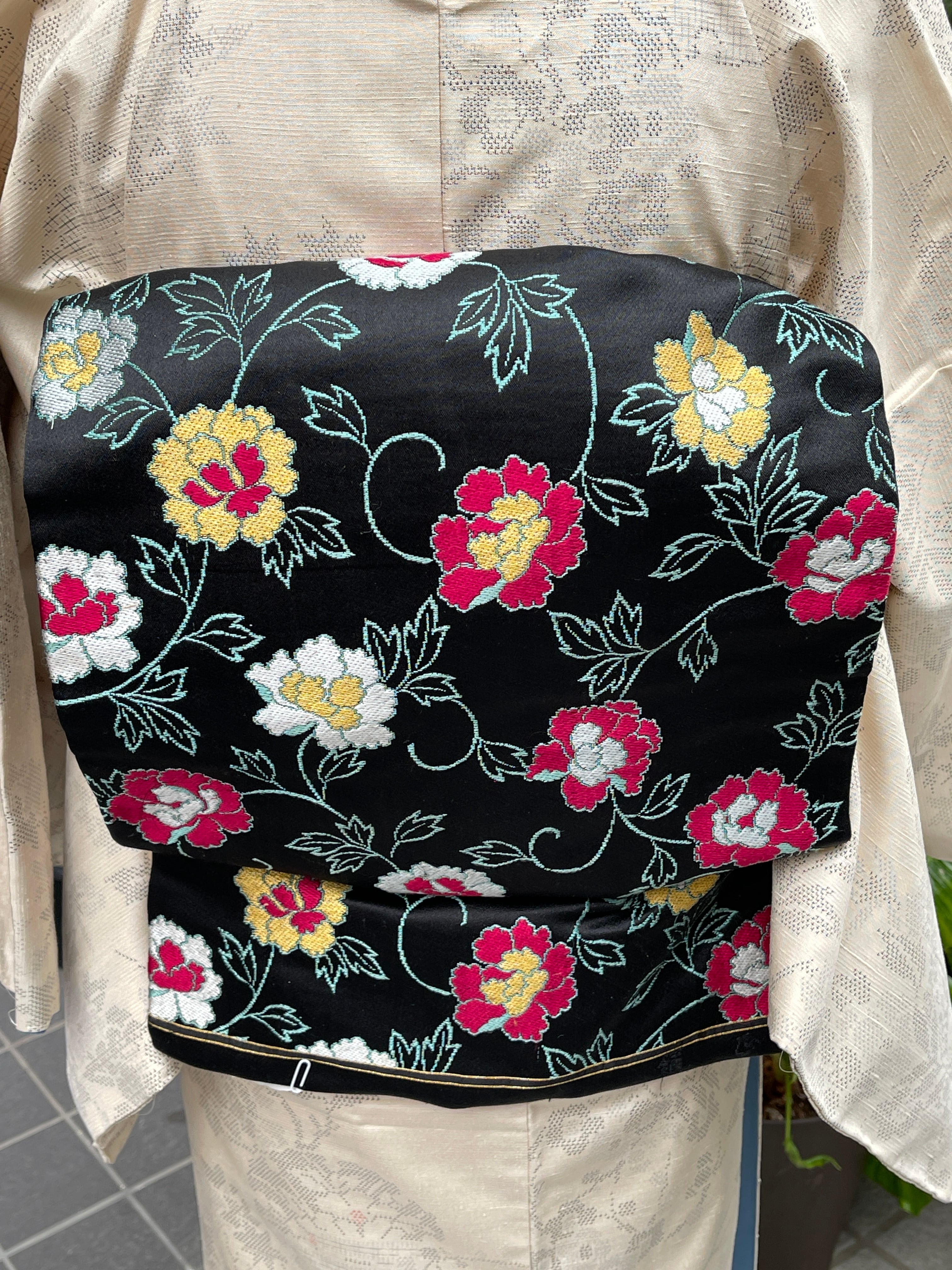 黒地に鮮やかな洋花が織り込まれた九寸名古屋帯になります。