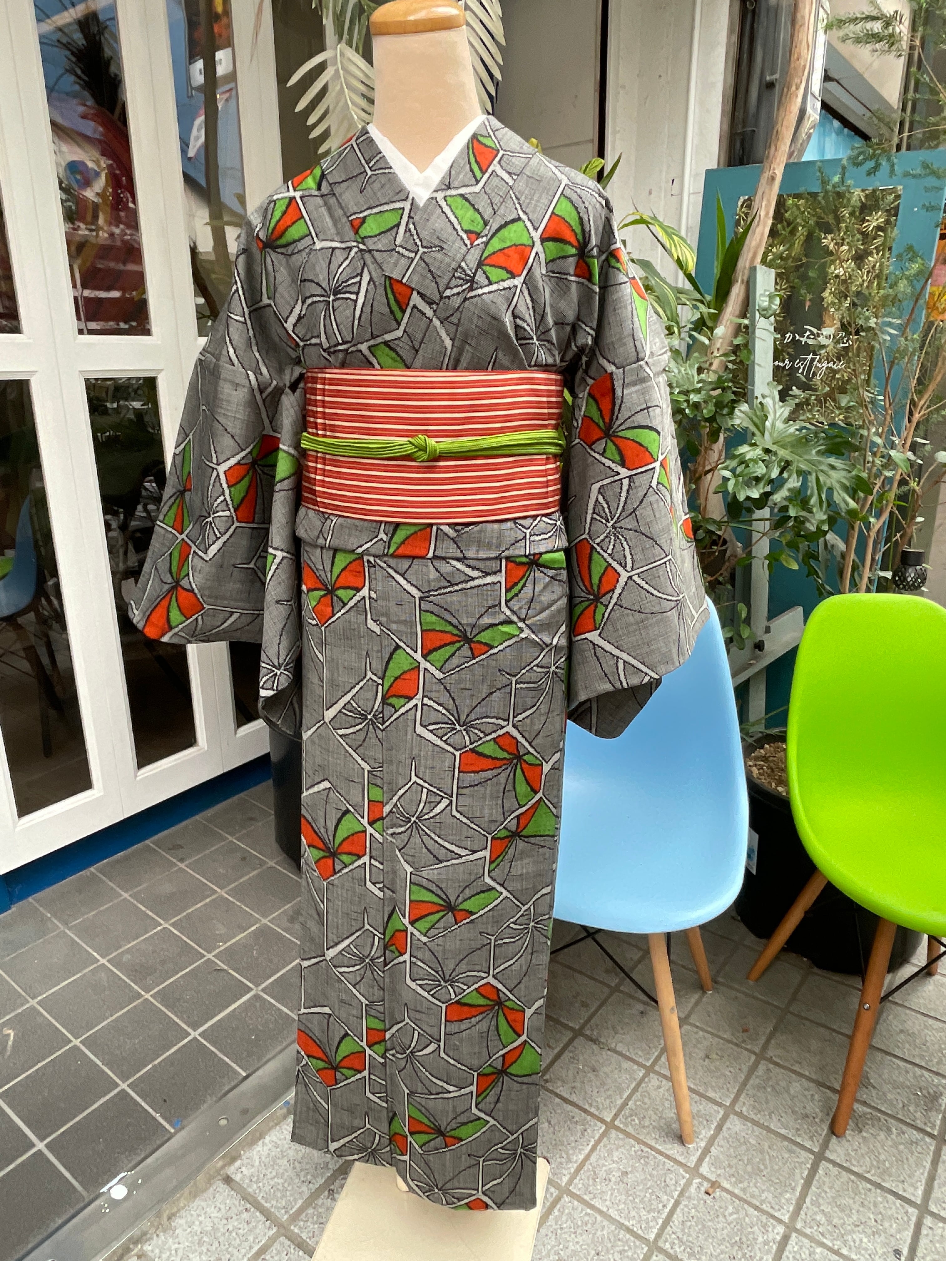 ウール着物 洗える着物 グレー系 亀甲 蝶々 カジュアル 普段着 日常着