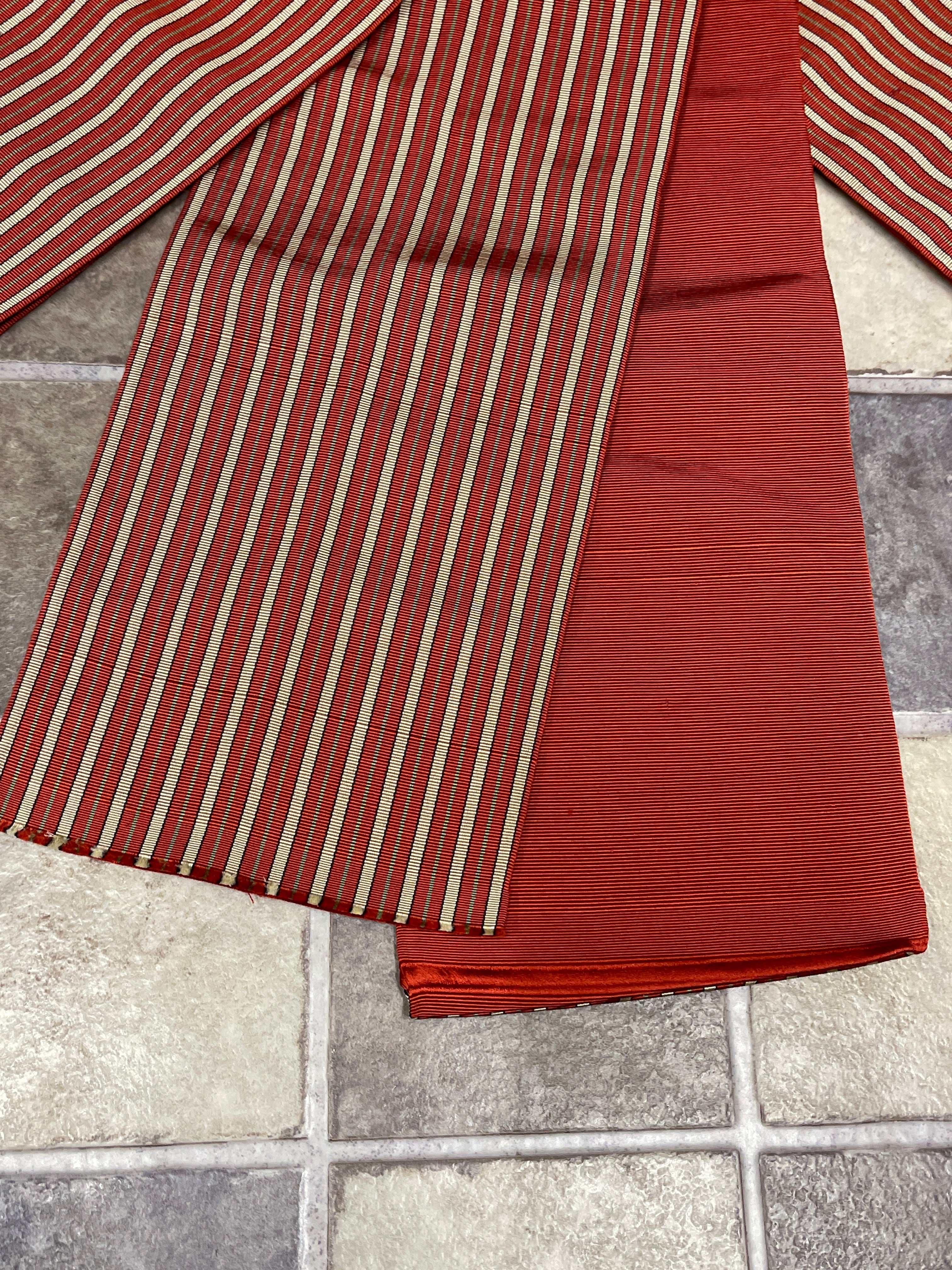 半幅帯 正絹 縞 オレンジ系 カジュアル 日常着 普段着 浴衣 小紋 紬