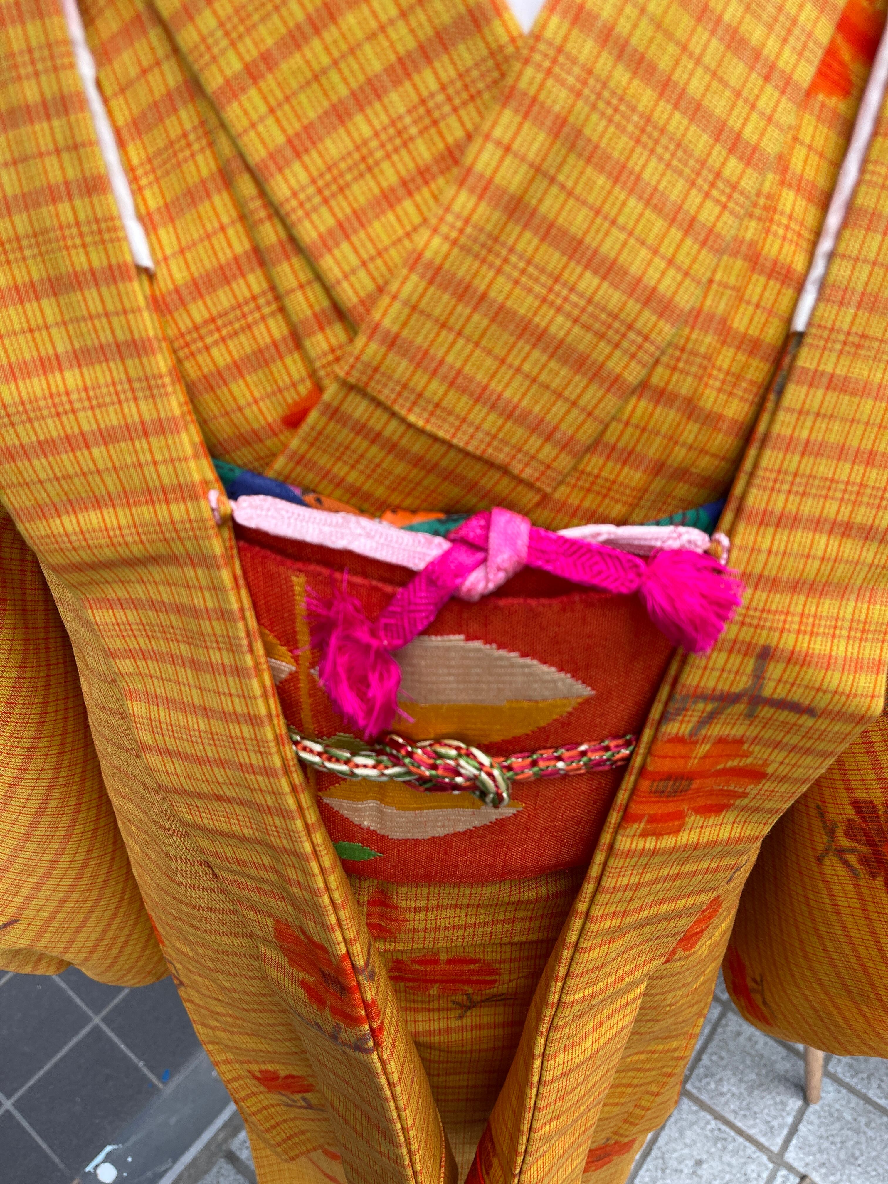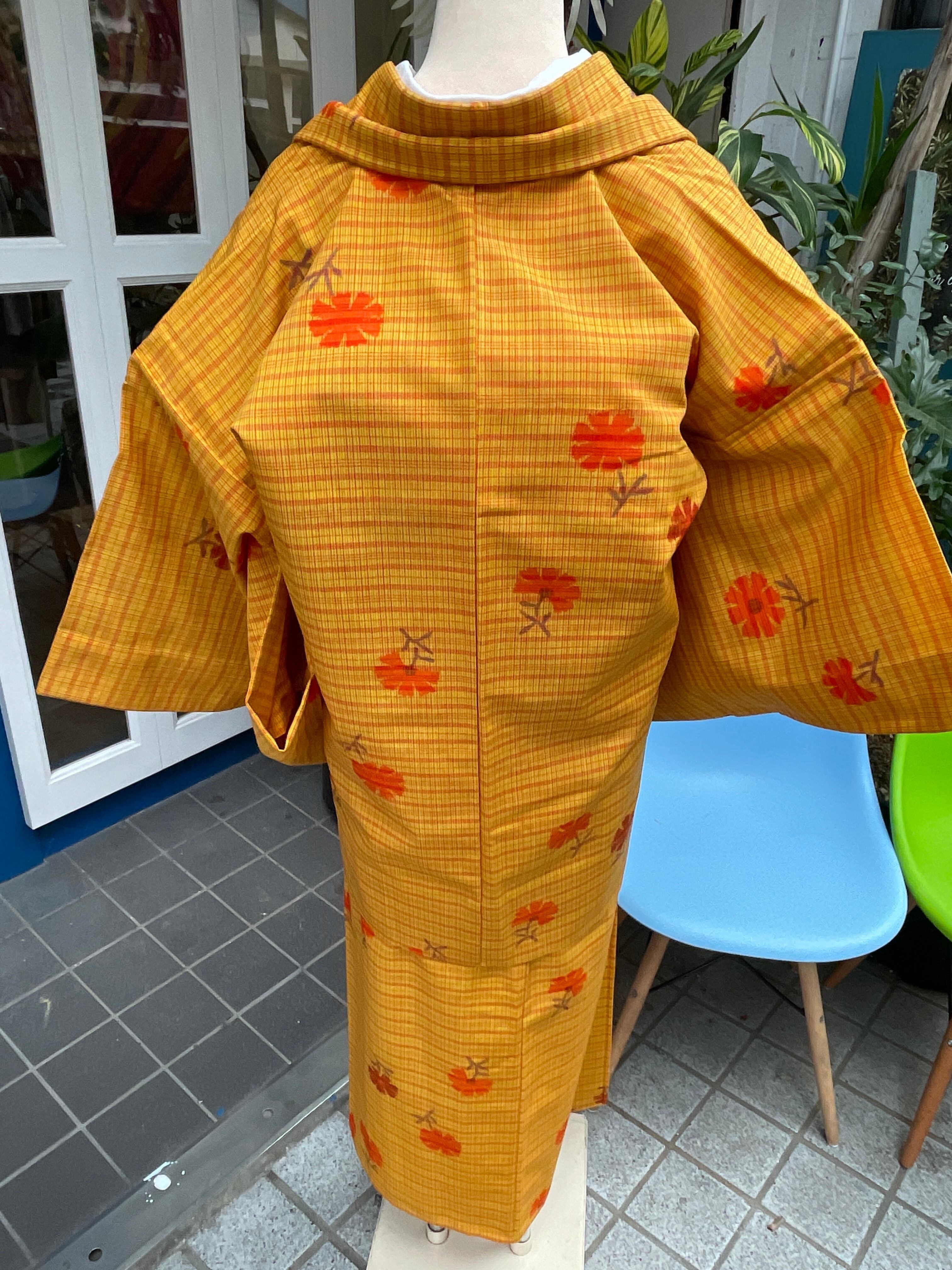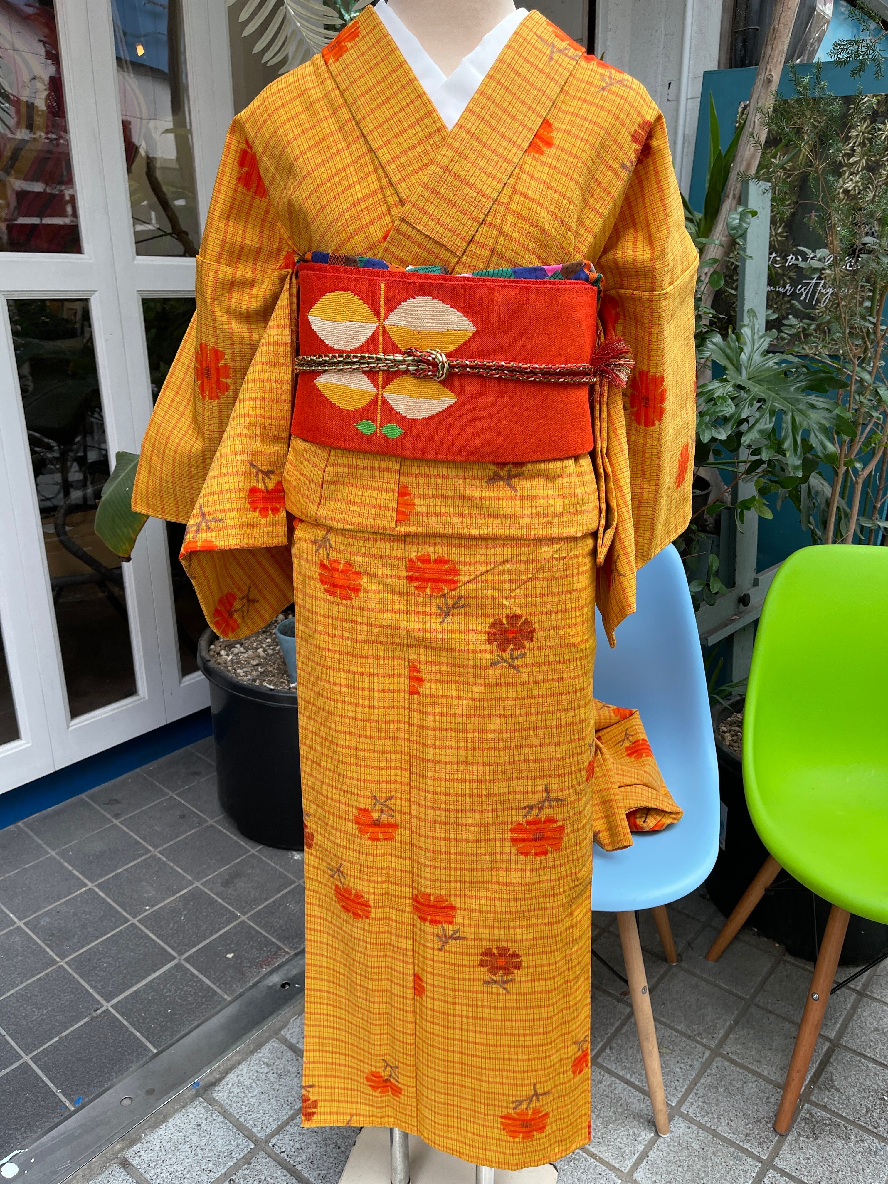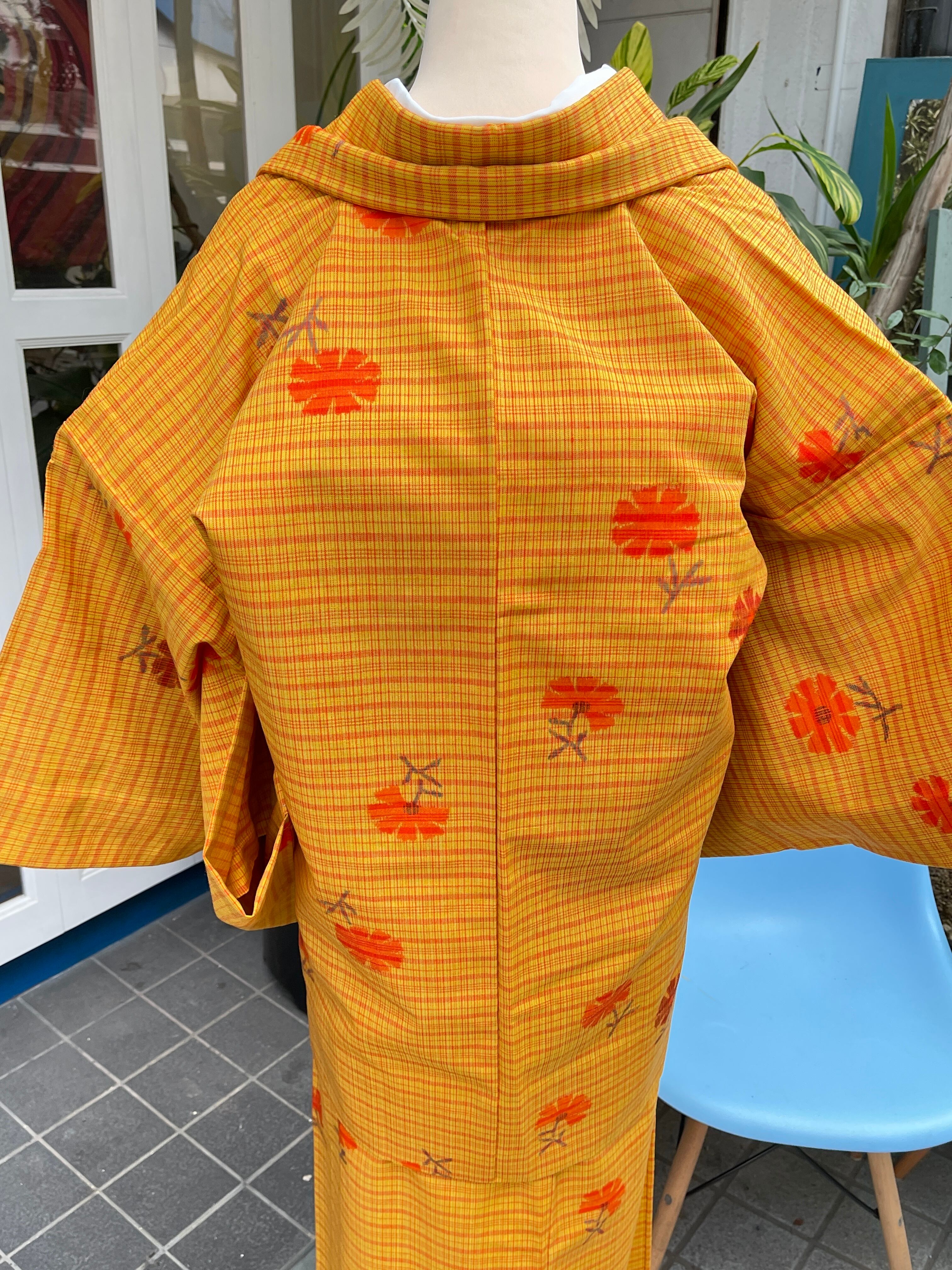 ウール着物 洗える着物 アンサンブル 黄色系 格子 小花 カジュアル 日常着 普段着 昭和レトロ