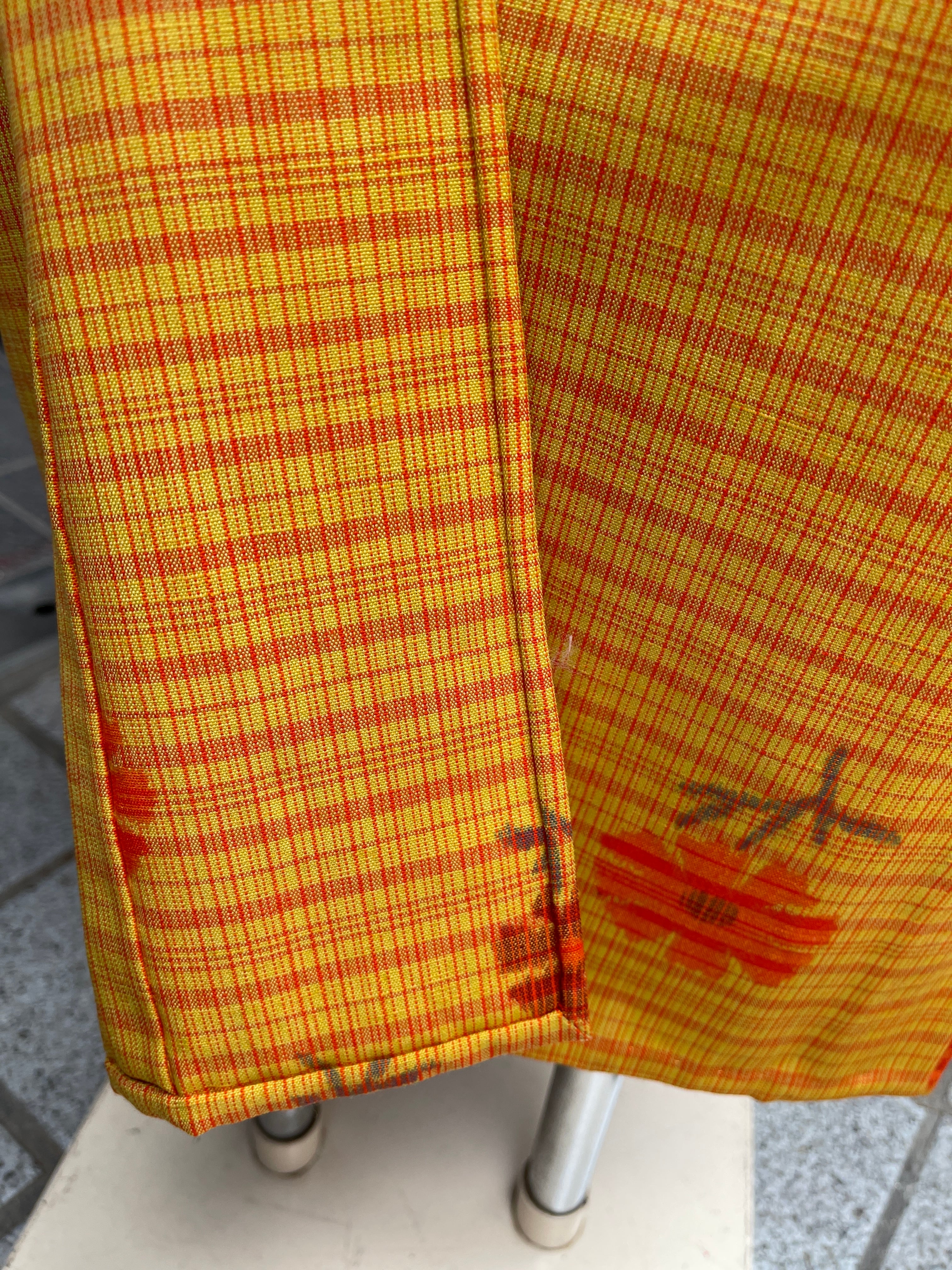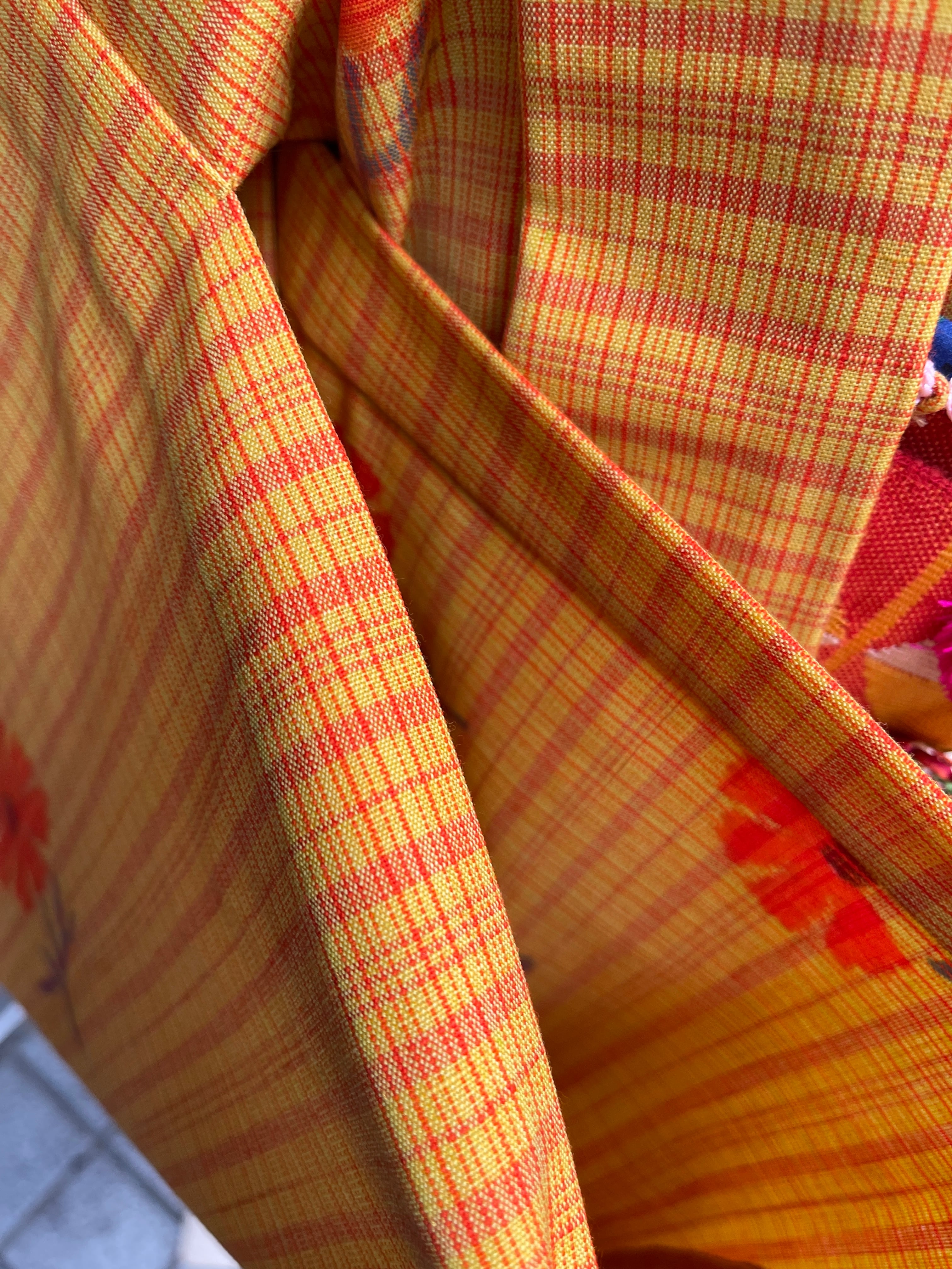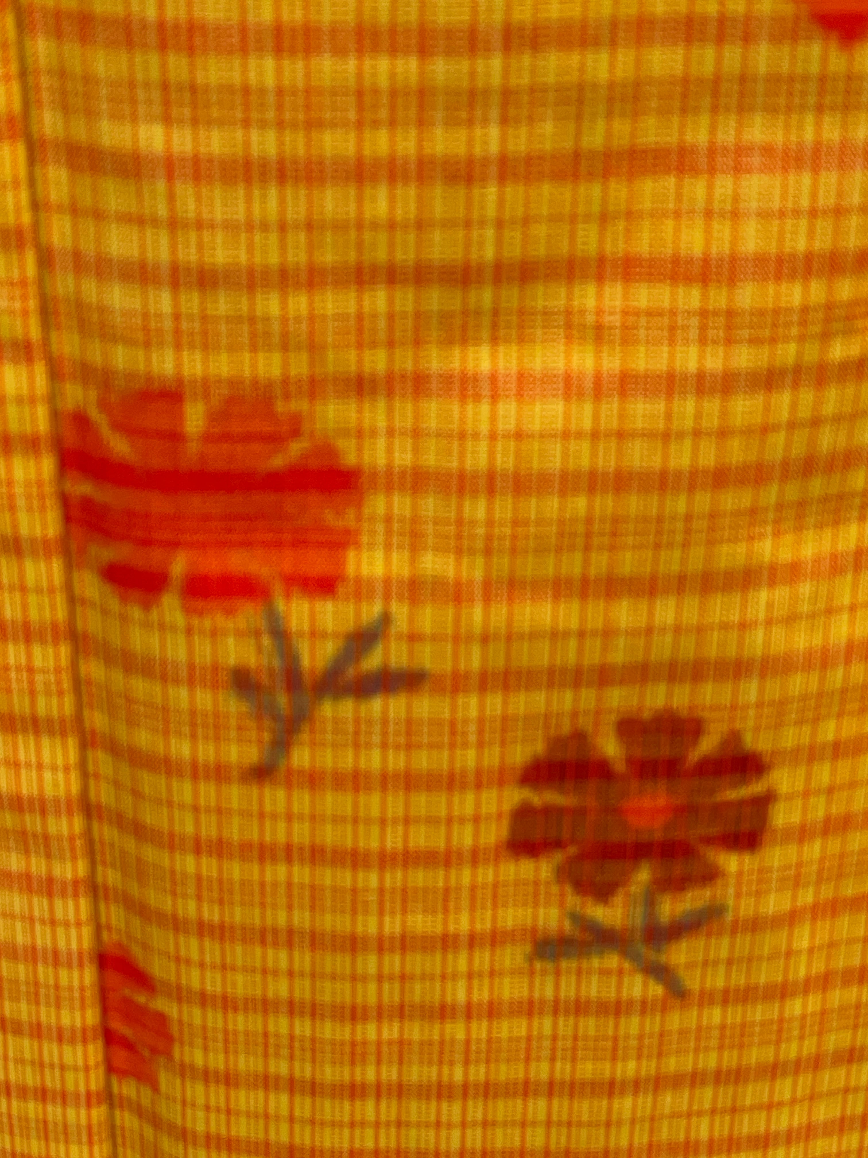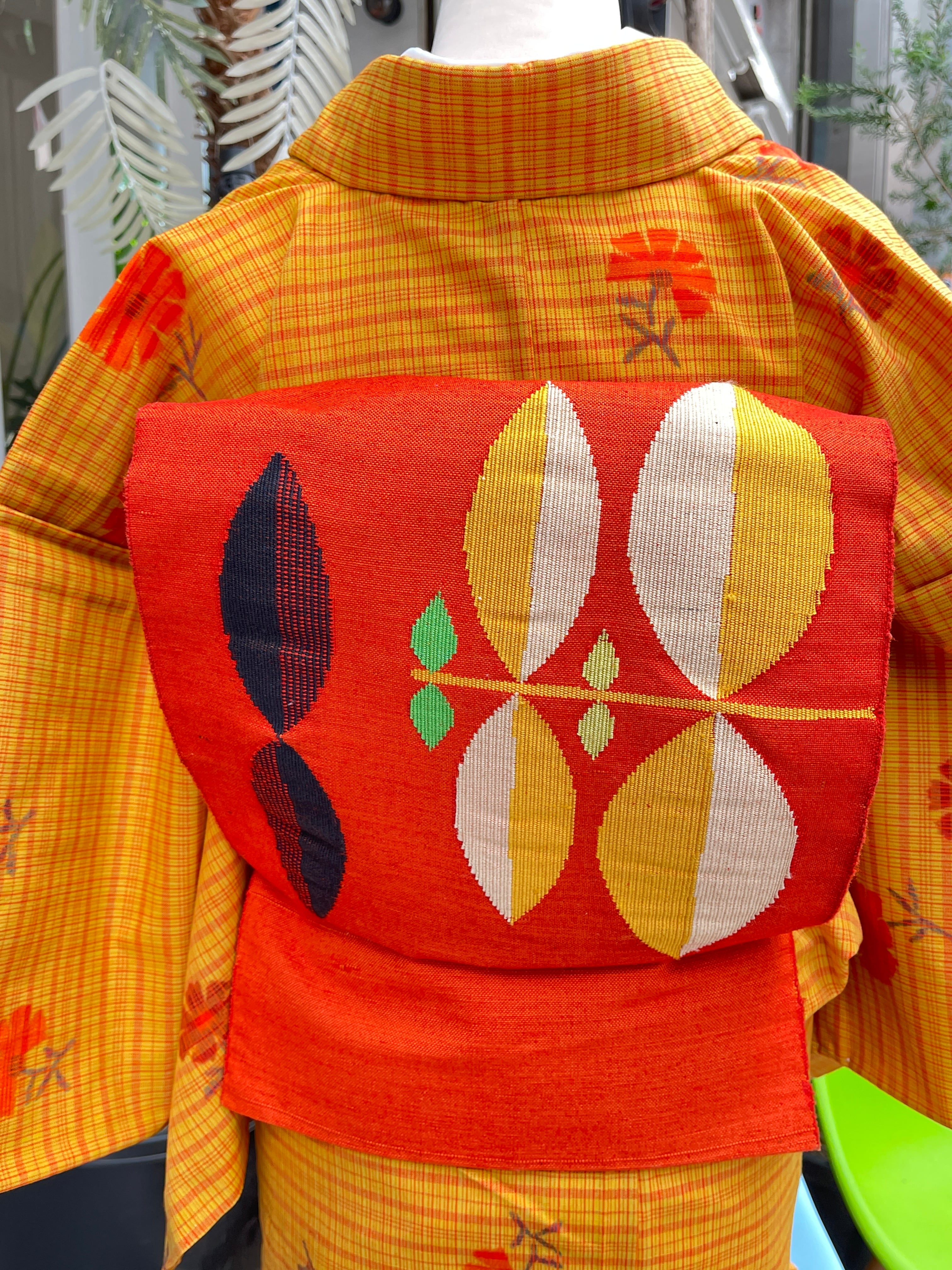からし色にオレンジ色のお花と格子、昭和レトロな色柄ですね