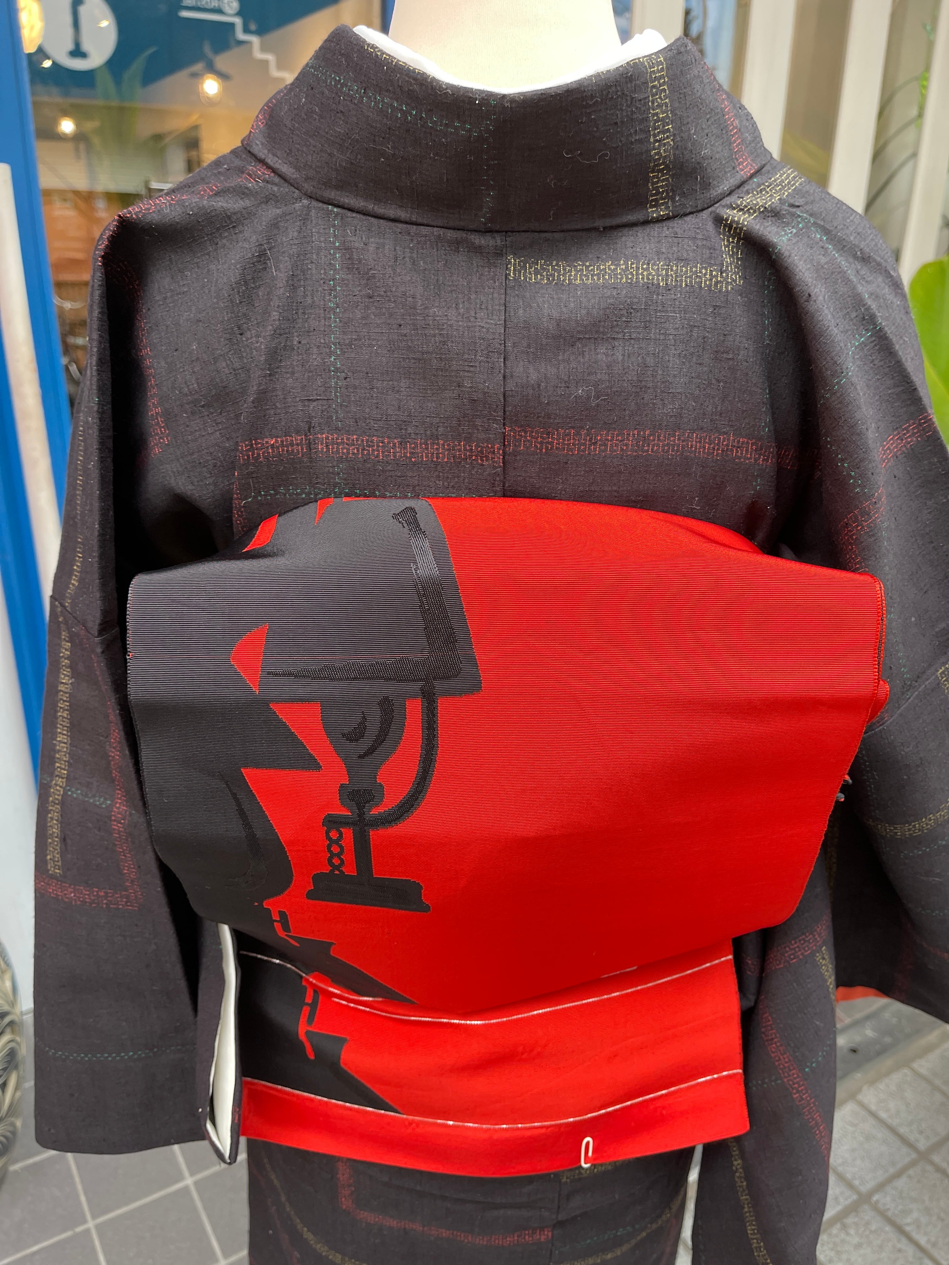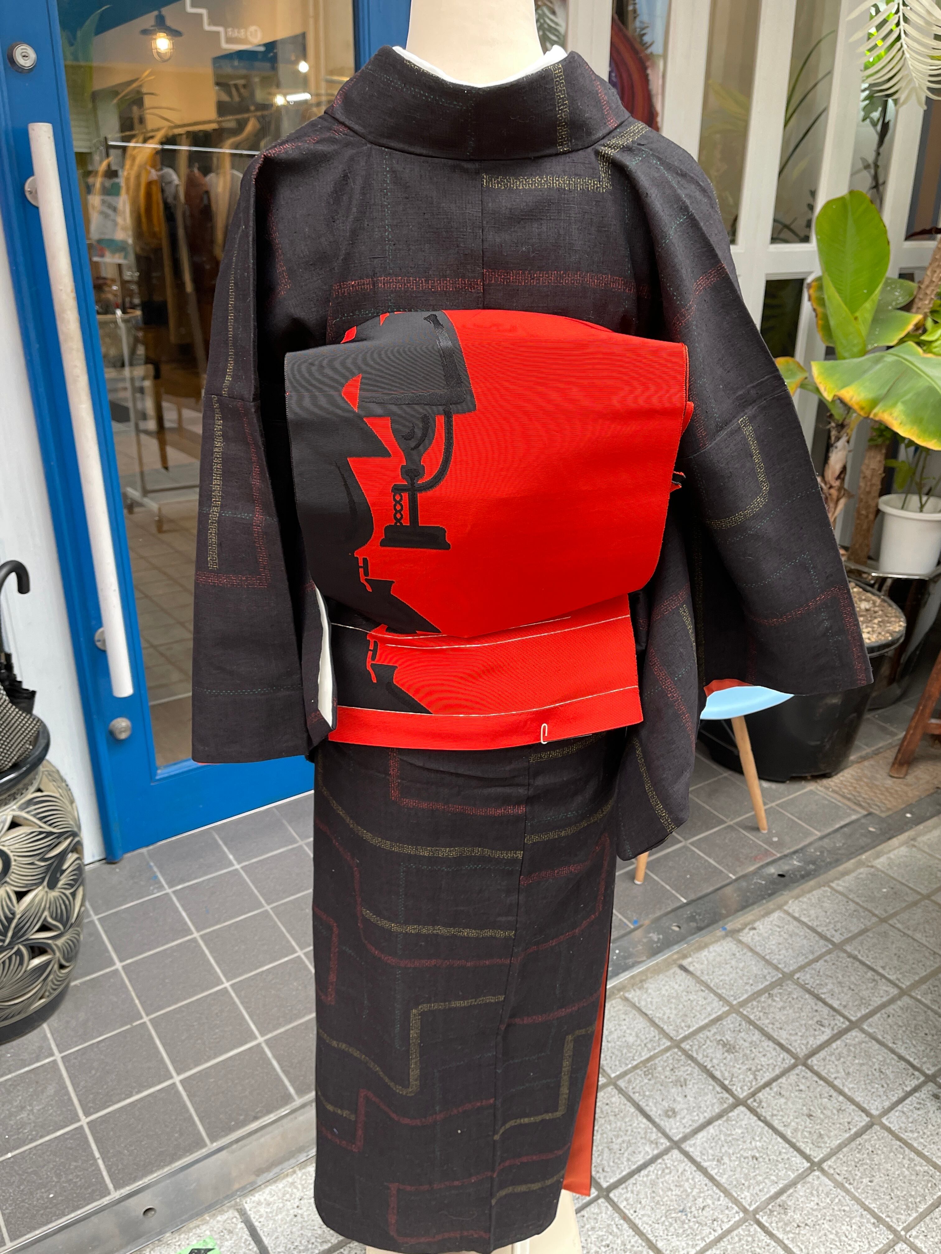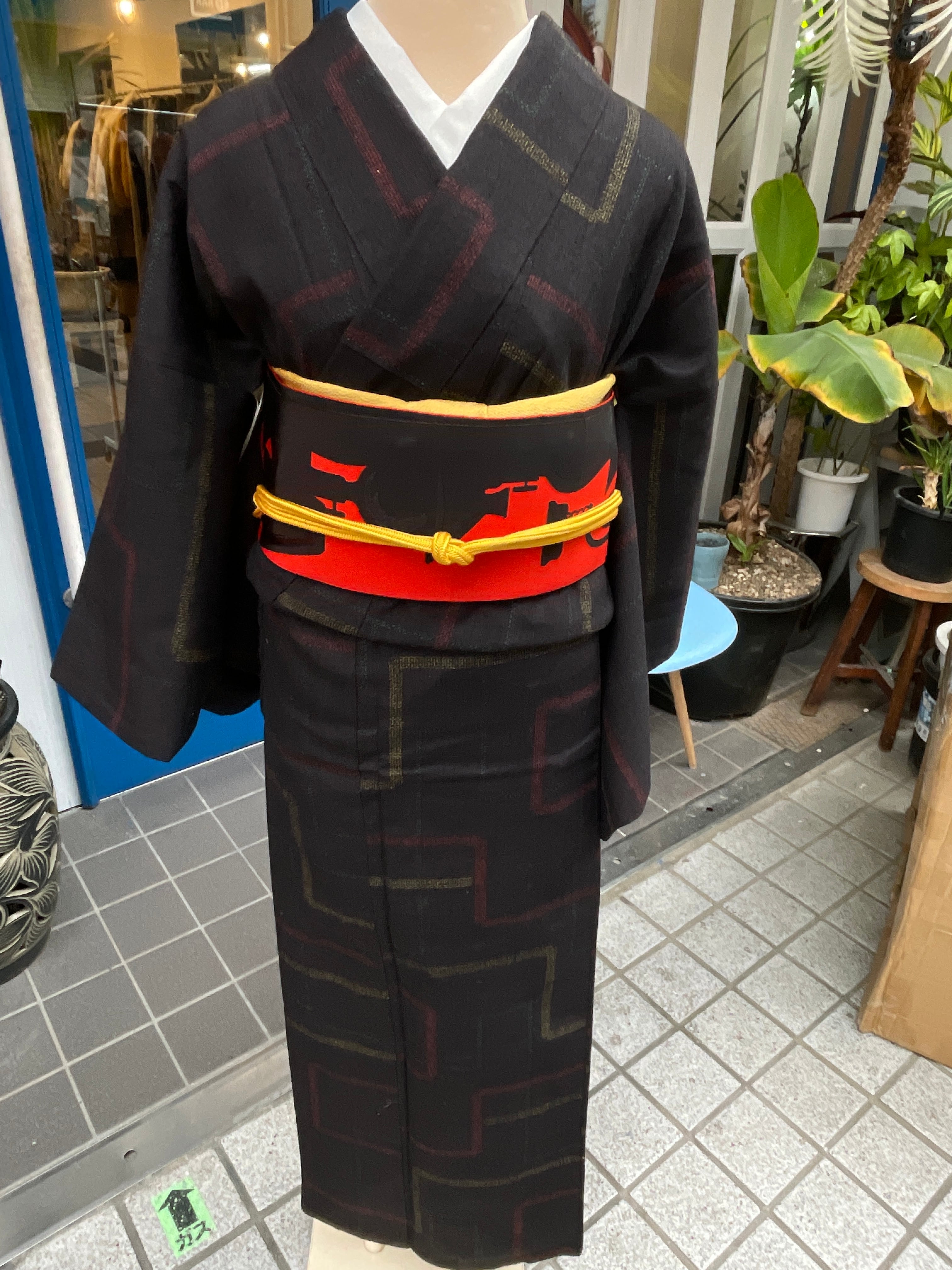 紬 結城紬 証紙あり 黒系 モダン柄 カジュアル 普段着 日常着 お稽古