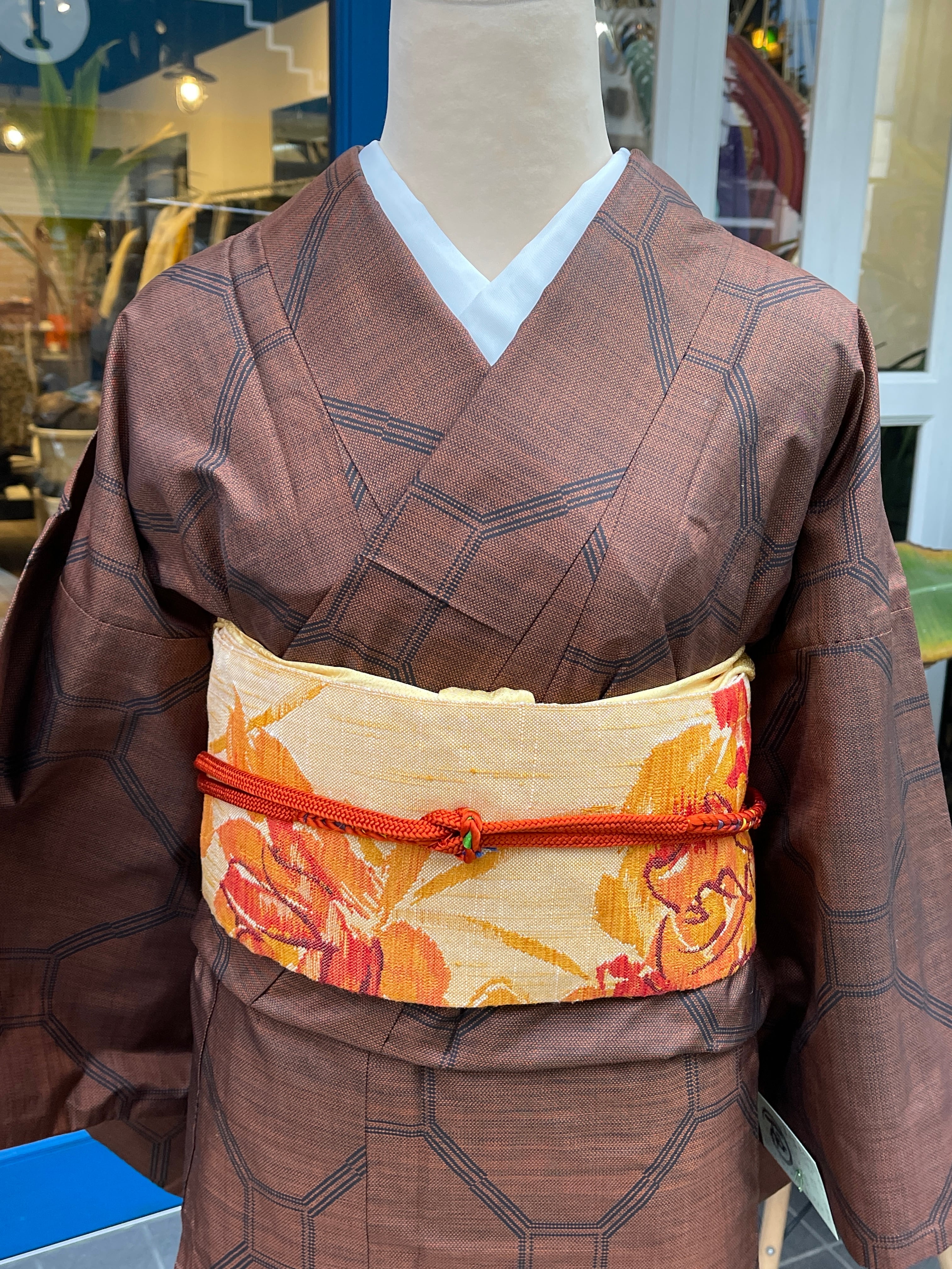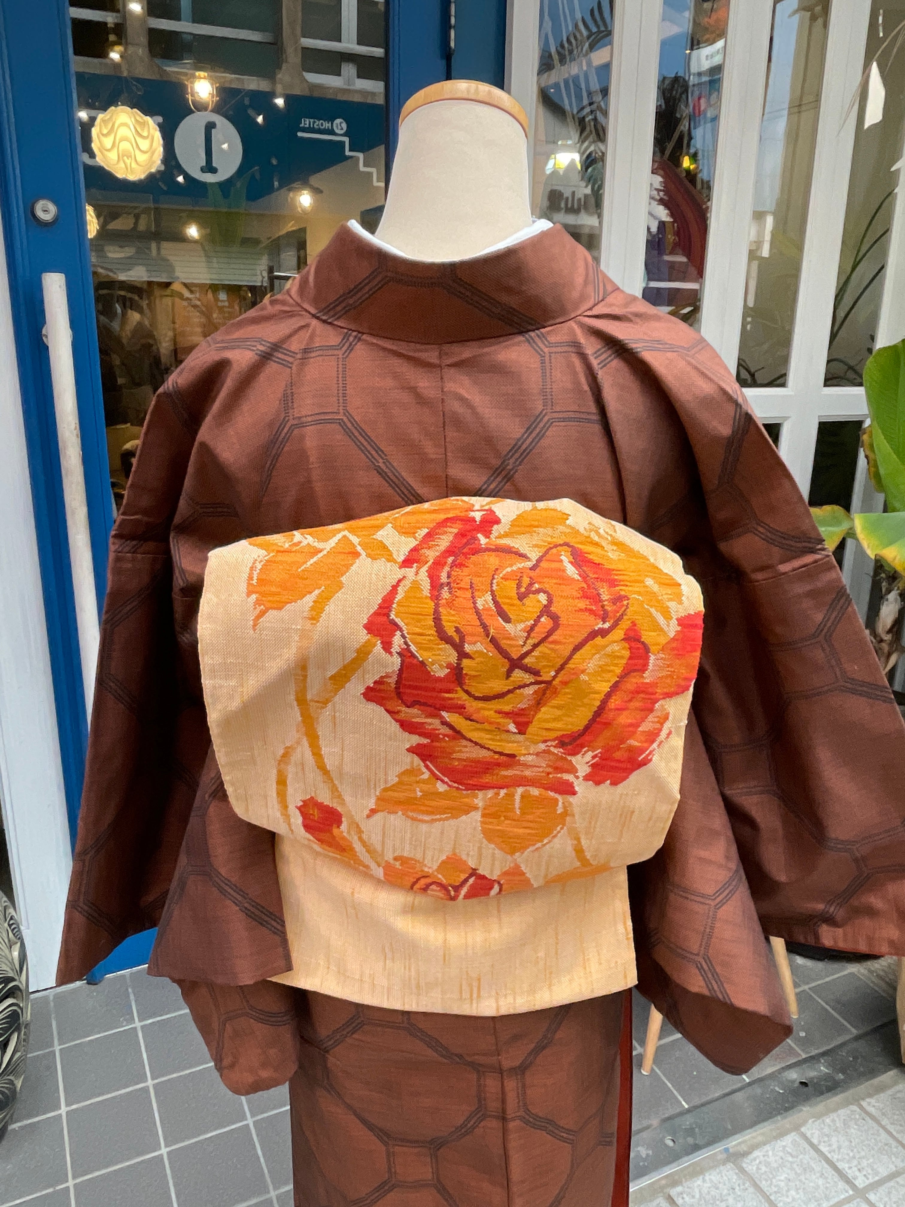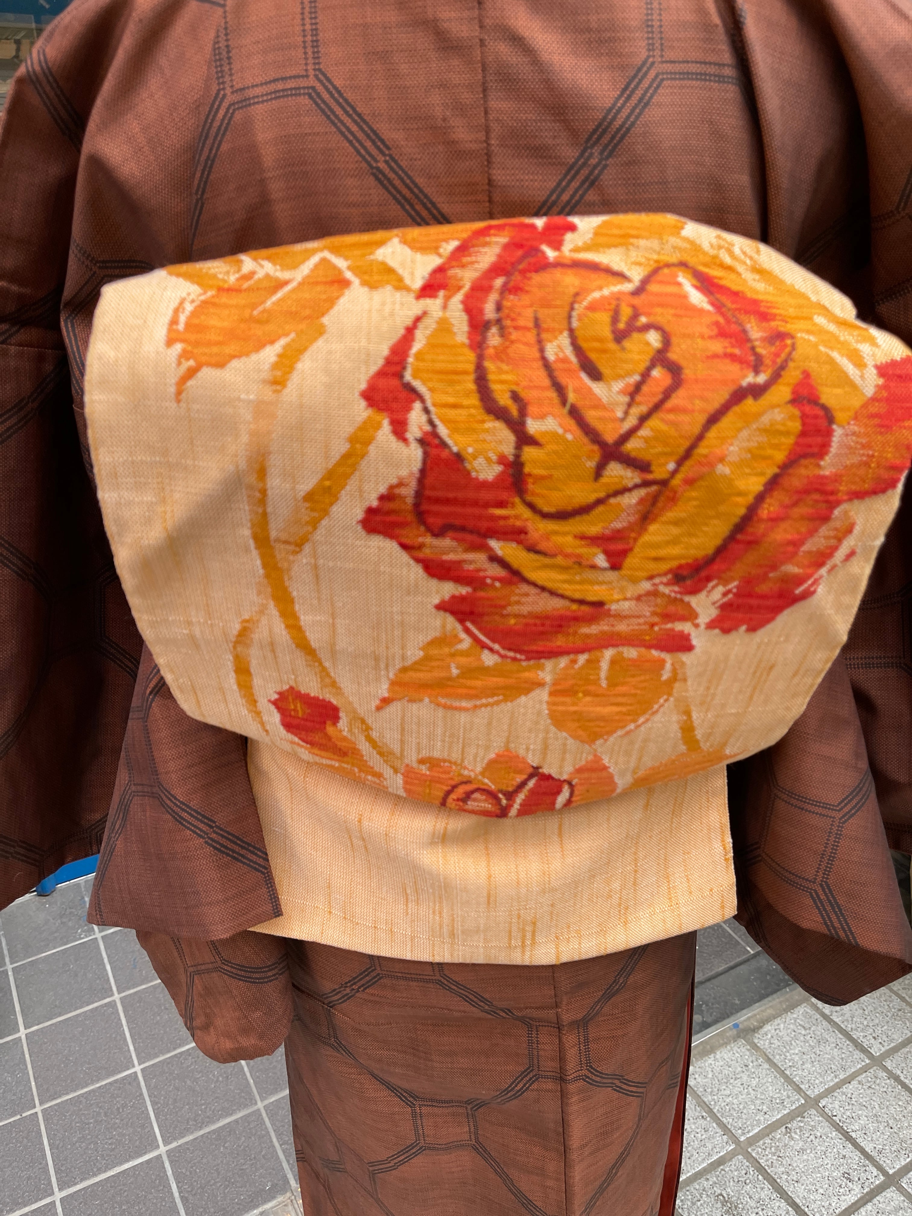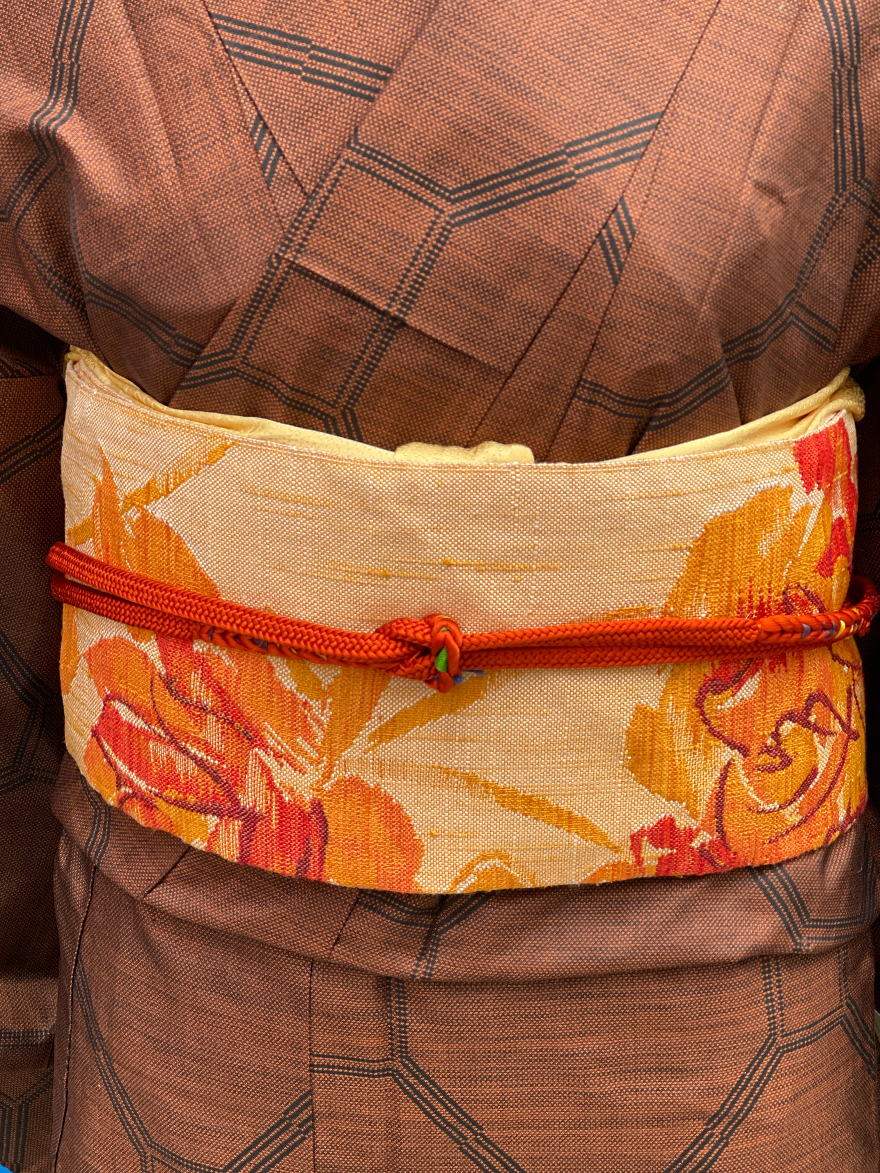 八寸名古屋帯 紬 オレンジ系 バラ カジュアル 普段着 日常着 お稽古