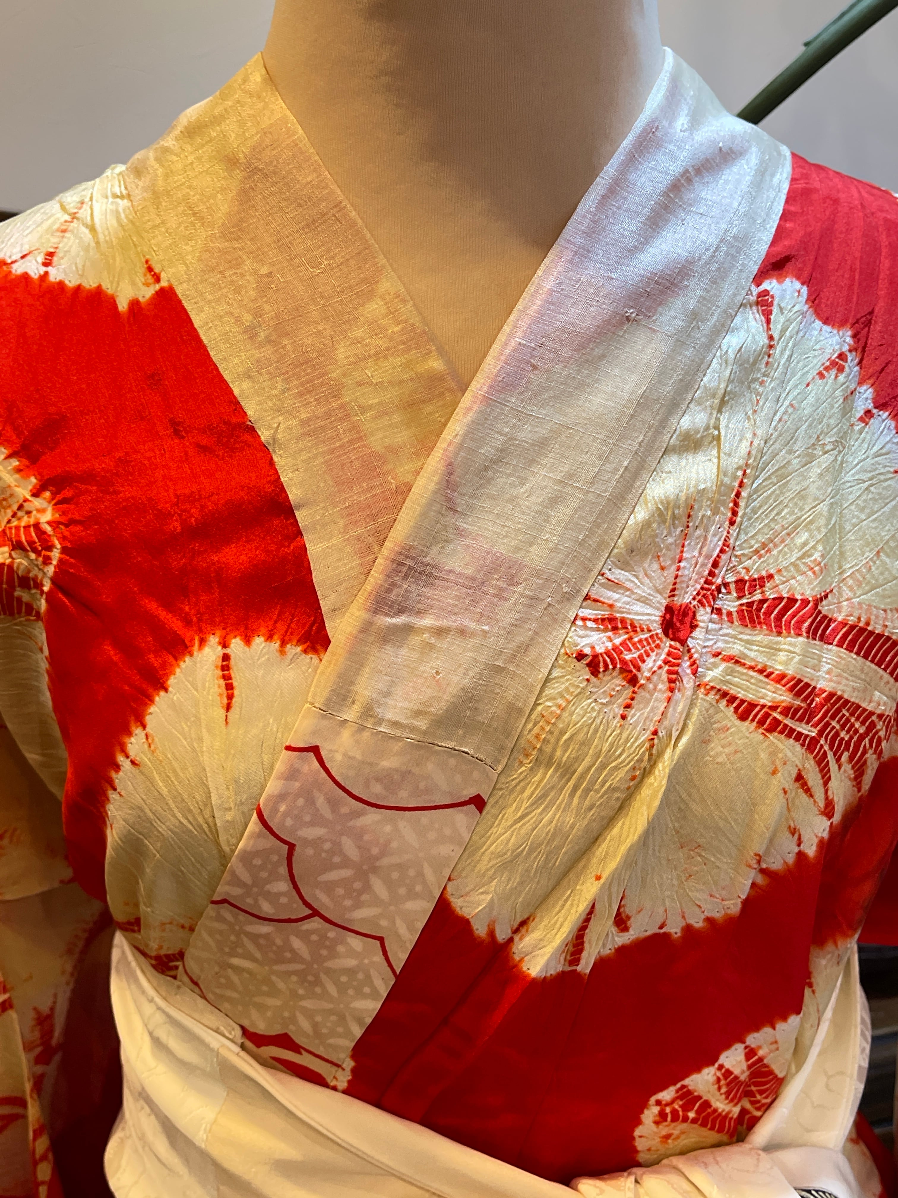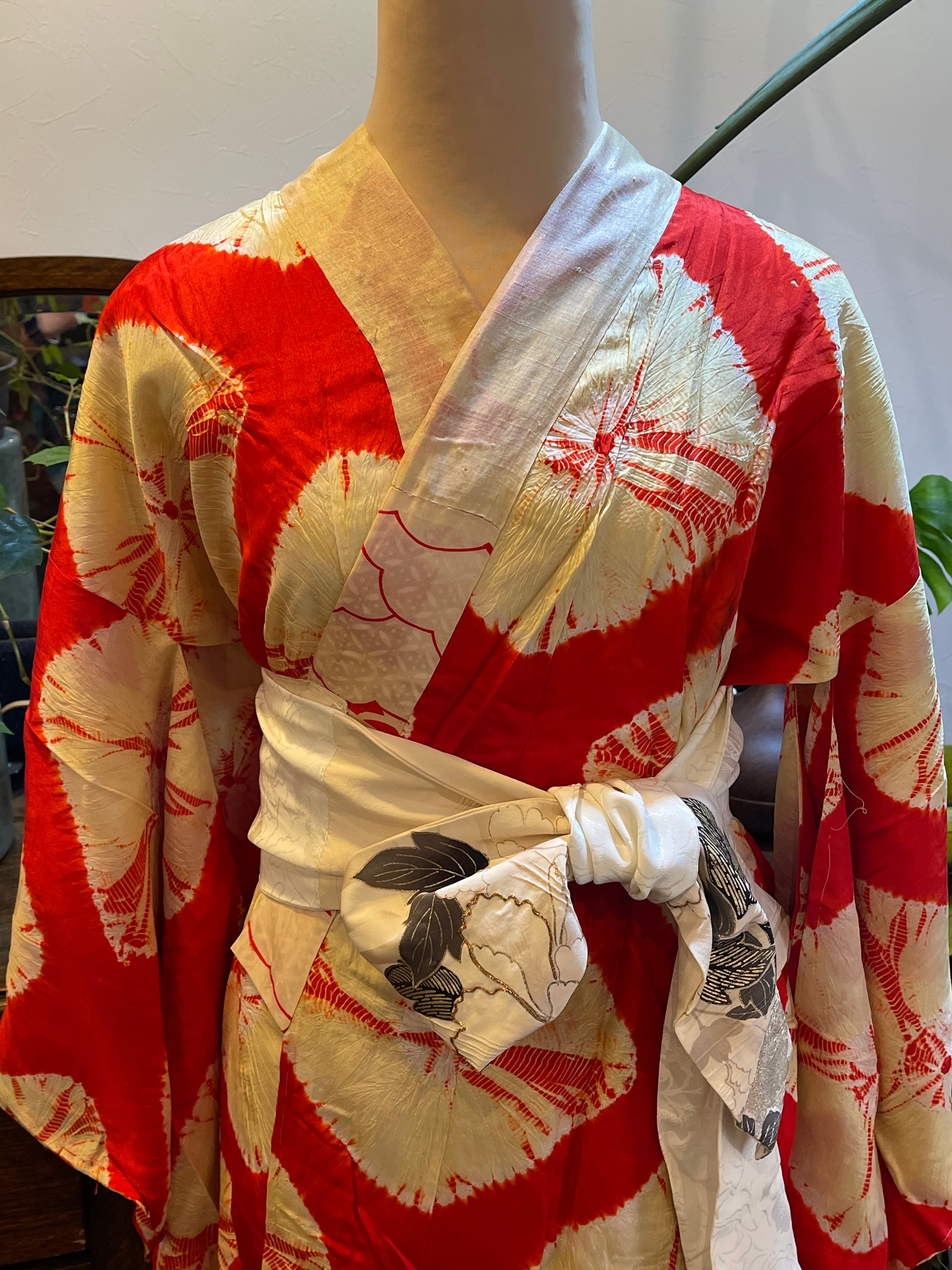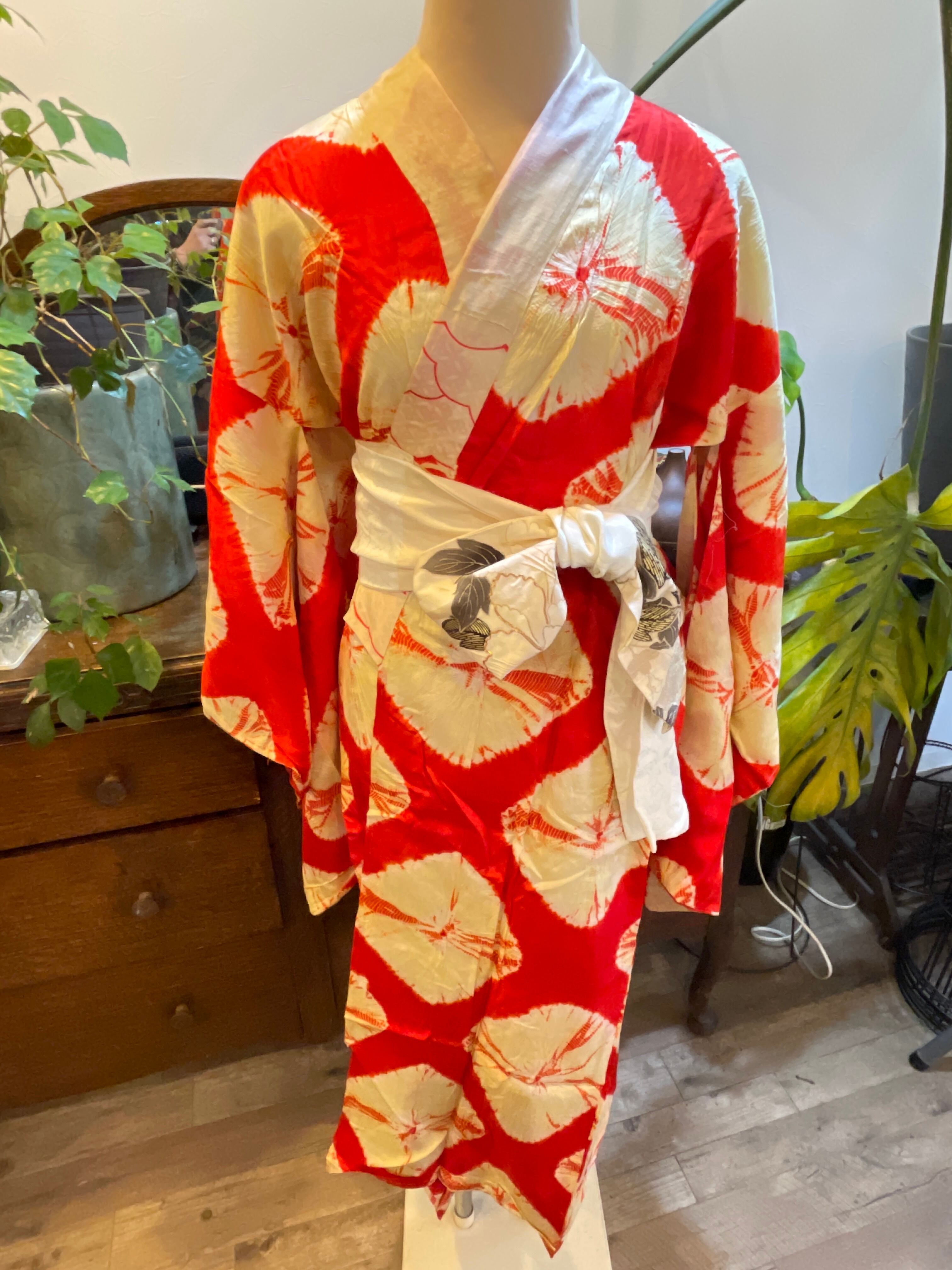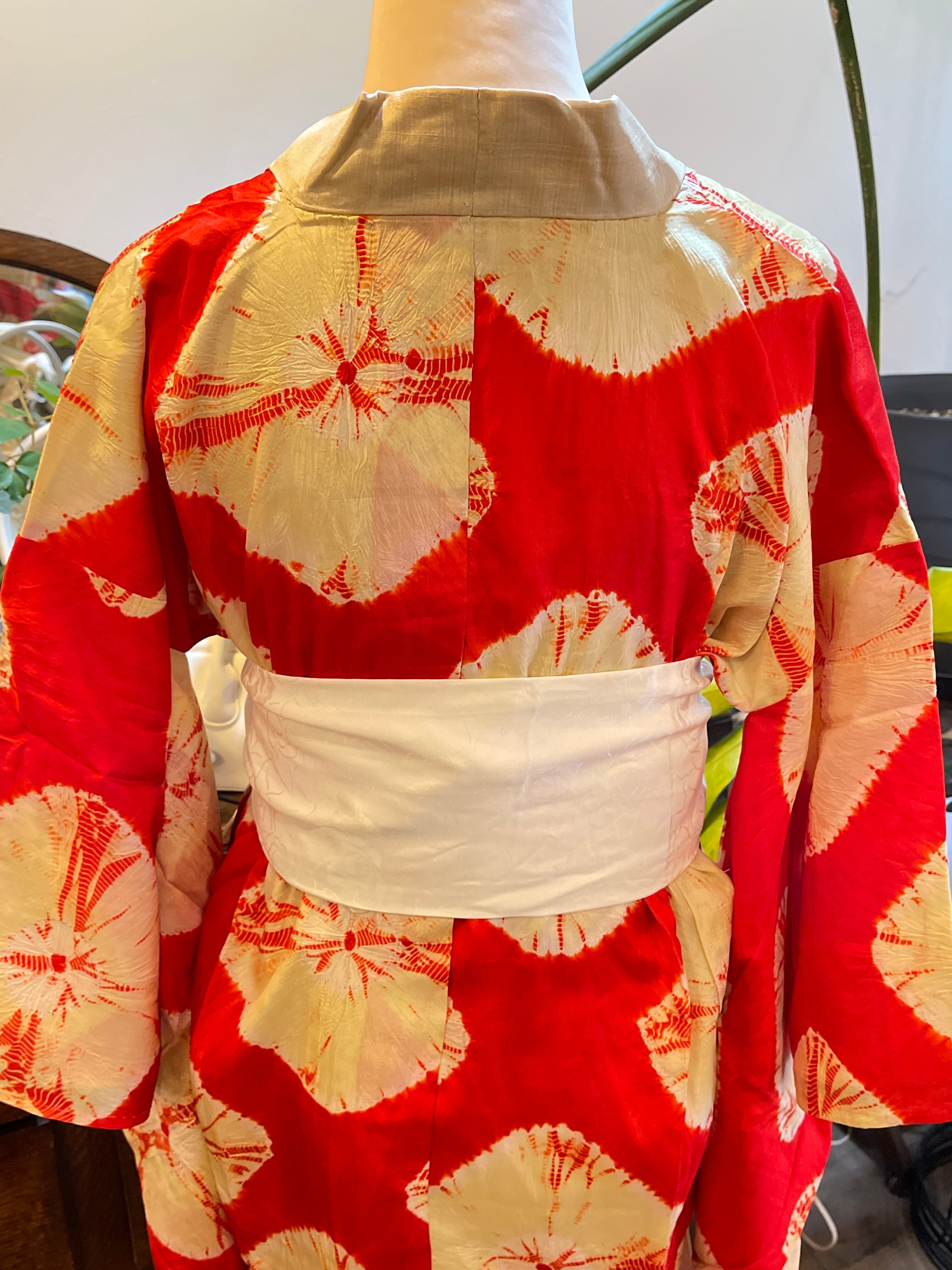 長襦袢 アンティーク長襦袢 朱赤 絞り柄 袷仕立て 部屋着 ガウン