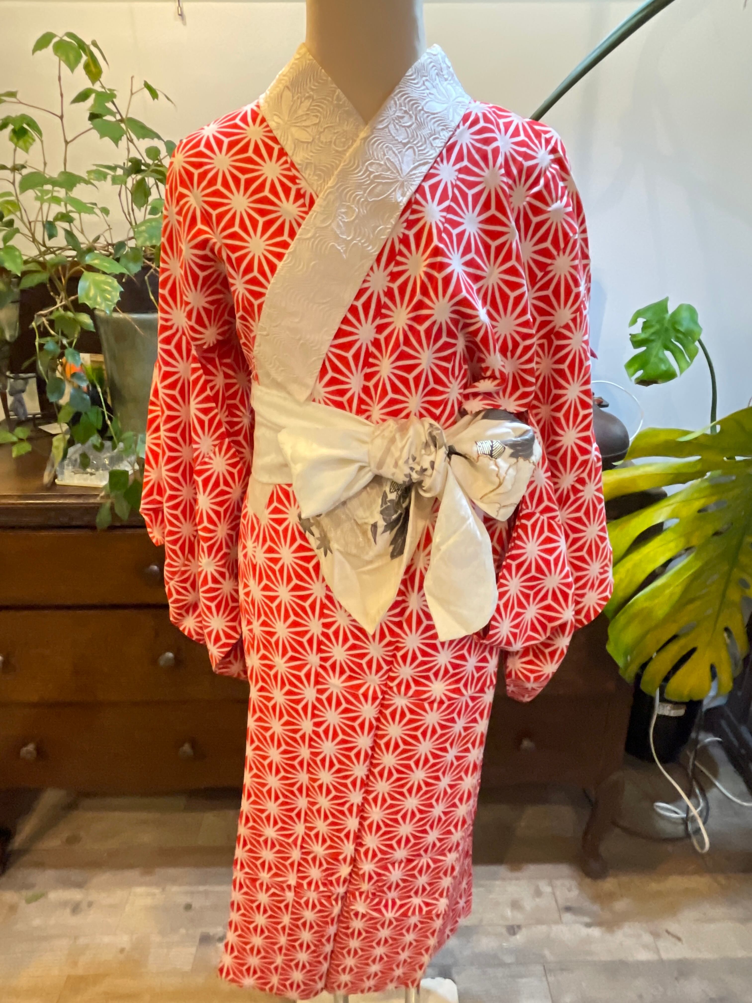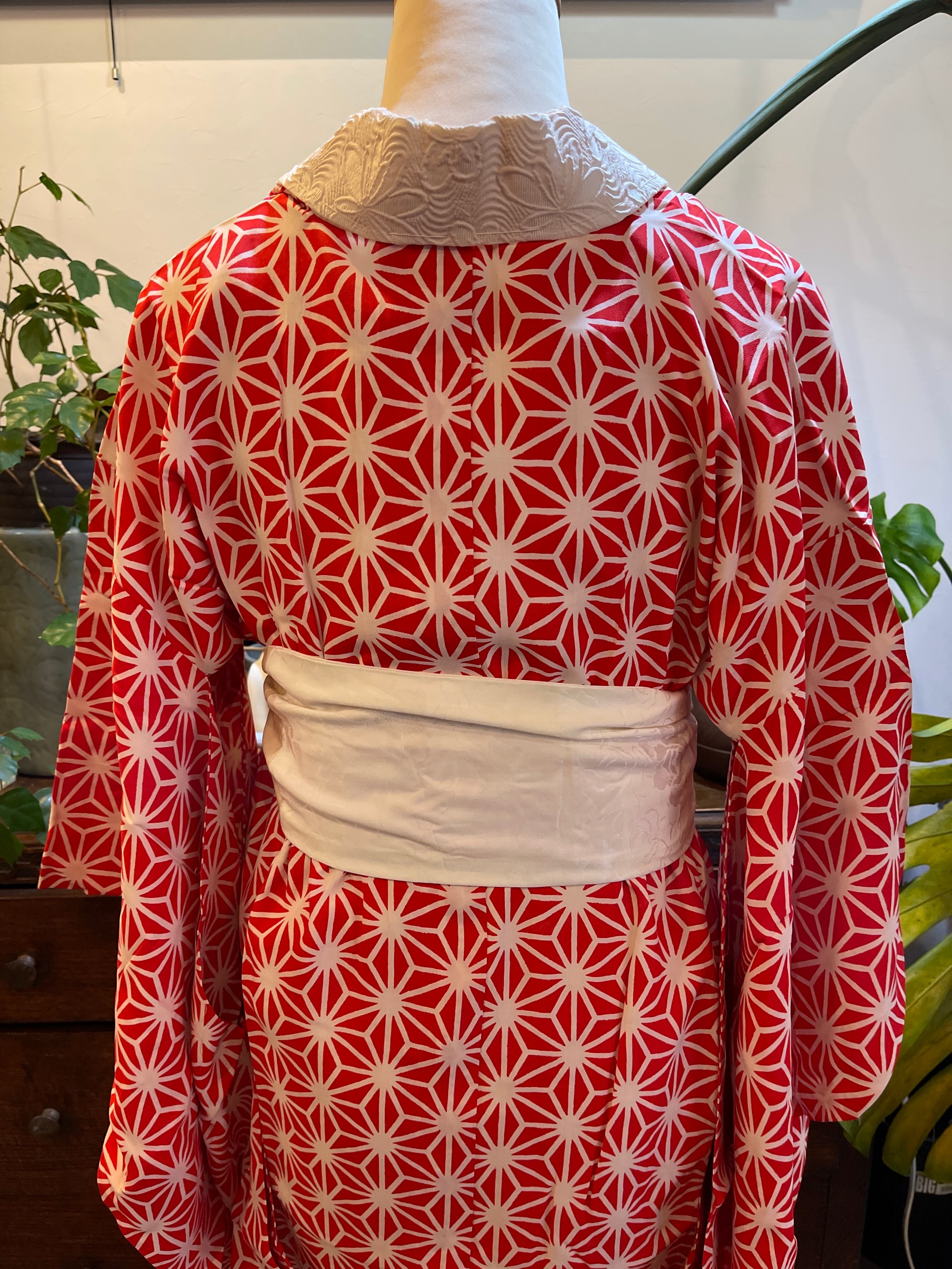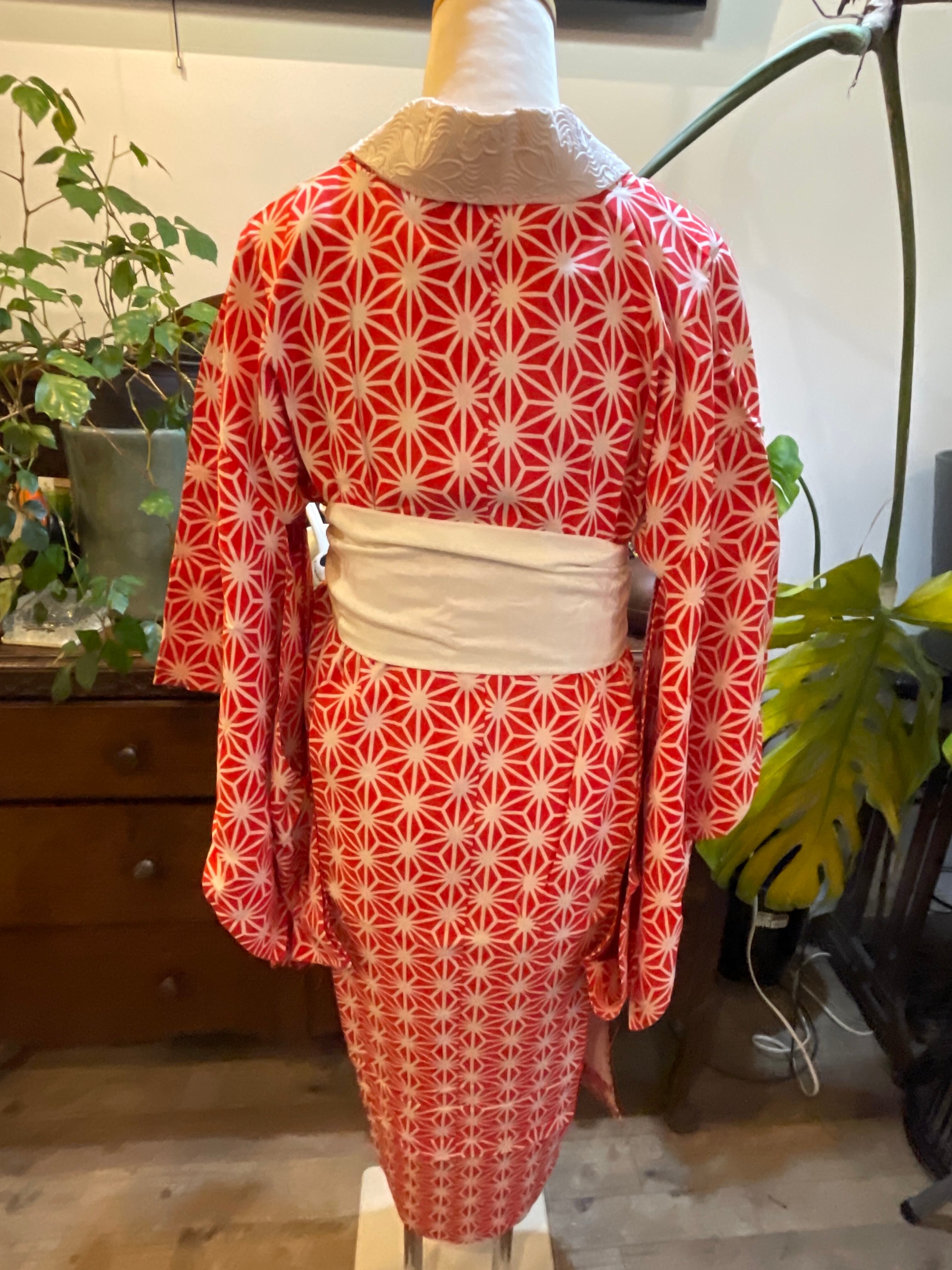 赤系の麻の葉柄が印象的なアンティーク長襦袢です 麻の葉には魔除けの意味があります。