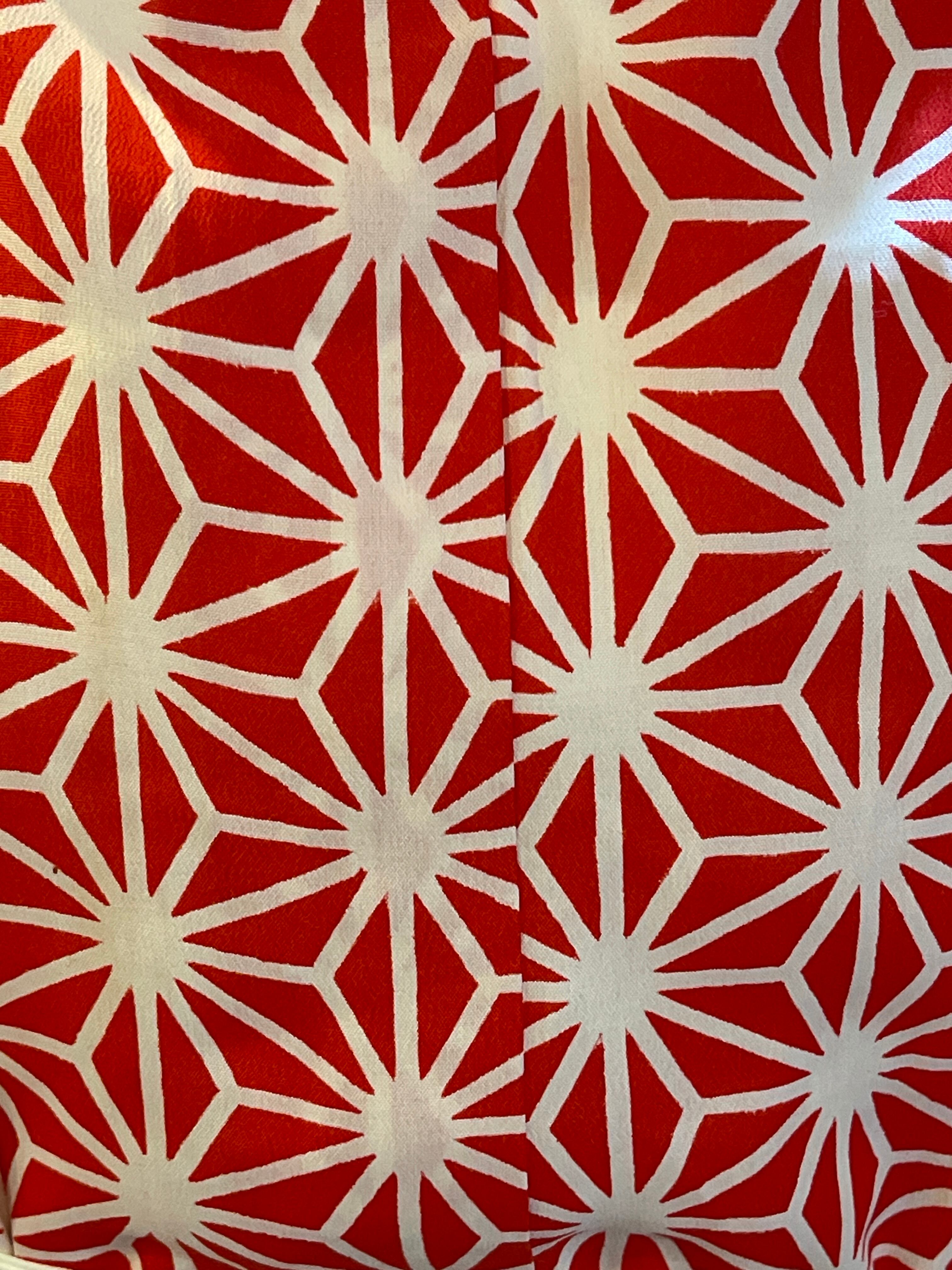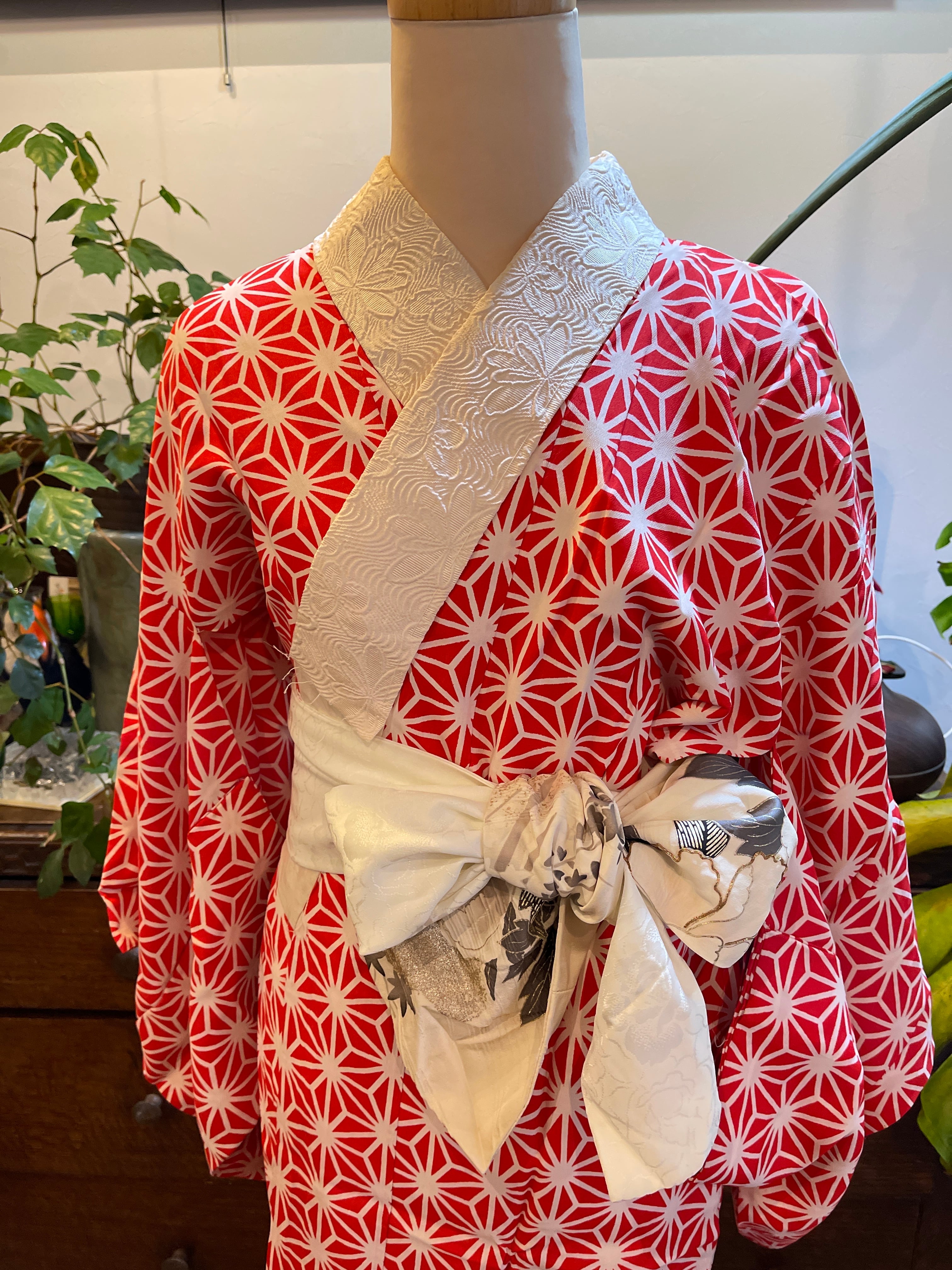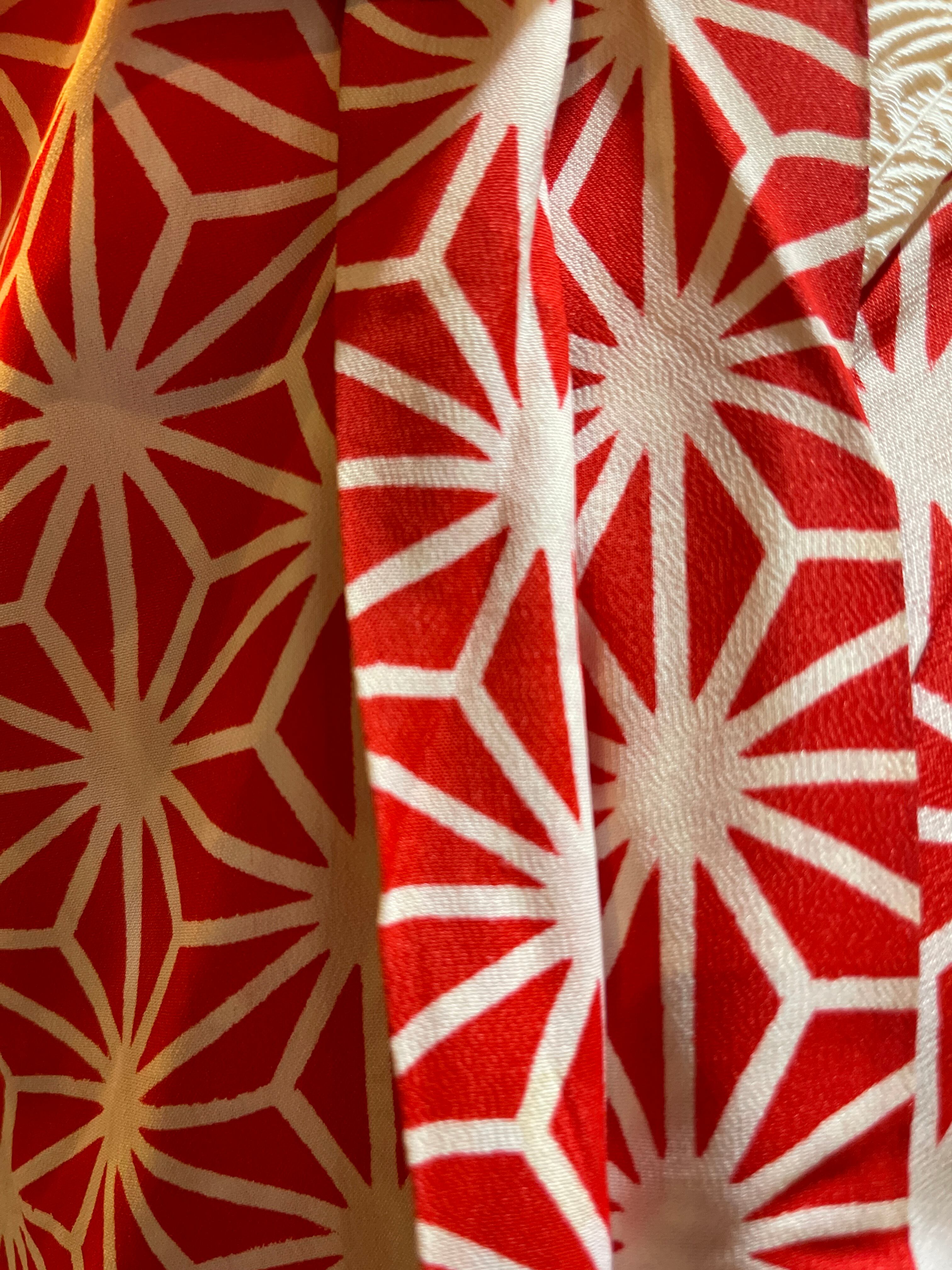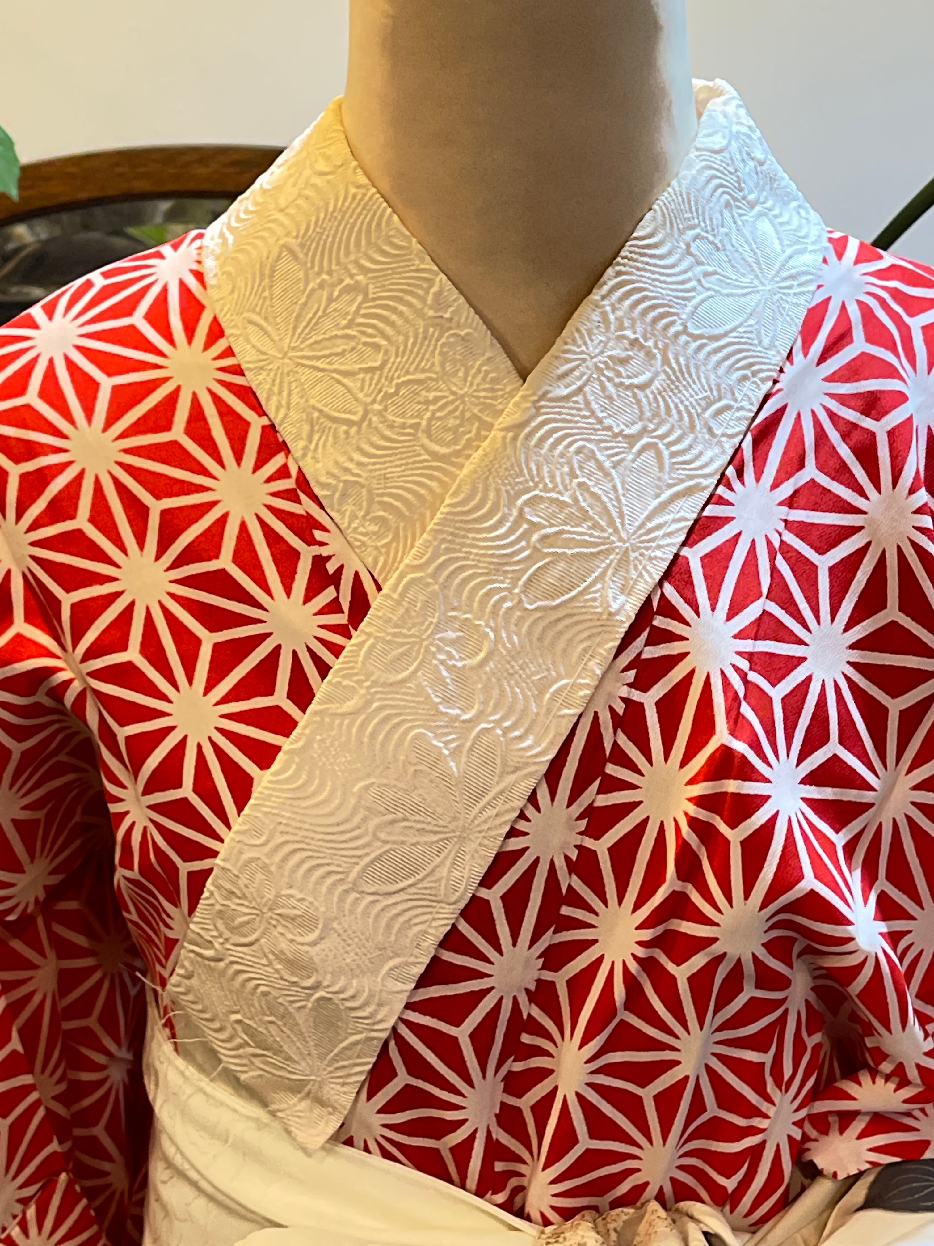 赤系の麻の葉柄が印象的なアンティーク長襦袢です 麻の葉には魔除けの意味があります。