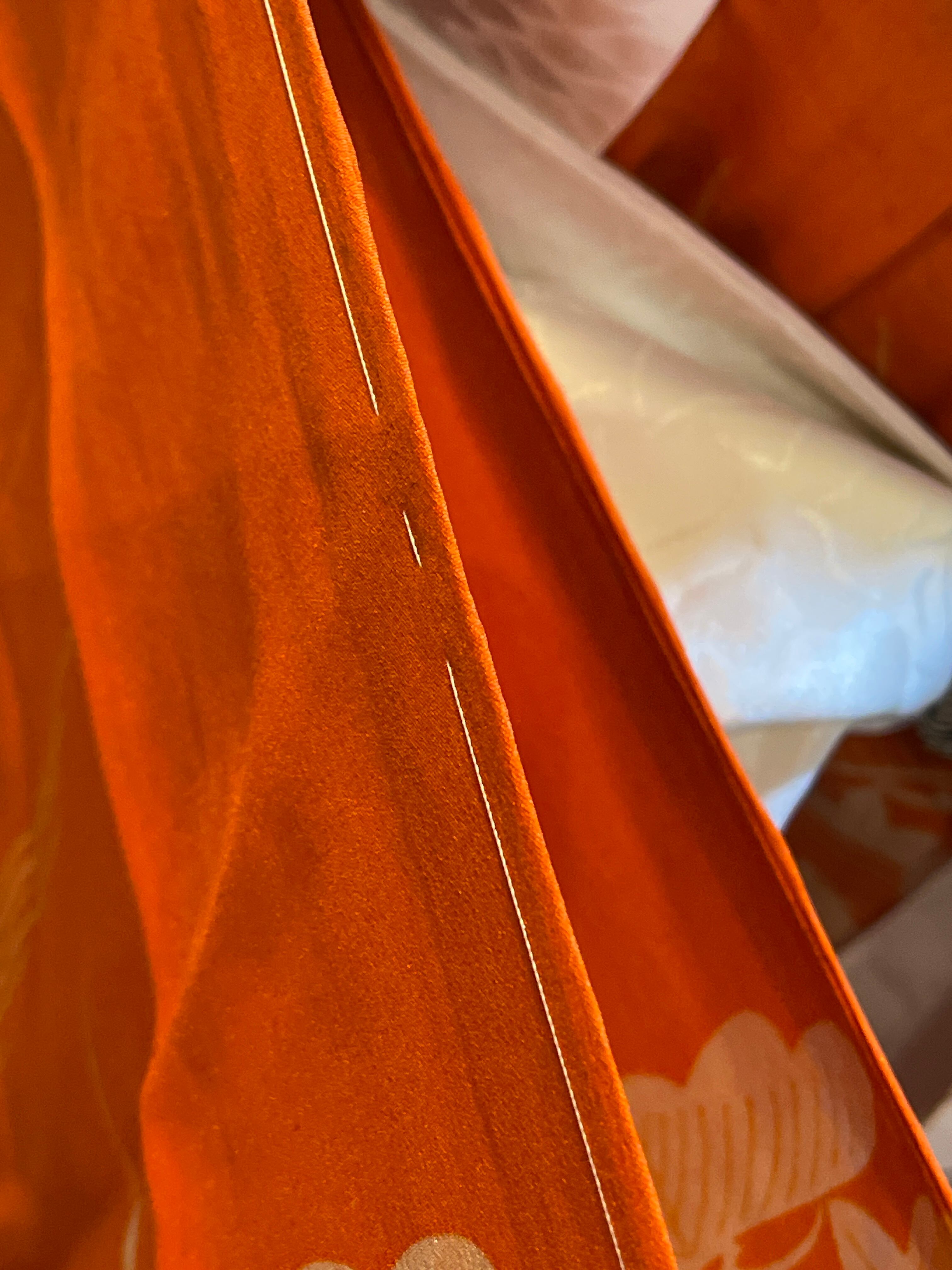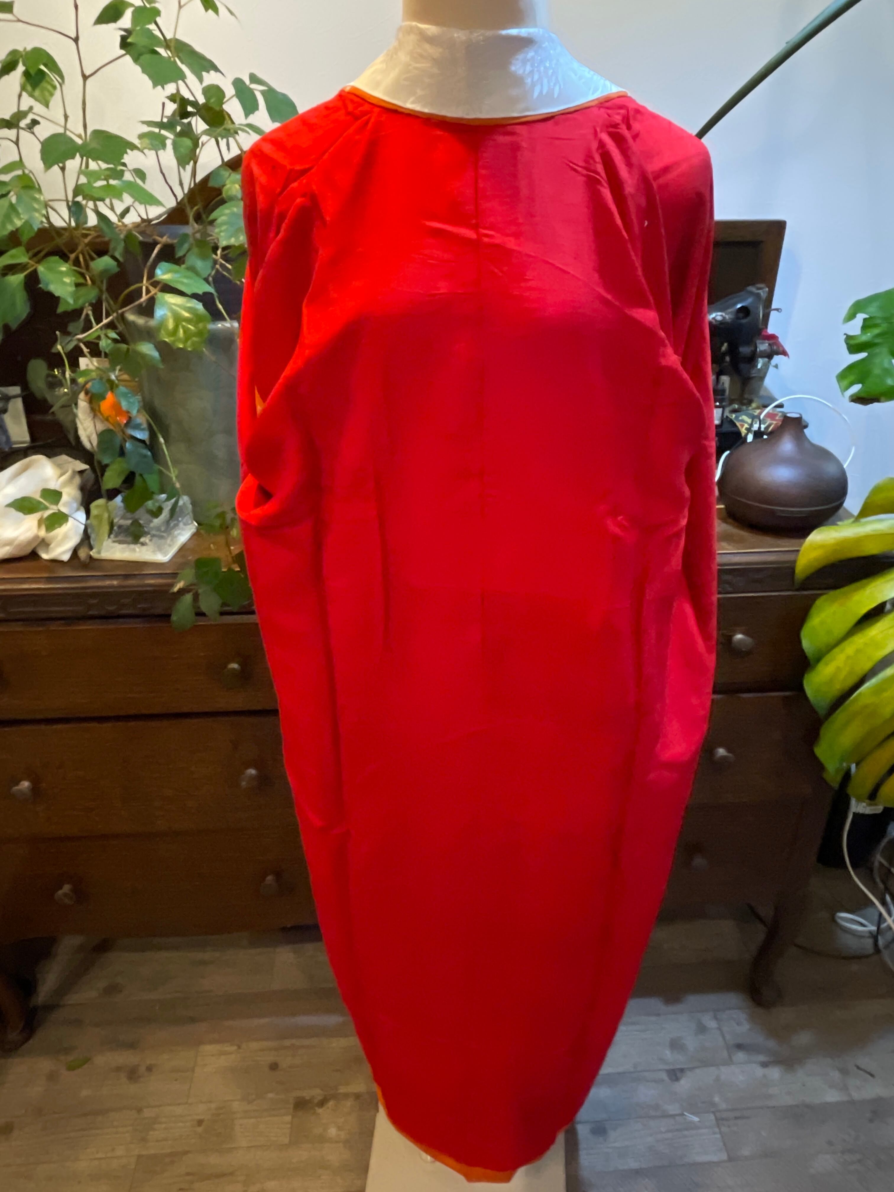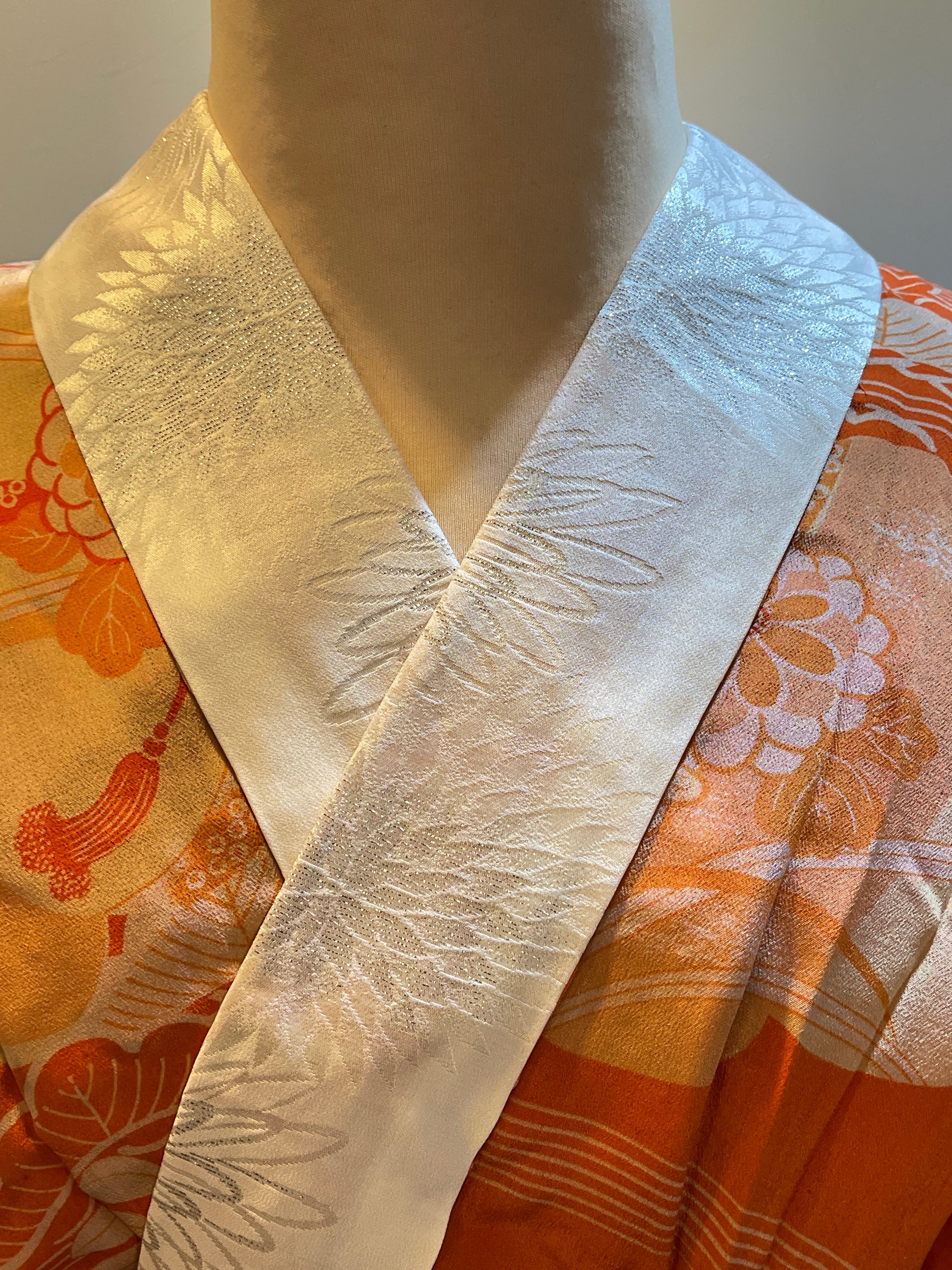 くすみオレンジに御所車や四季の花、着物のような長襦袢です。