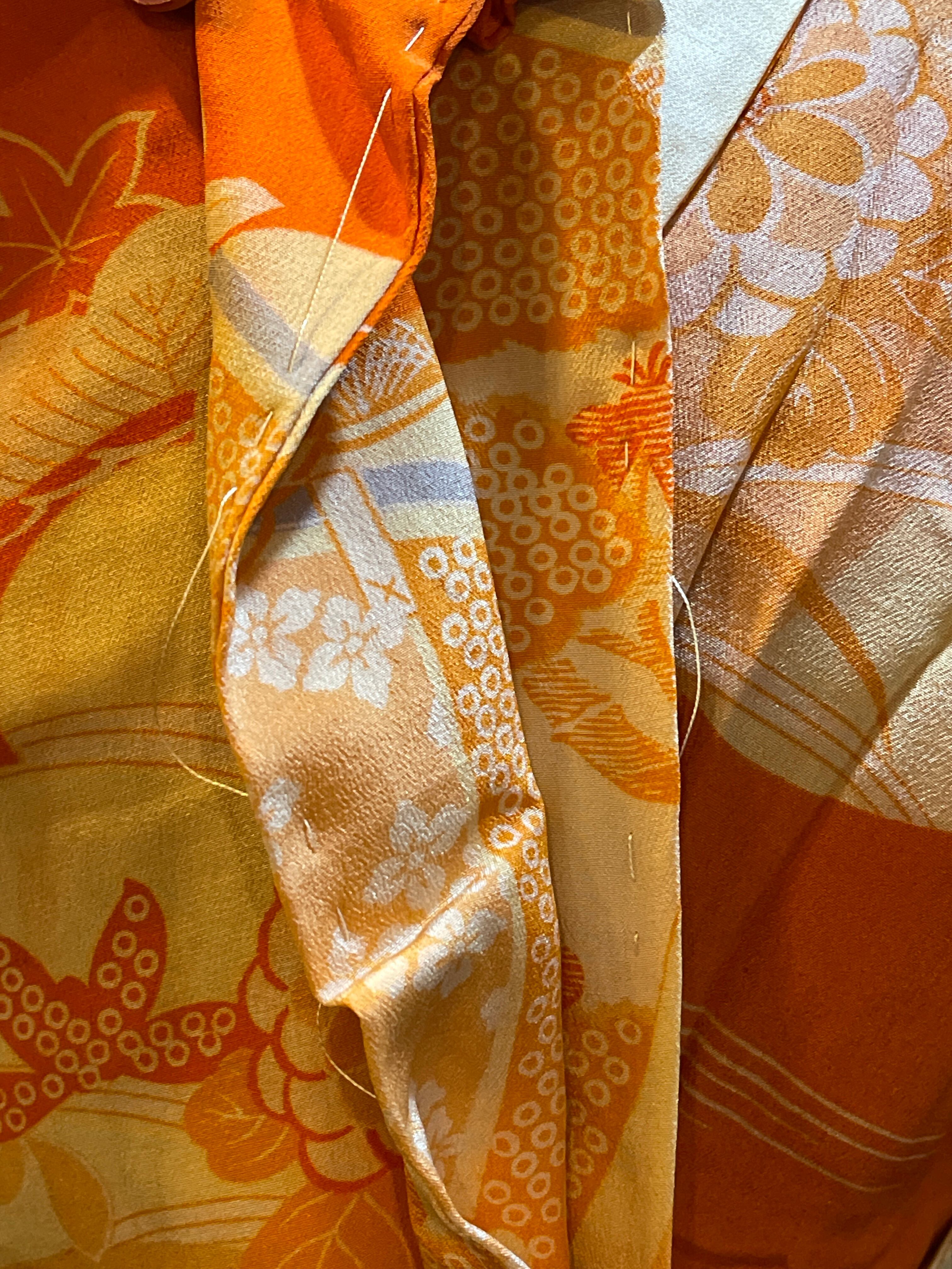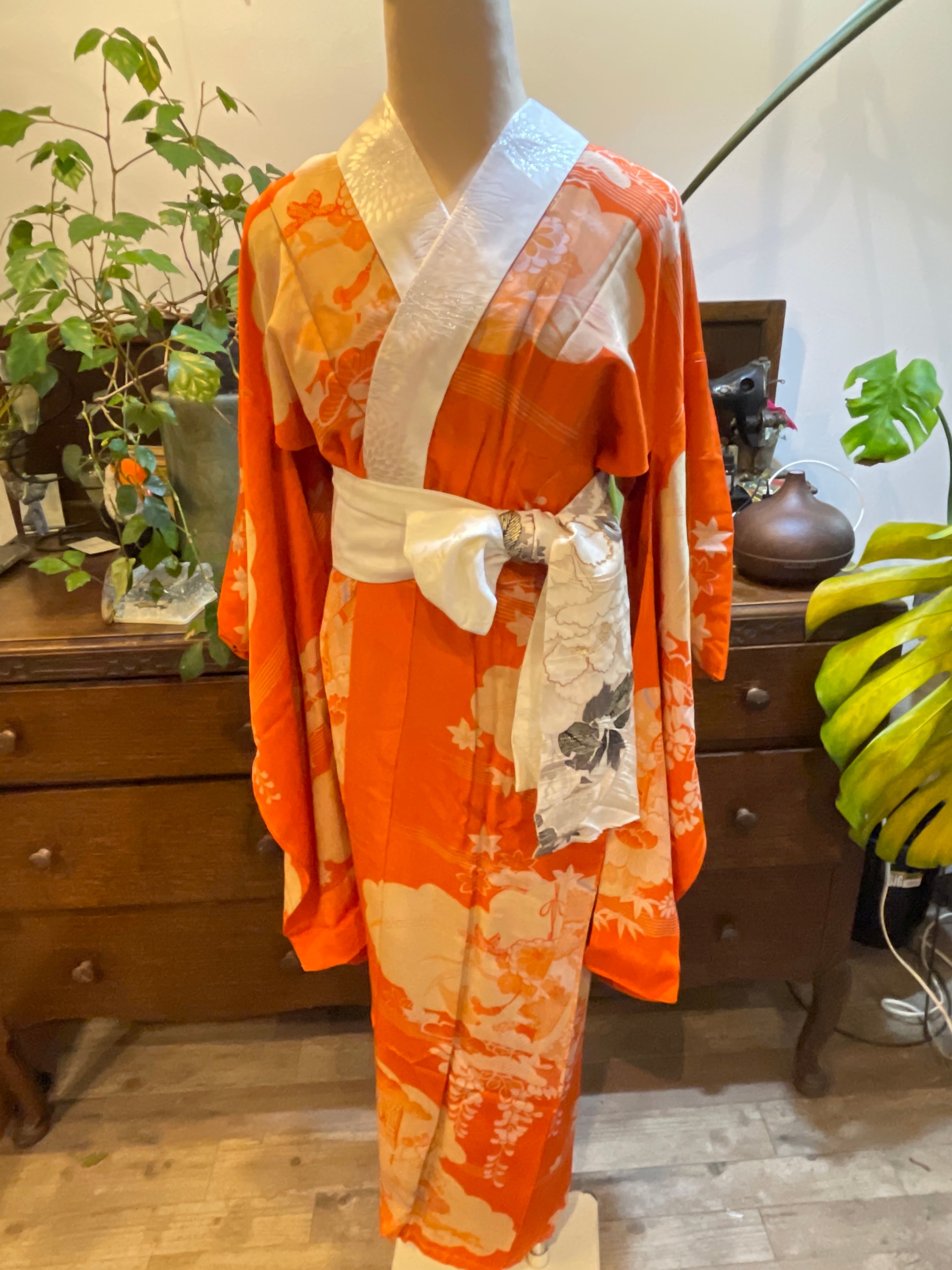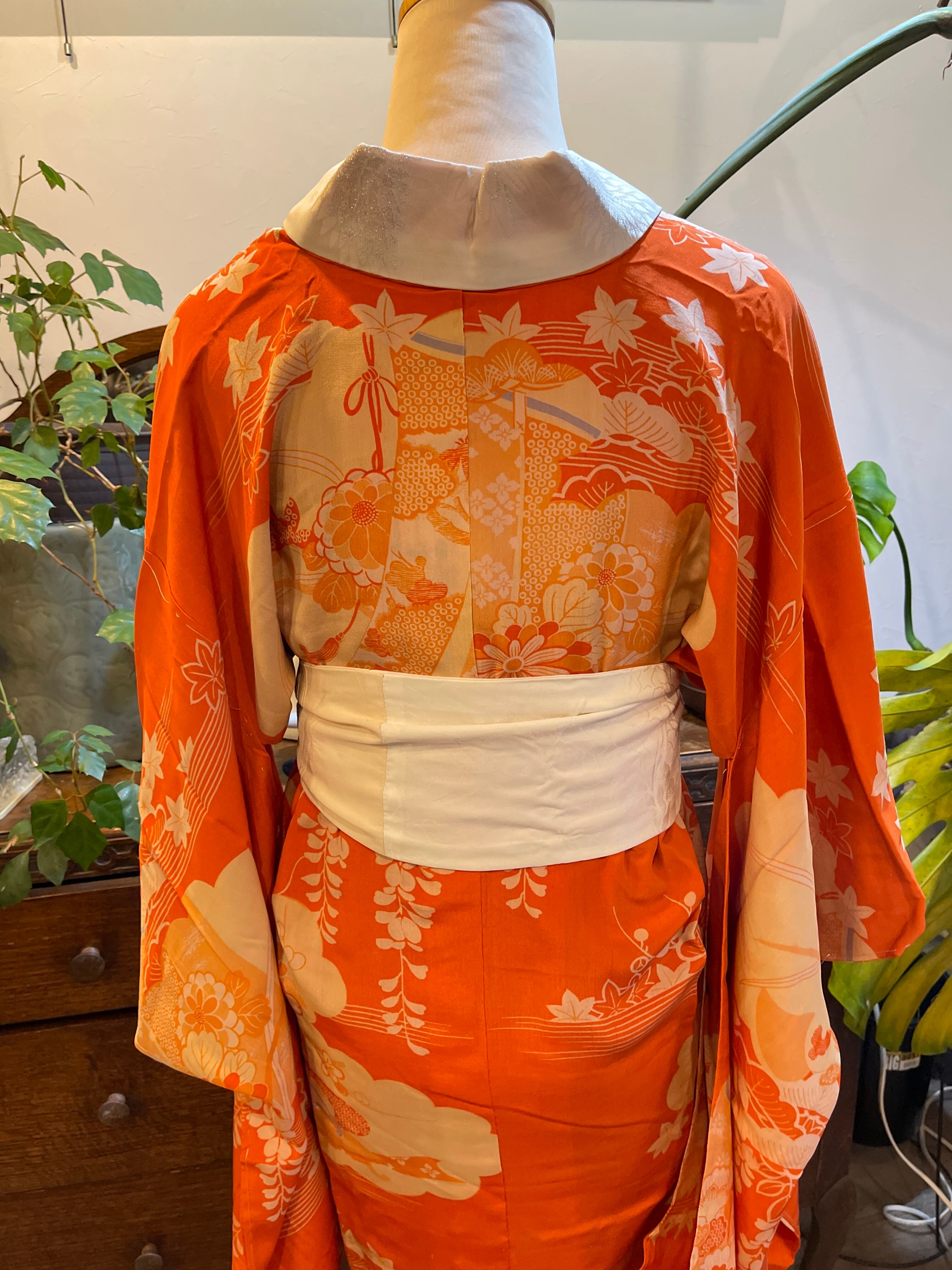 長襦袢 アンティーク長襦袢 オレンジ系 御所車 四季の花 雲 紅絹 袷仕立て 部屋着 ガウン