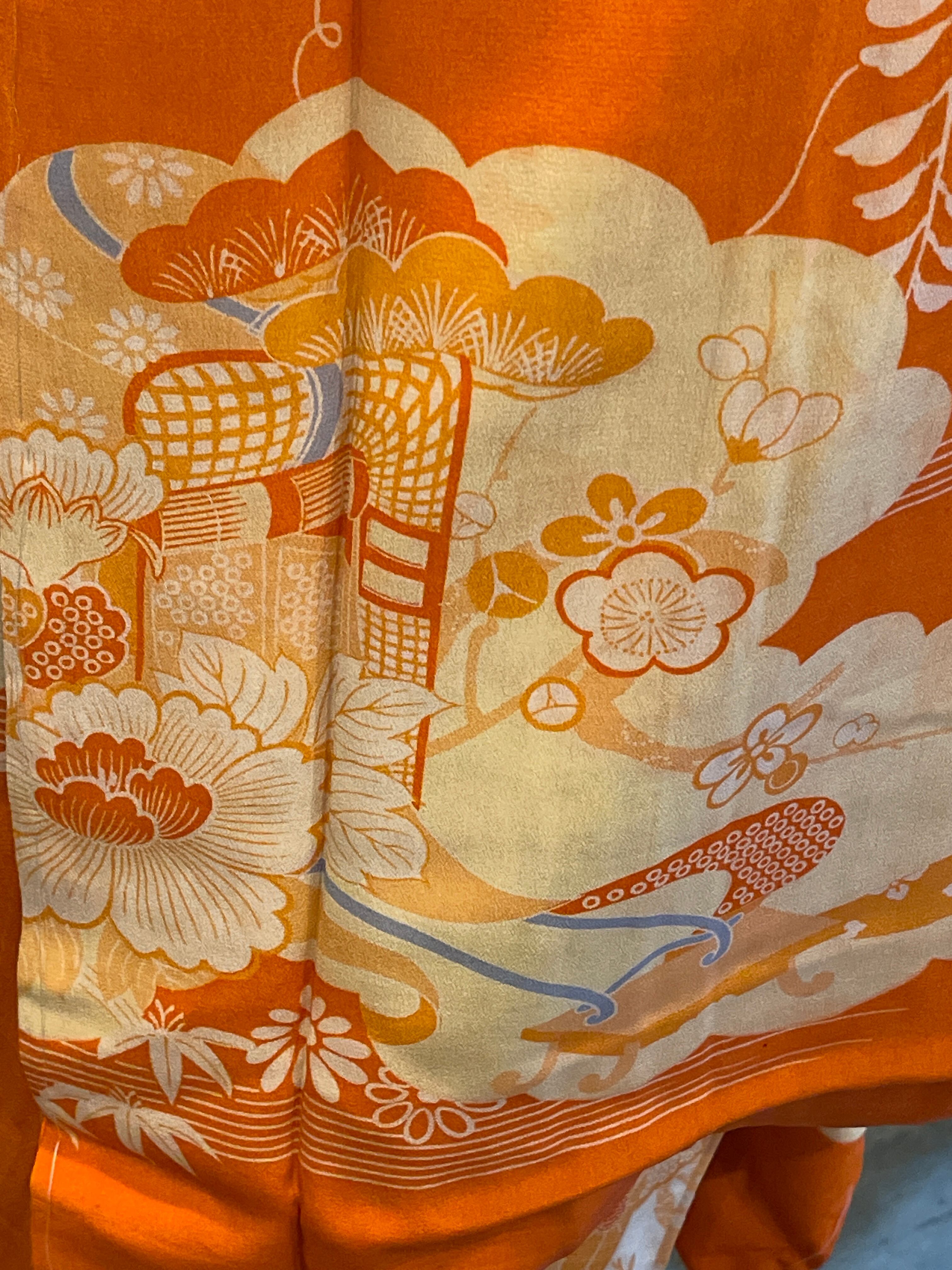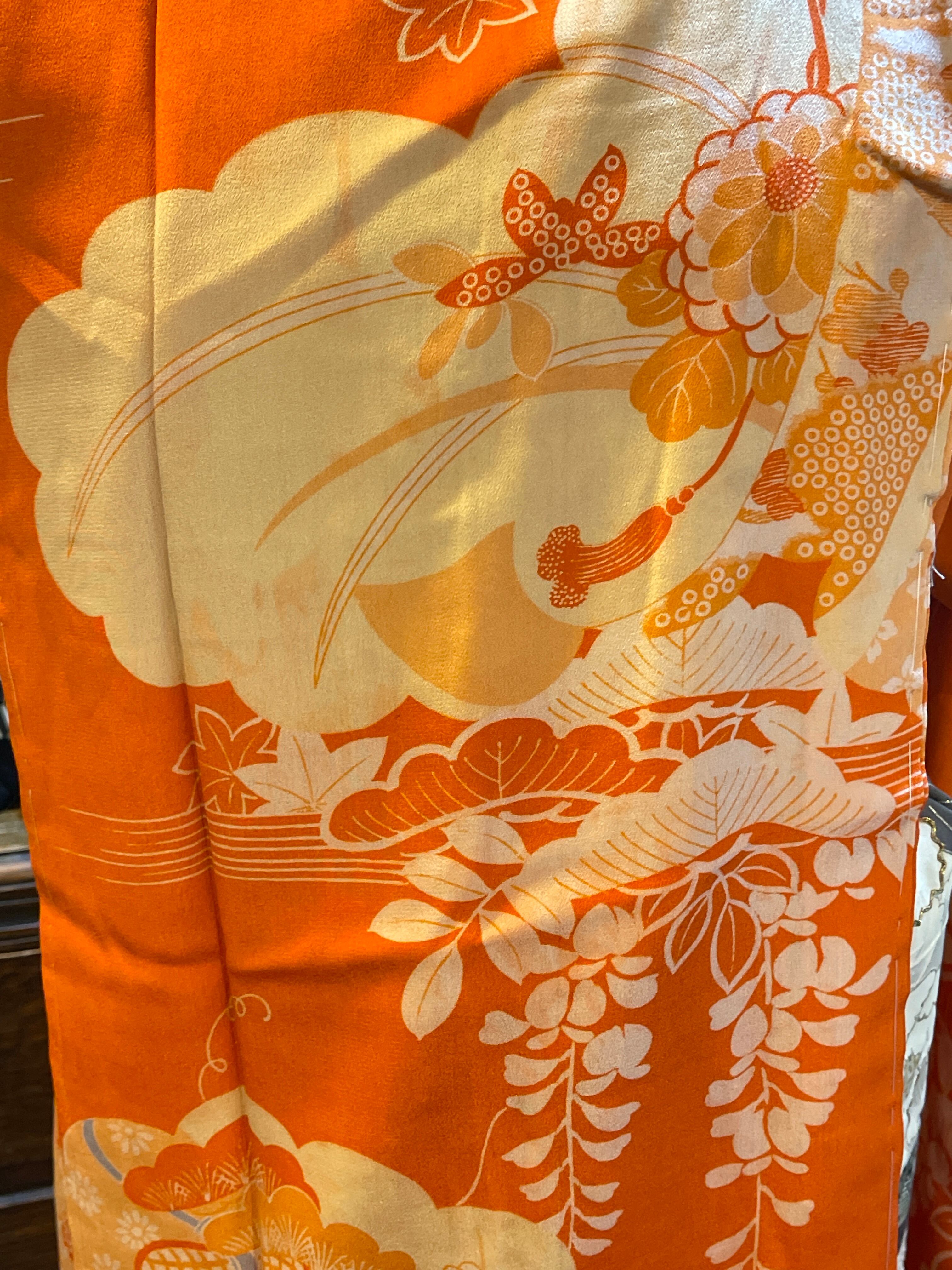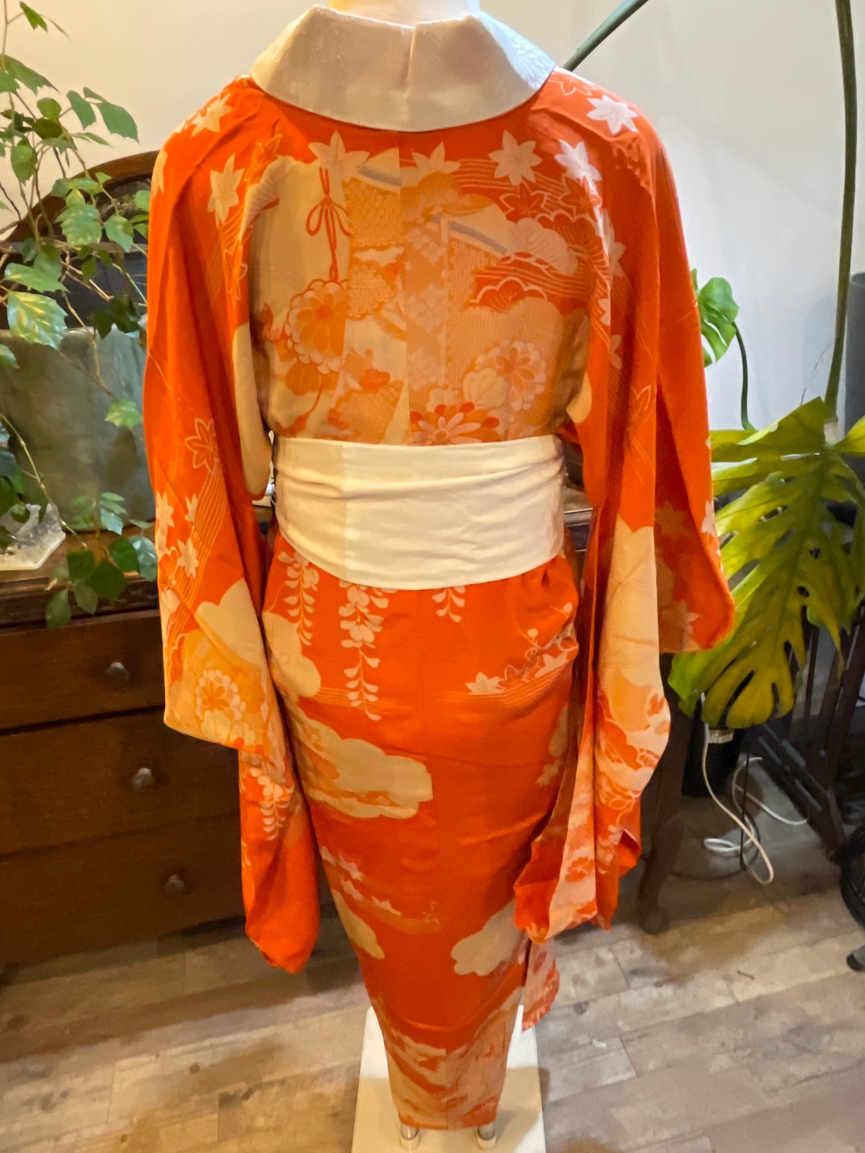 長襦袢 アンティーク長襦袢 オレンジ系 御所車 四季の花 雲 紅絹 袷仕立て 部屋着 ガウン