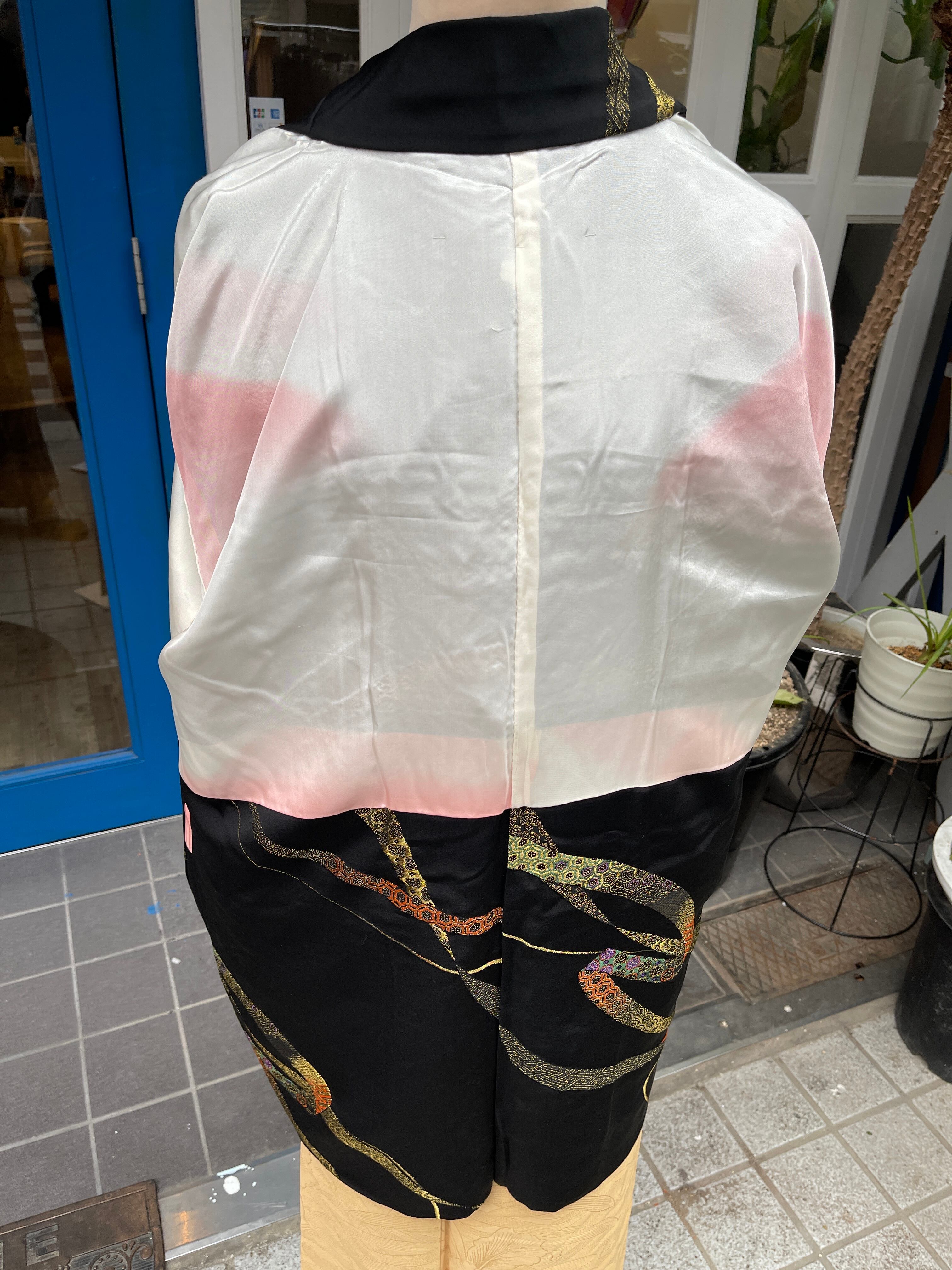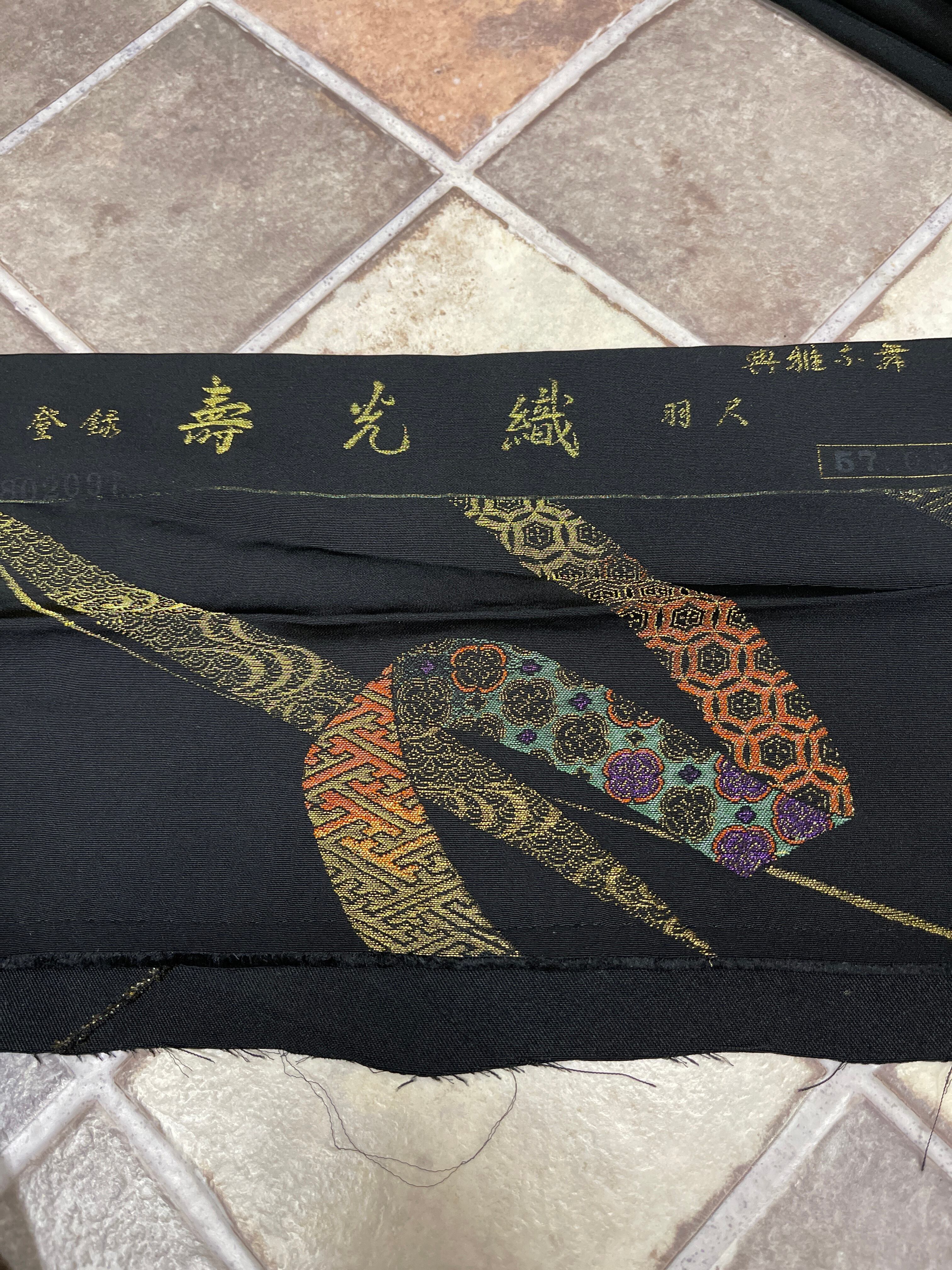 金糸とカラフルな糸で織り出されたリボンが待っているような柄行、リボンの中には吉祥紋様が織り込まれています。