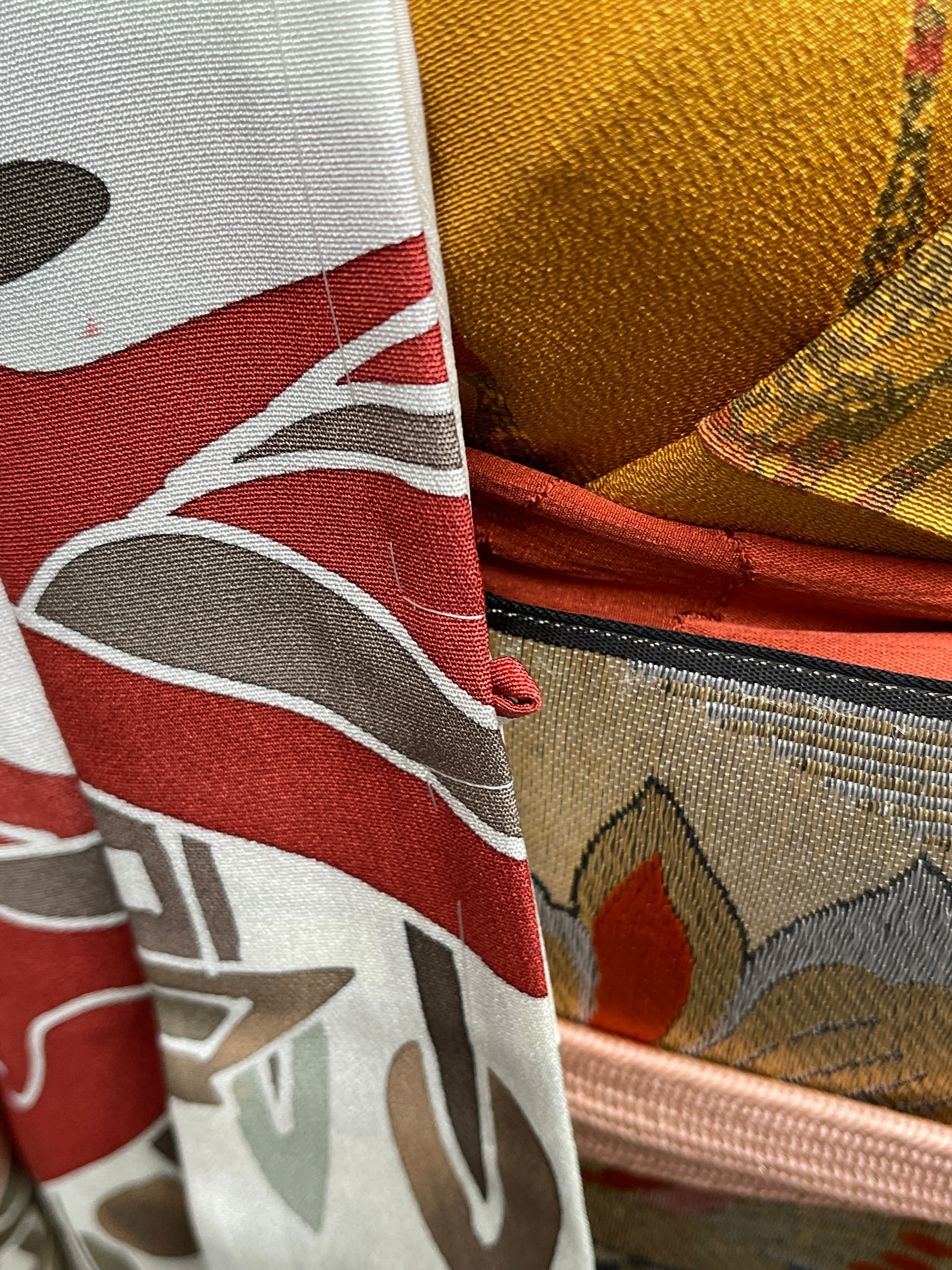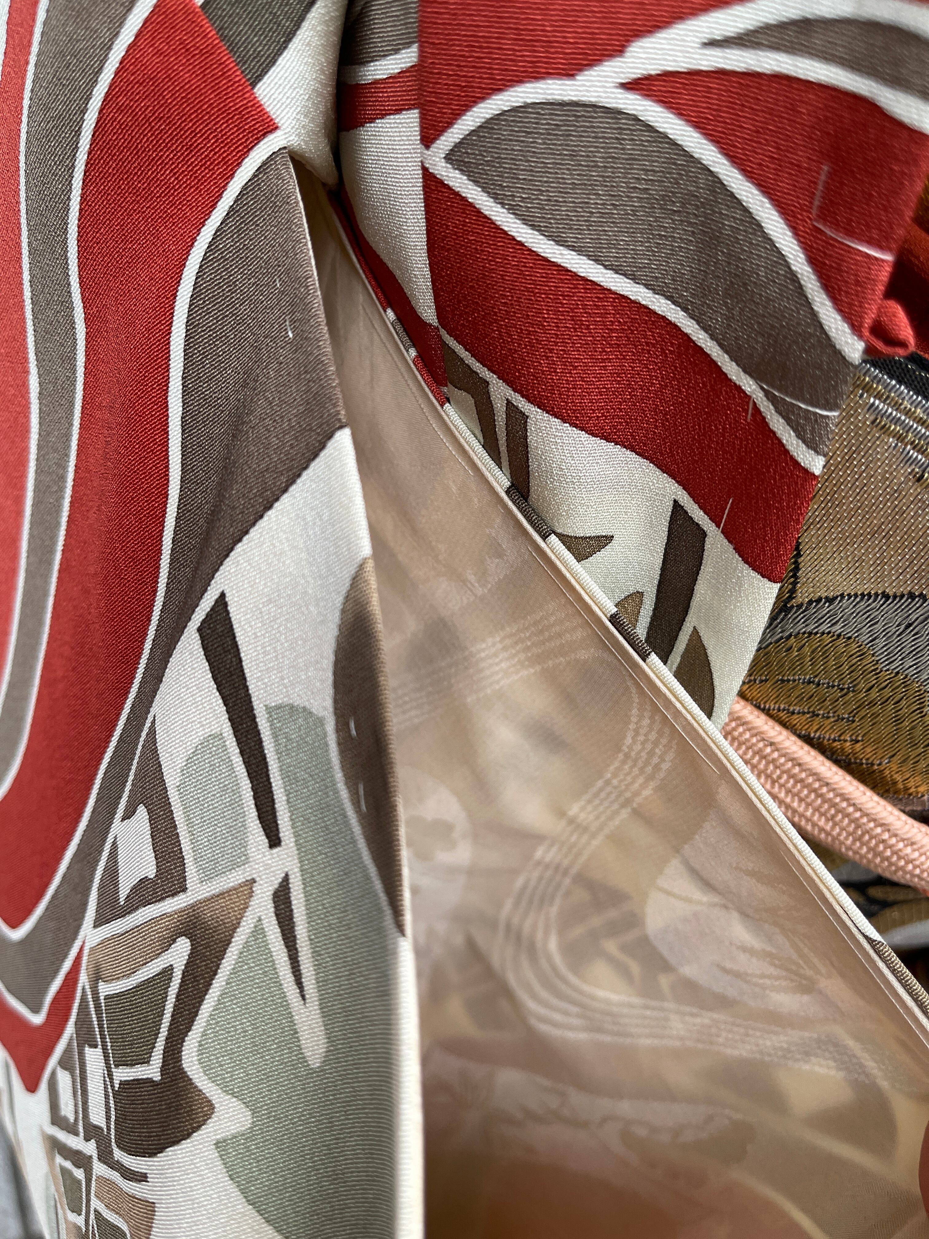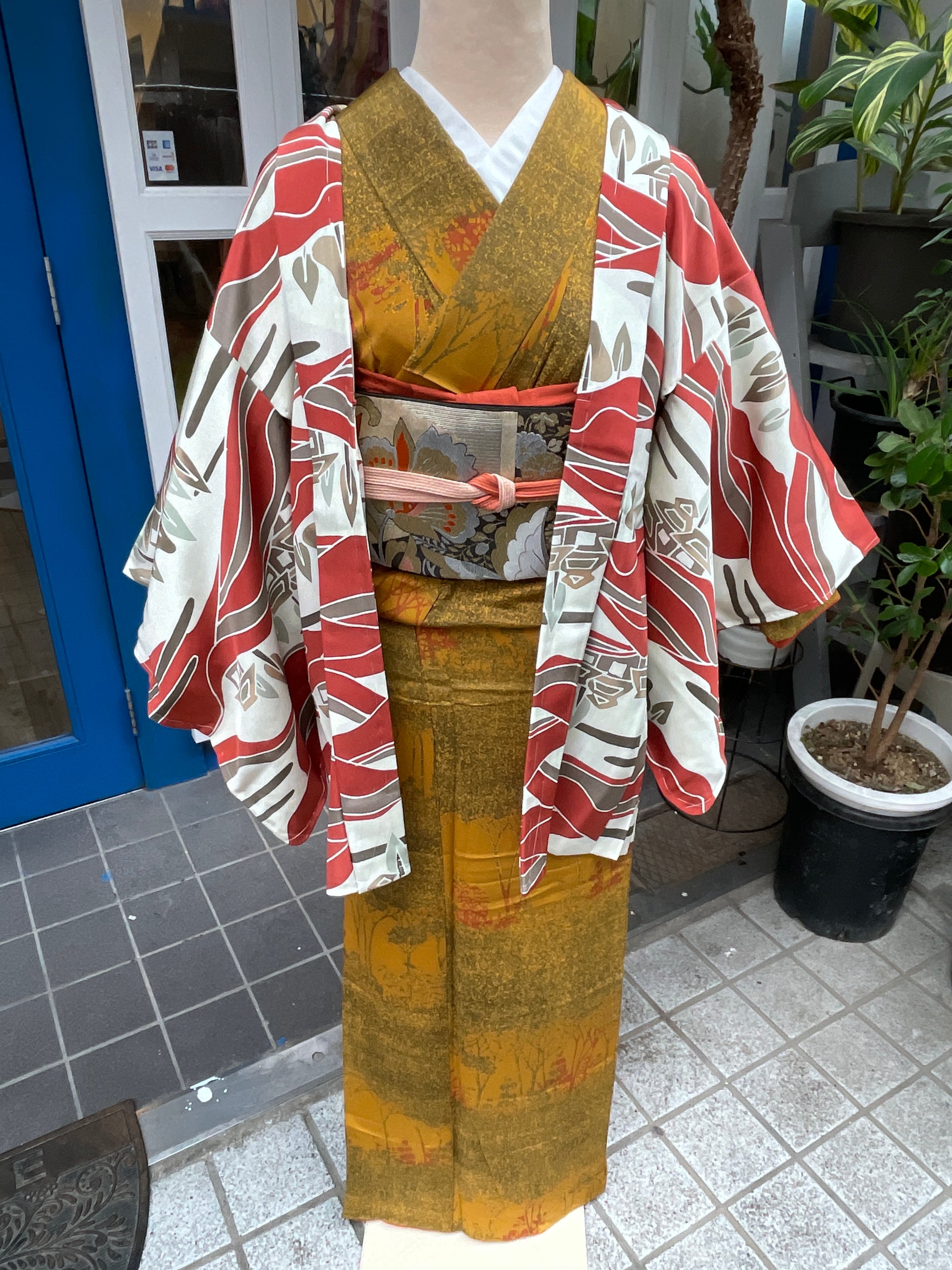 優しい色使いで、茅葺き屋根柄可愛らしいレトロモダンな柄行の羽織です。