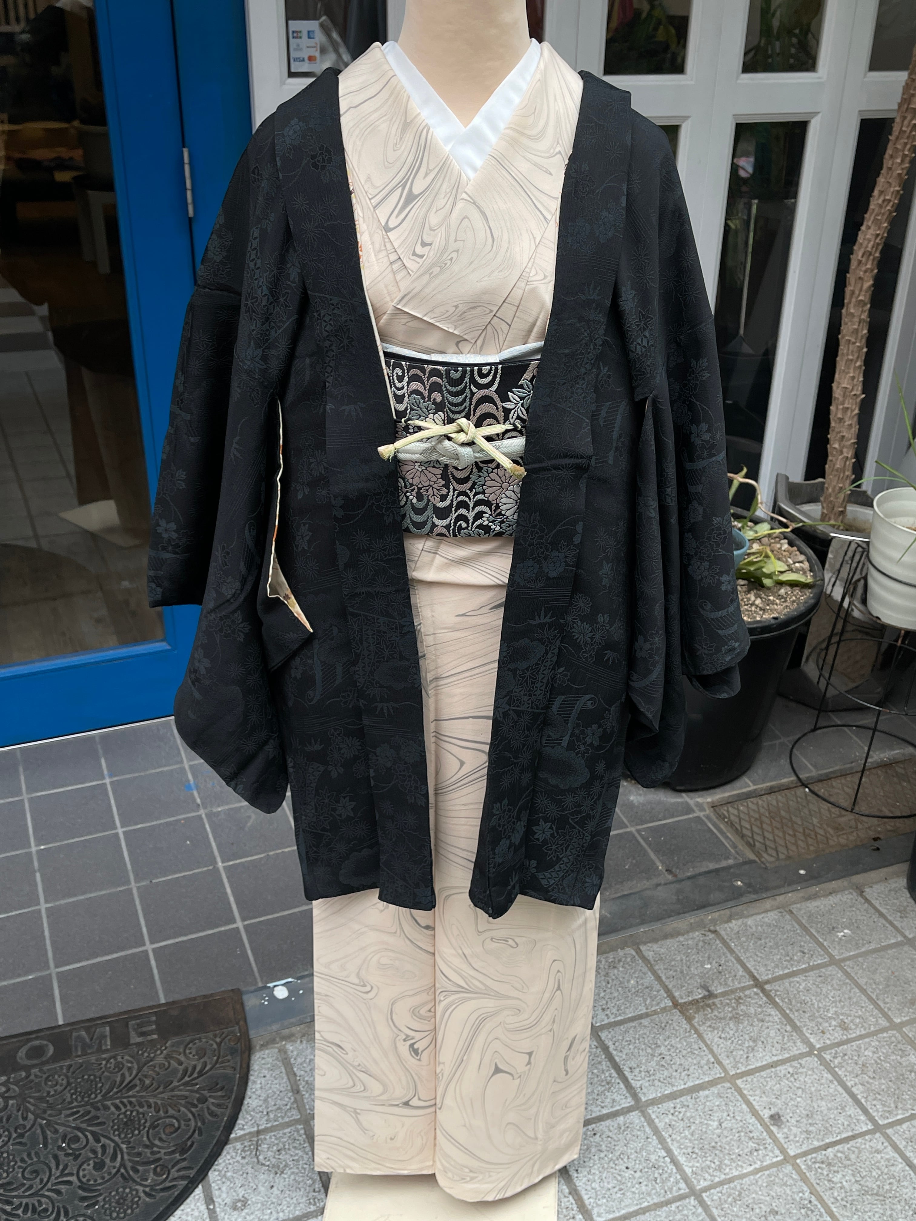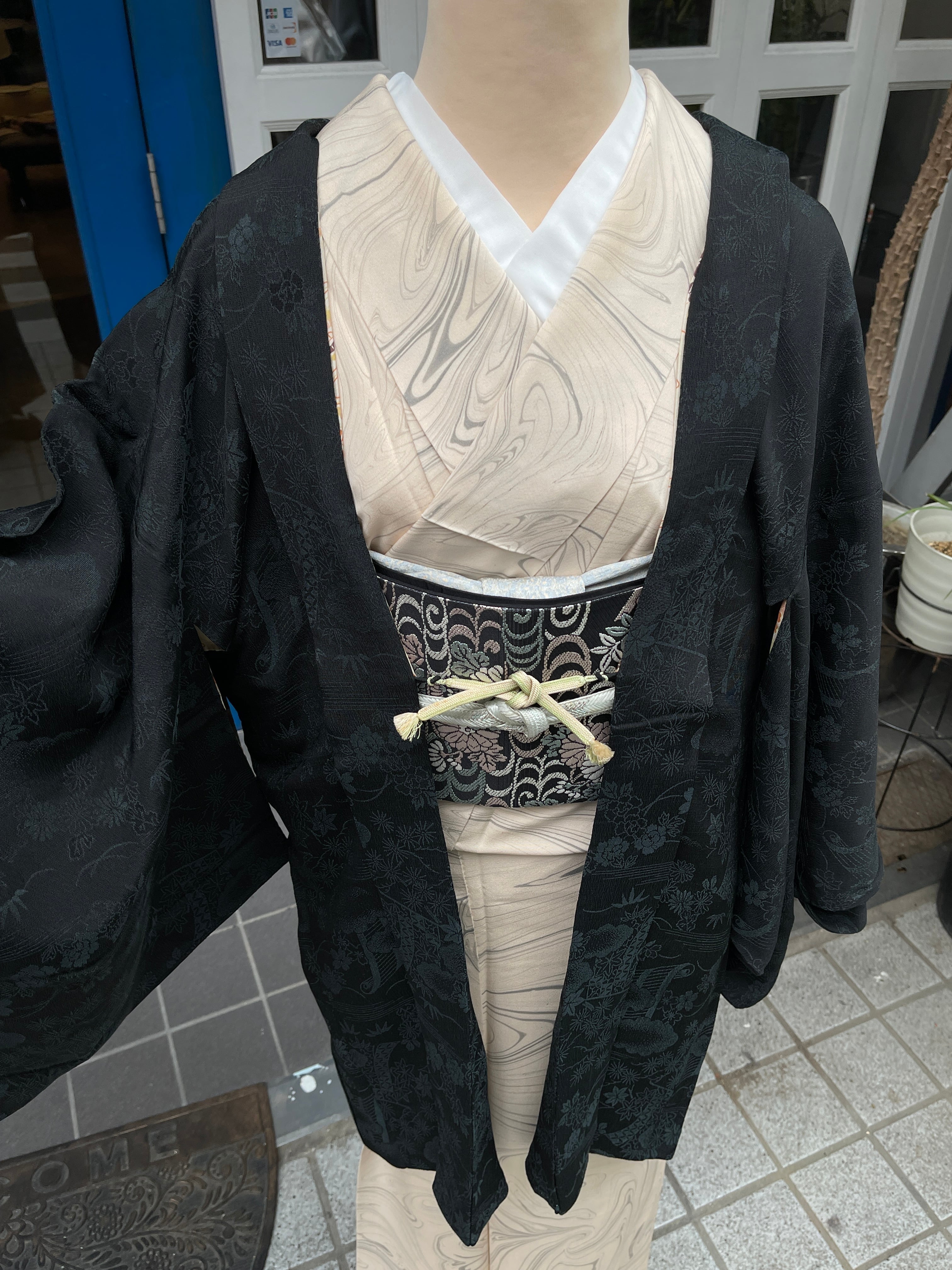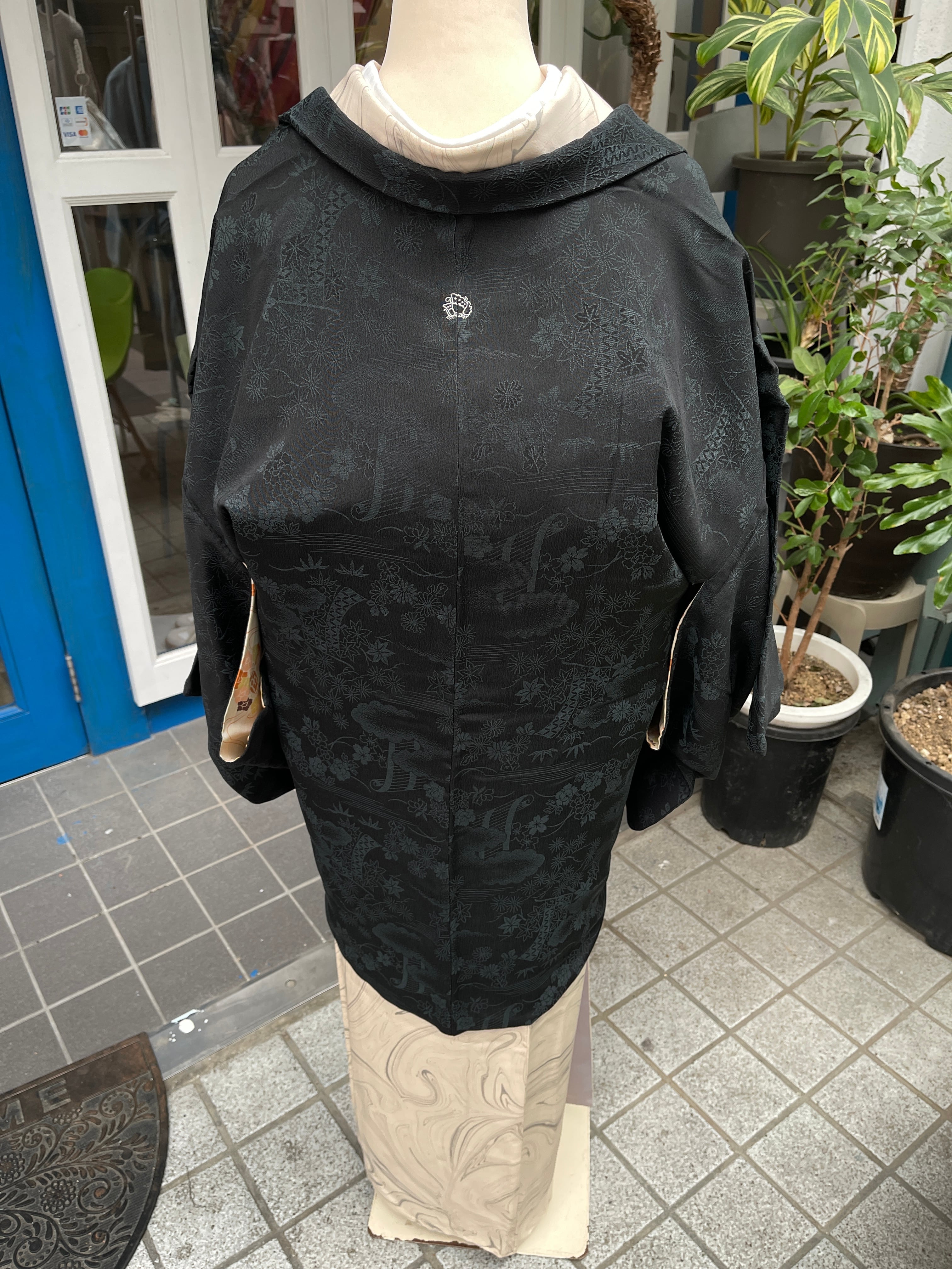 黒羽織 セミアンティーク天蚕 山繭 無地 四季の花 御所車 一つ紋 フォーマル 冠婚葬祭 卒入学式