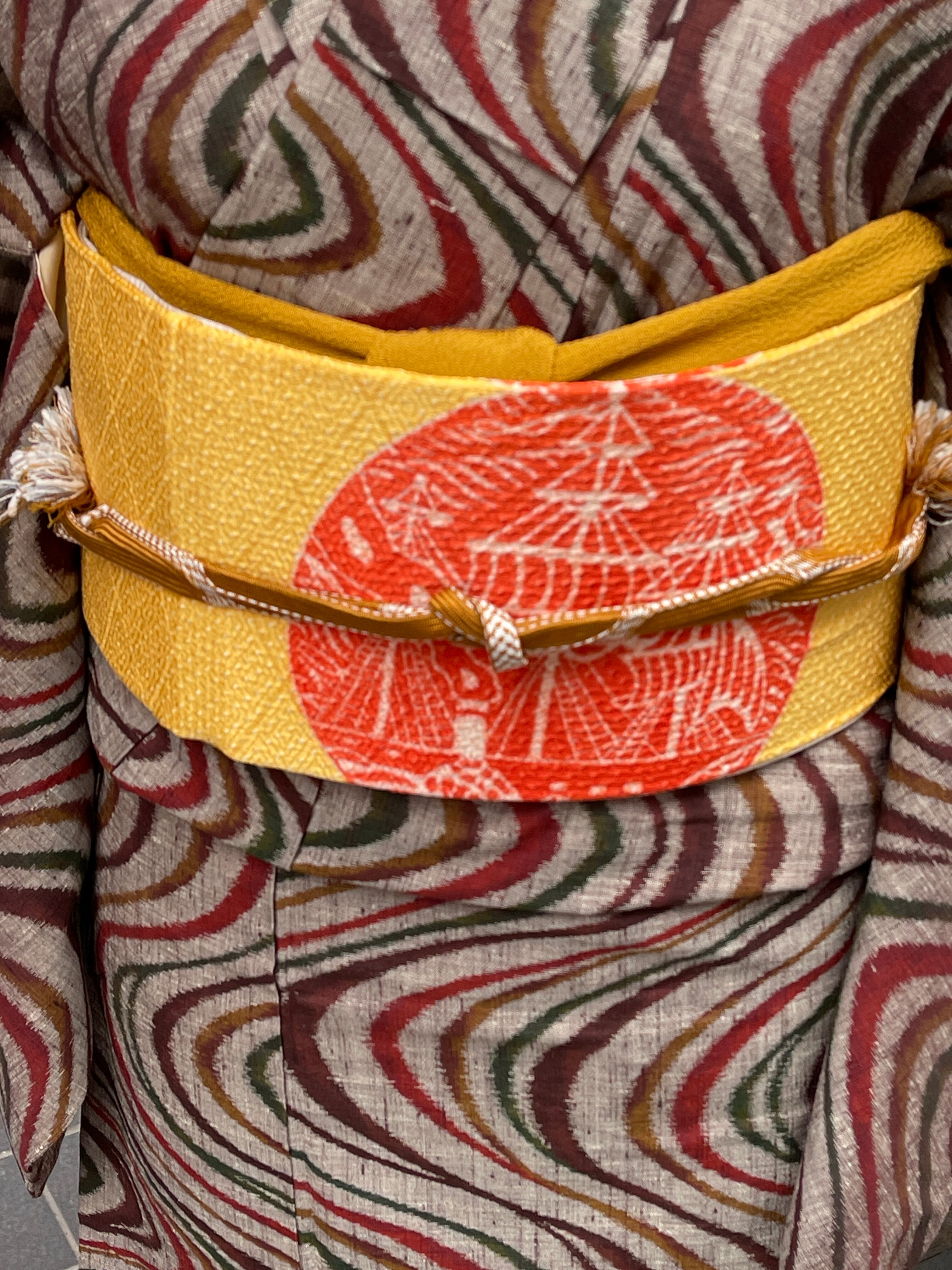 名古屋帯 九寸名古屋帯 総絞り イエロー系 帆船 船 カジュアル 紬 小紋 女子会 食事会 お茶会