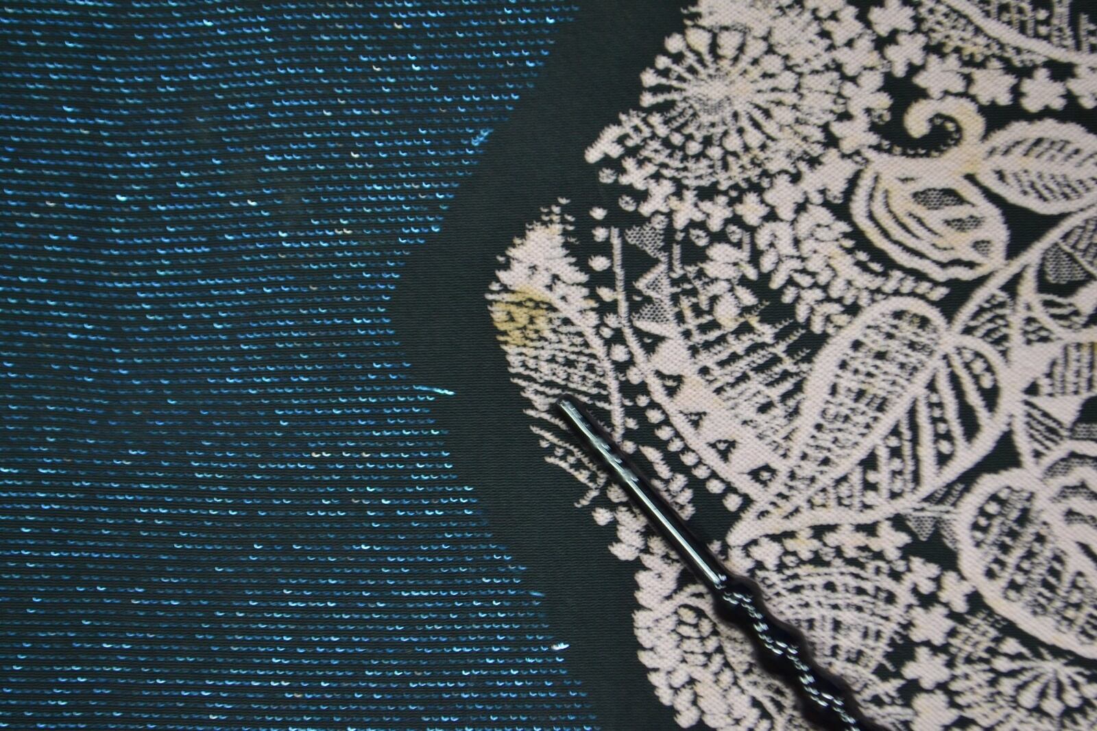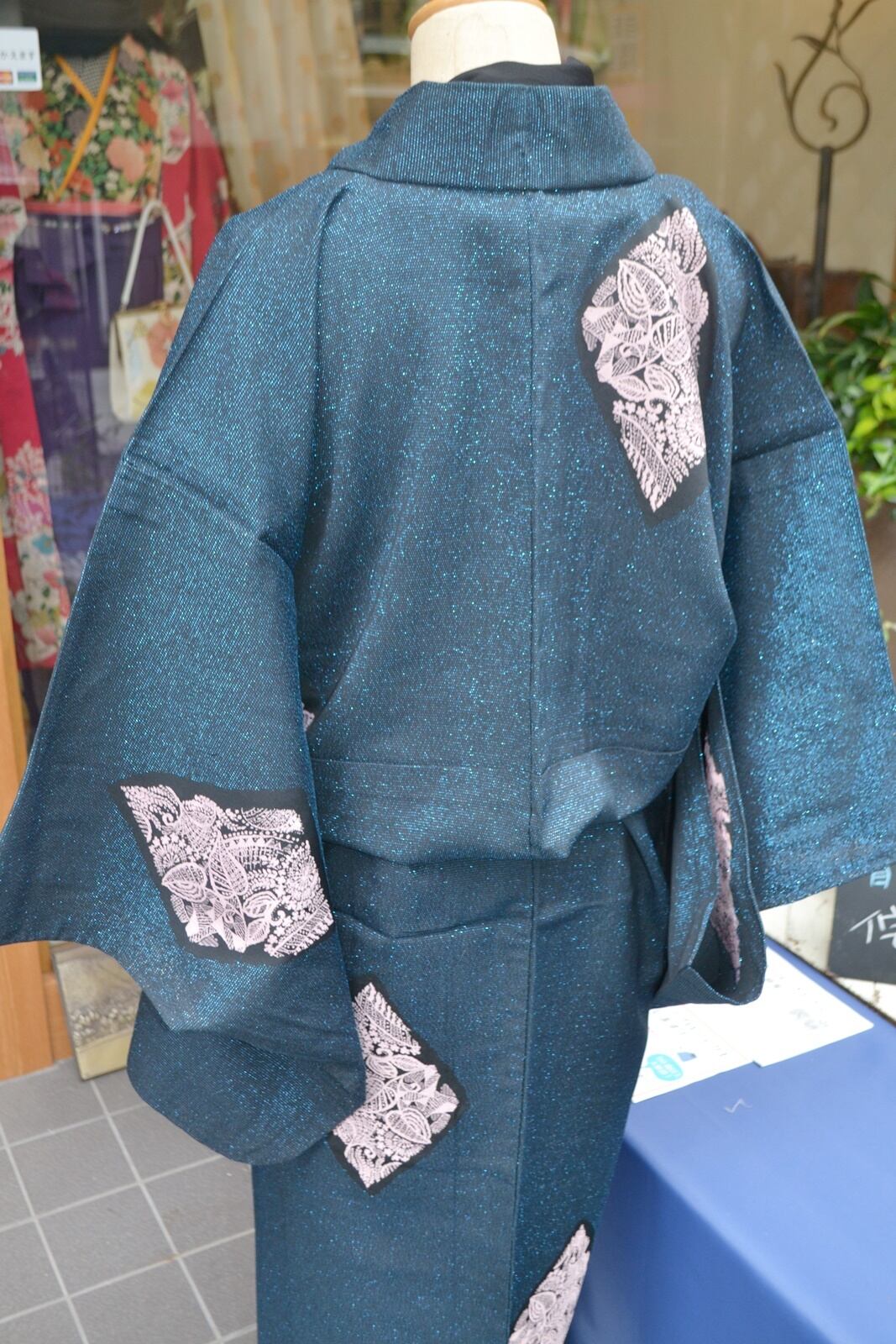 キラッキラの青や銀のラメの生地にボタニカルな柄が織られています。