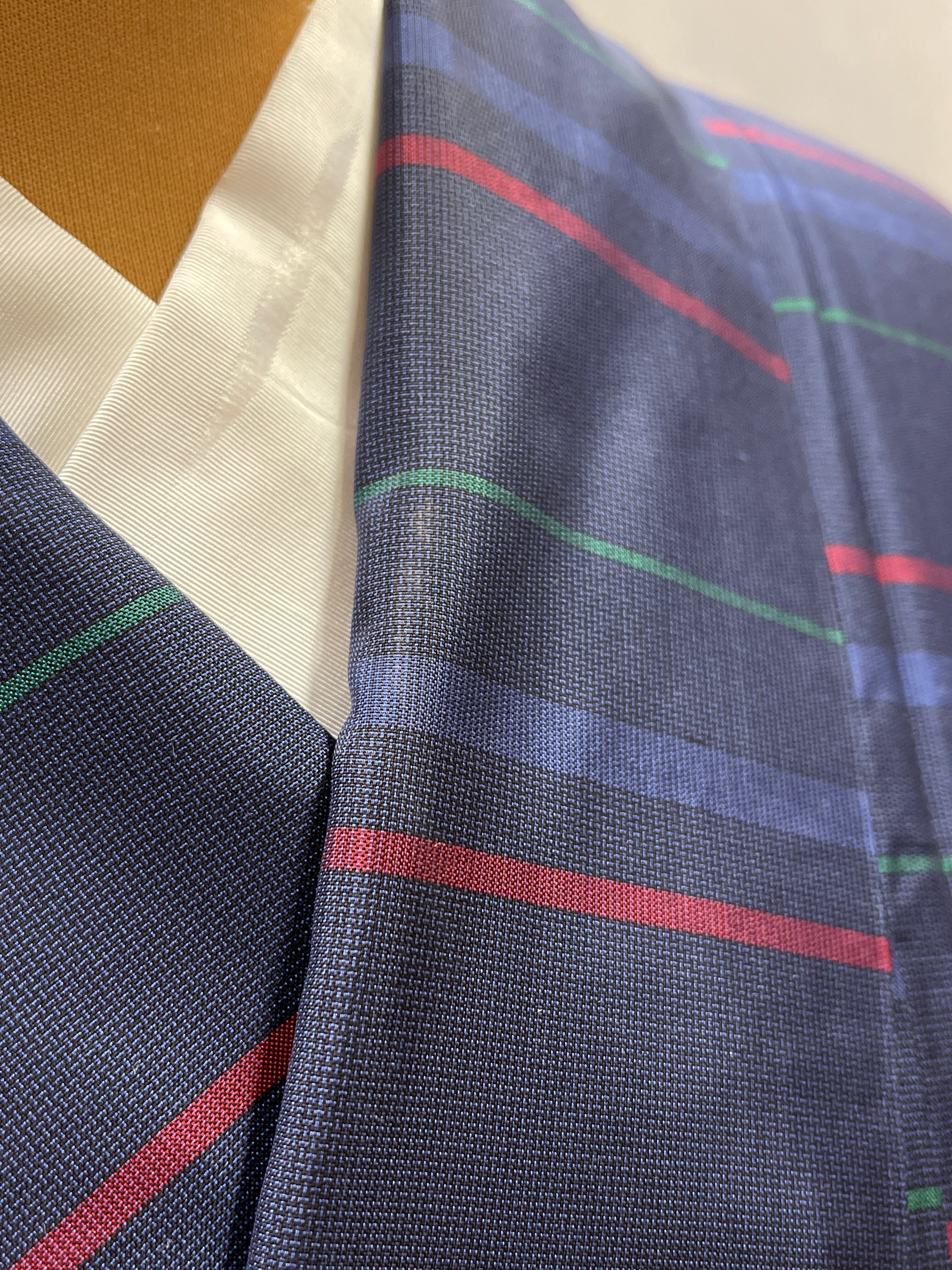 紺地に赤青緑のボーダーが入っています。