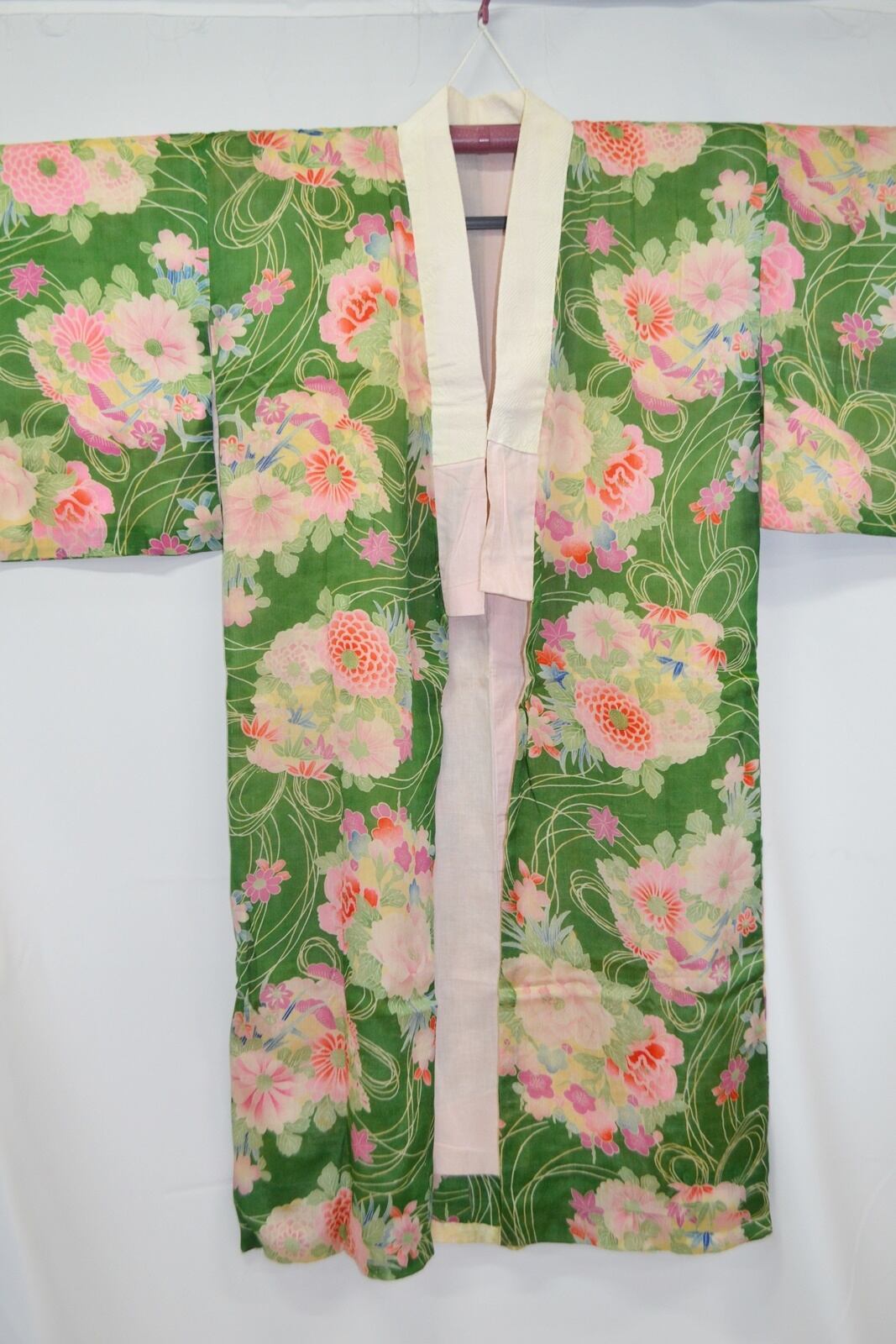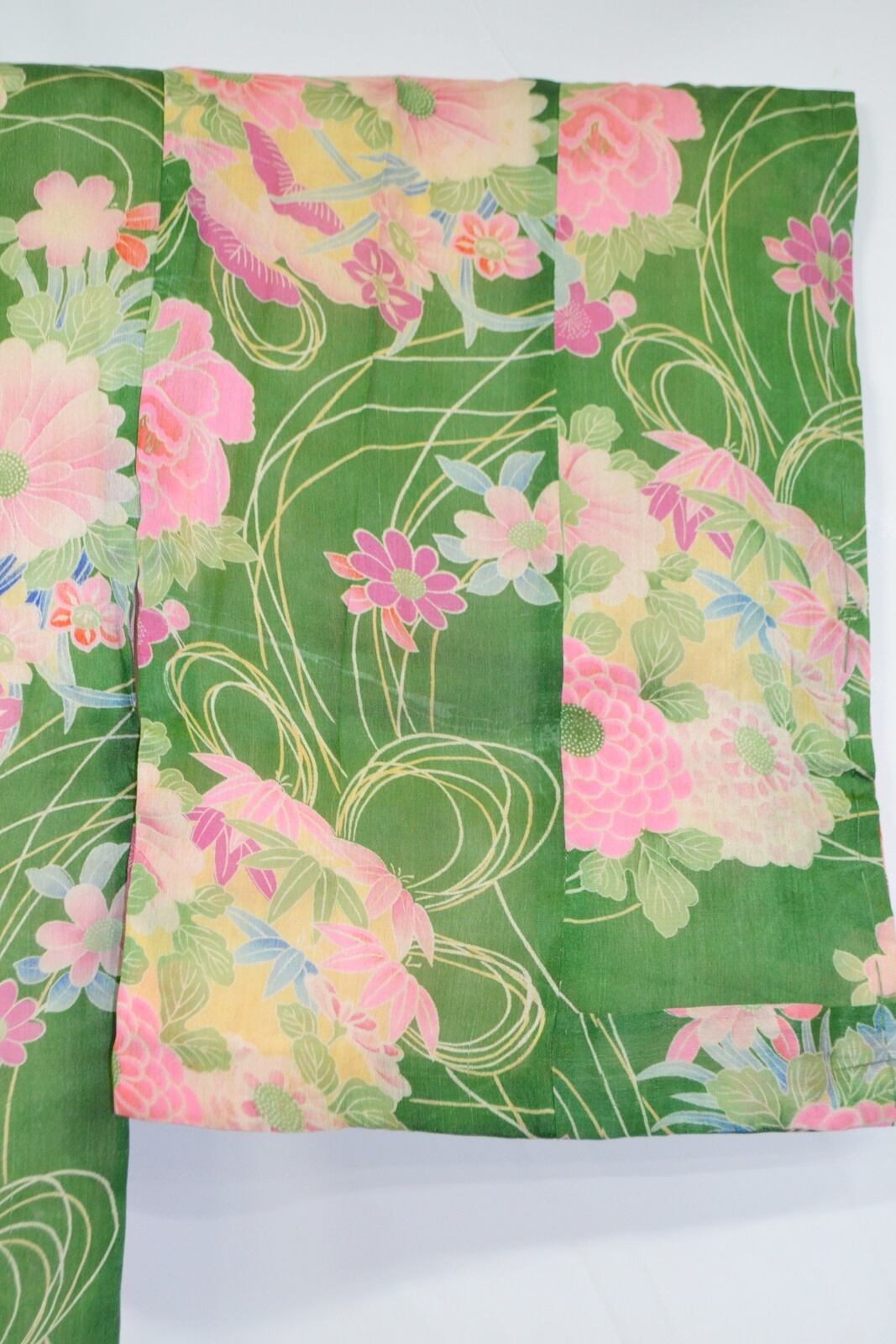 グリーン地に染めの花束が可憐なお襦袢ですね。