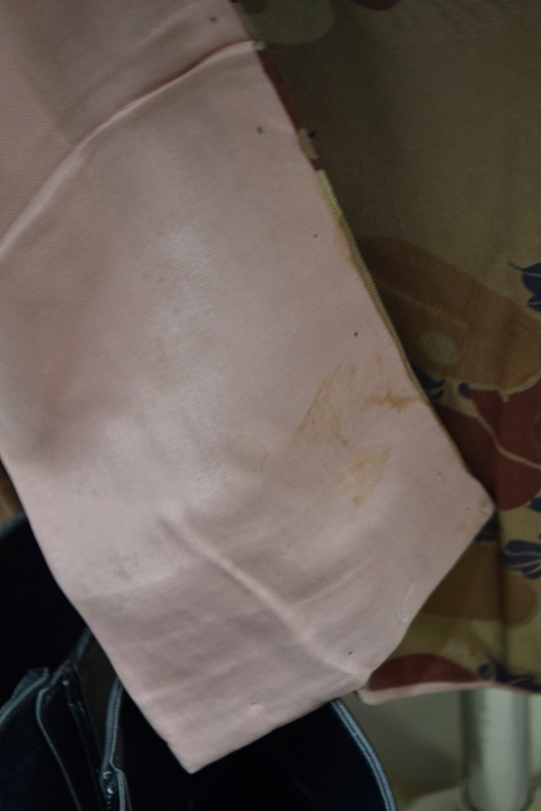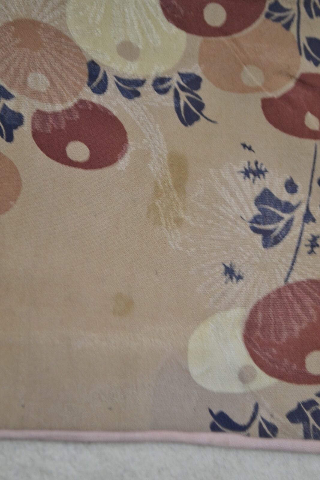 正絹 胴裏赤絹、所々シミ有り、袖付け補修あり、変色あり