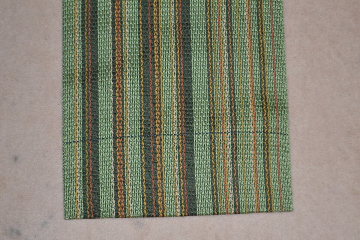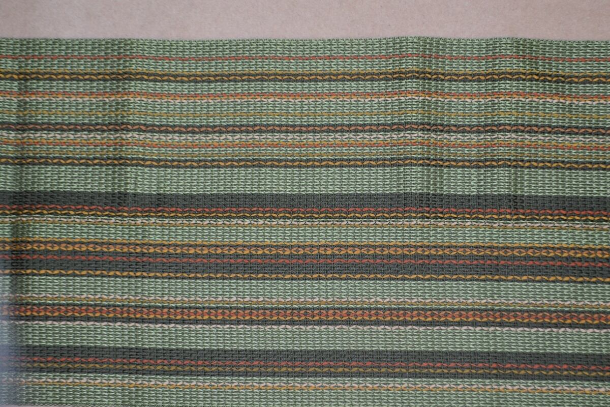 なんとも夏らしいモスグリーンの縞の夏帯です。縞の上からはいったジグザグのステッチ状の刺繍がなんとも可愛いです。