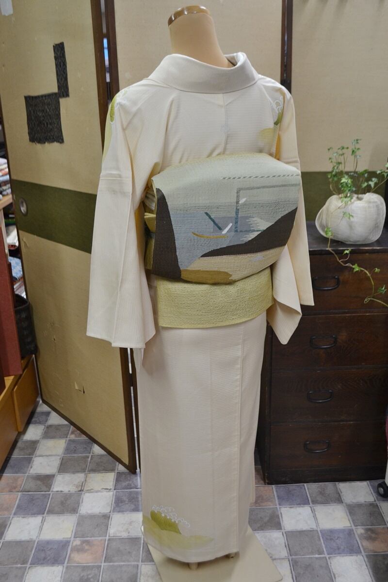 訪問着 夏着物 アンティーク 絽 クリーム系 黄緑 荒波