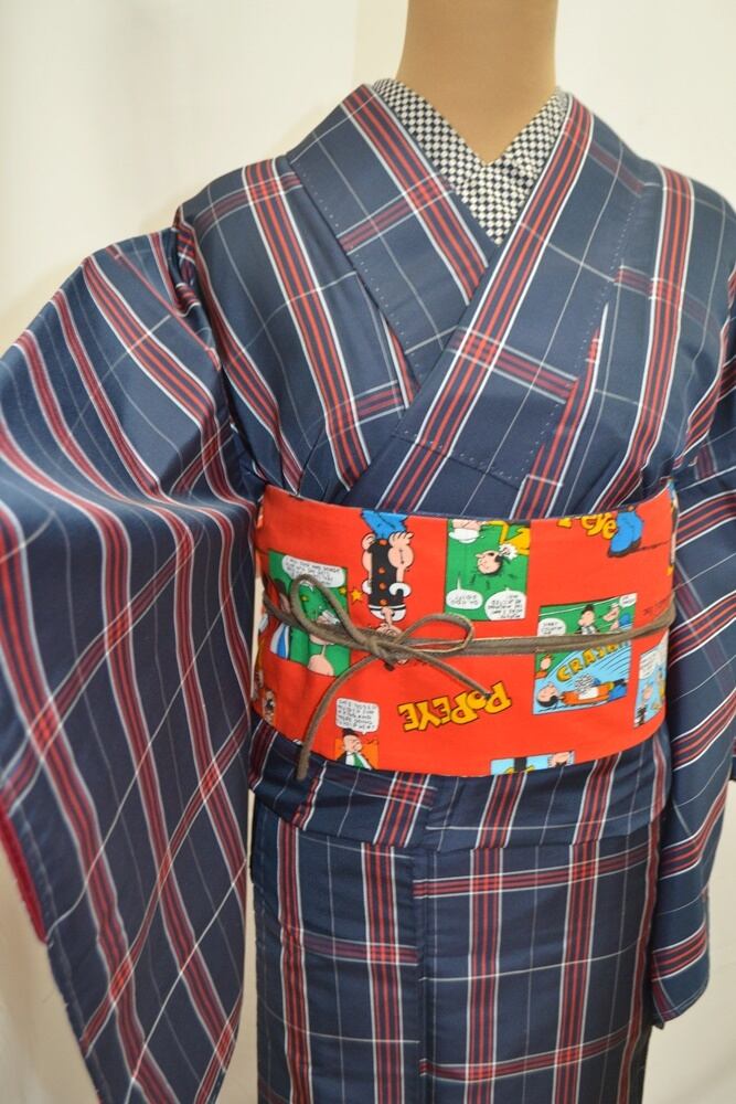 紬 ハリのある上質の絹 赤×紺 格子 しつけ付き