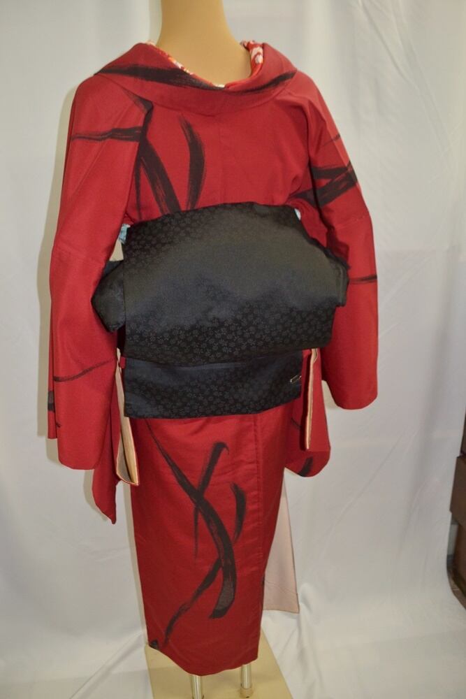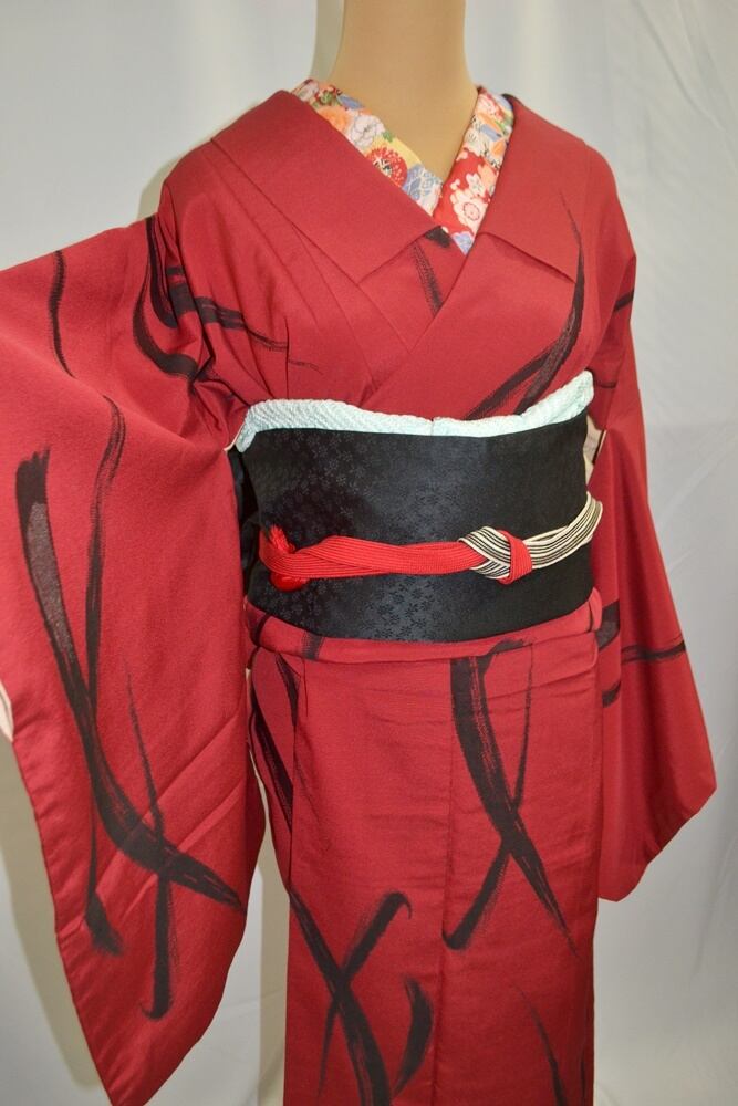 深紅のお召し生地に、機械刺繍ですね、まるで筆で一筆書きしたような柄が入っています。