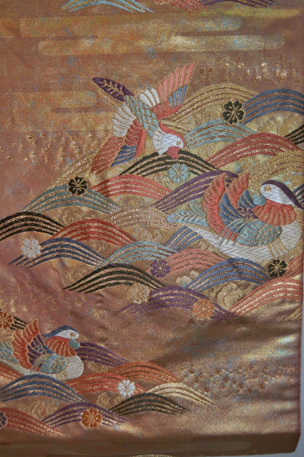 あかがね色とでも言いますか、磨いた銅のような褐色の地色にトーンを落とした波とオシドリが織られています。