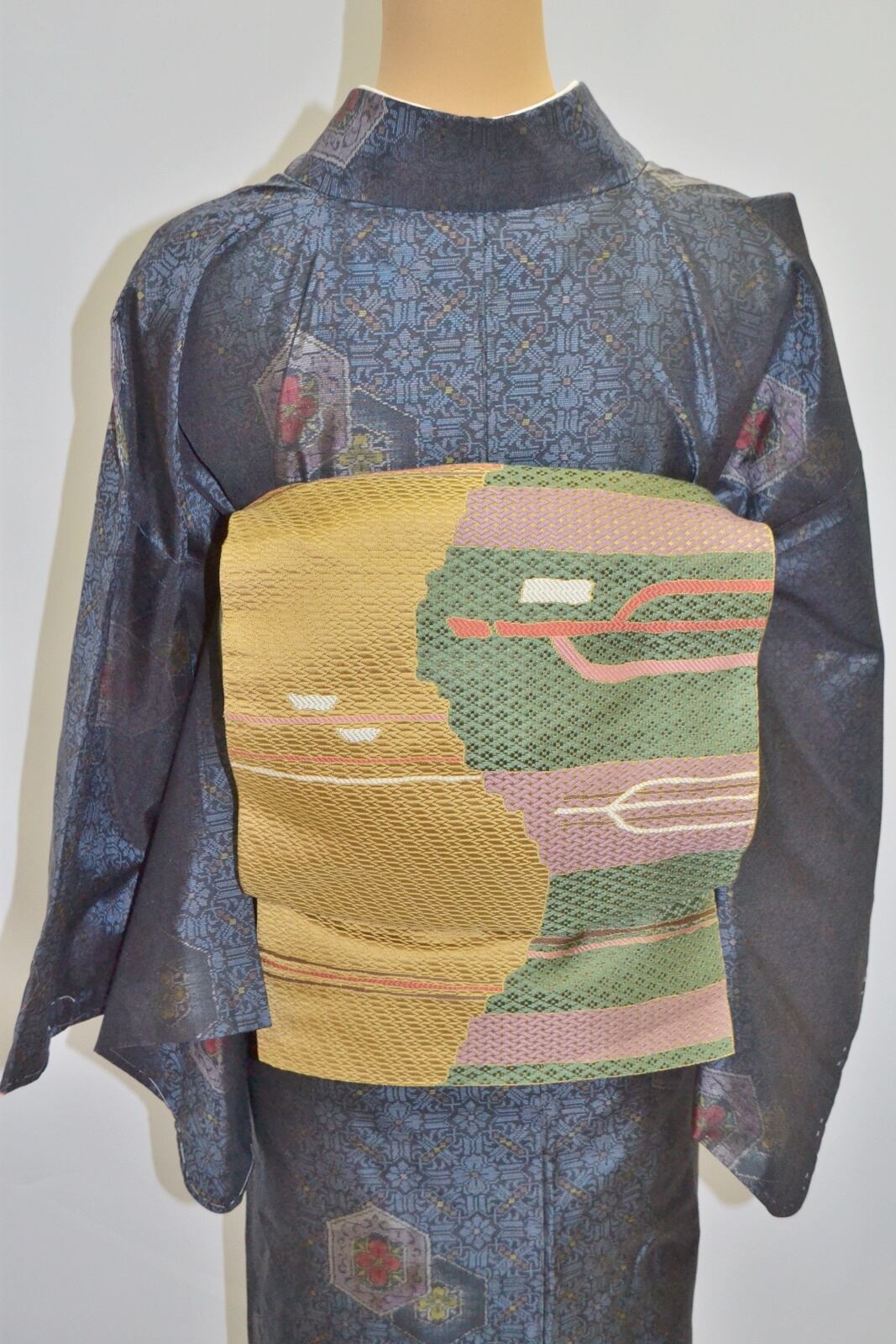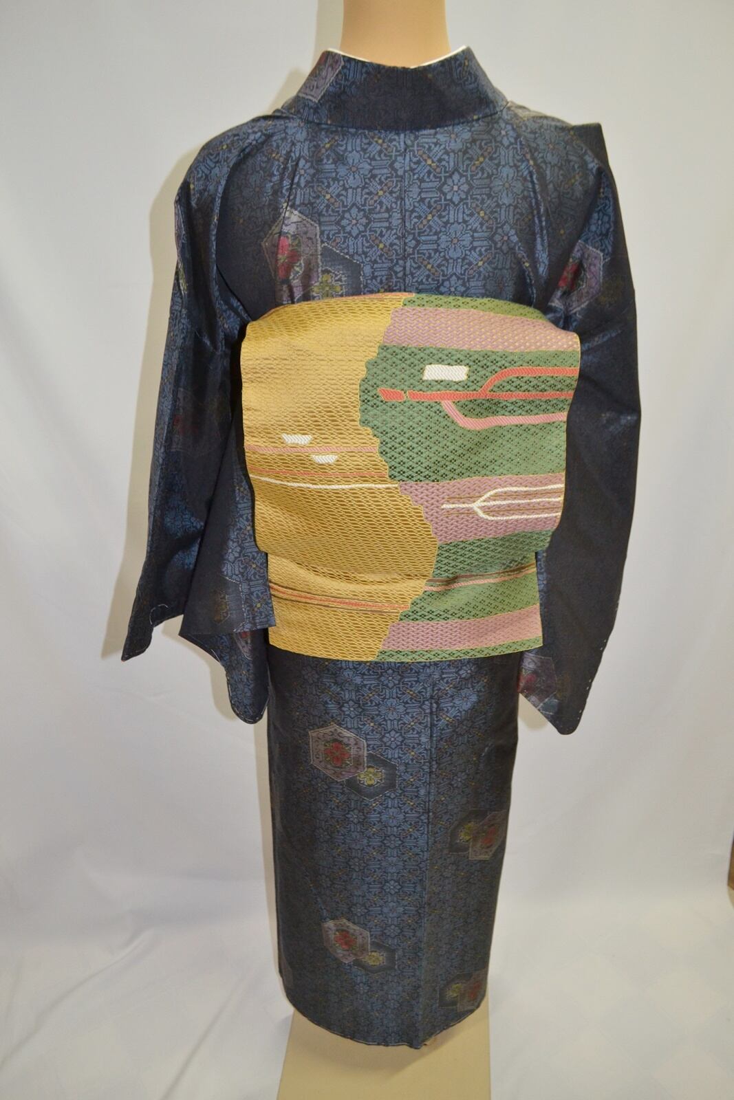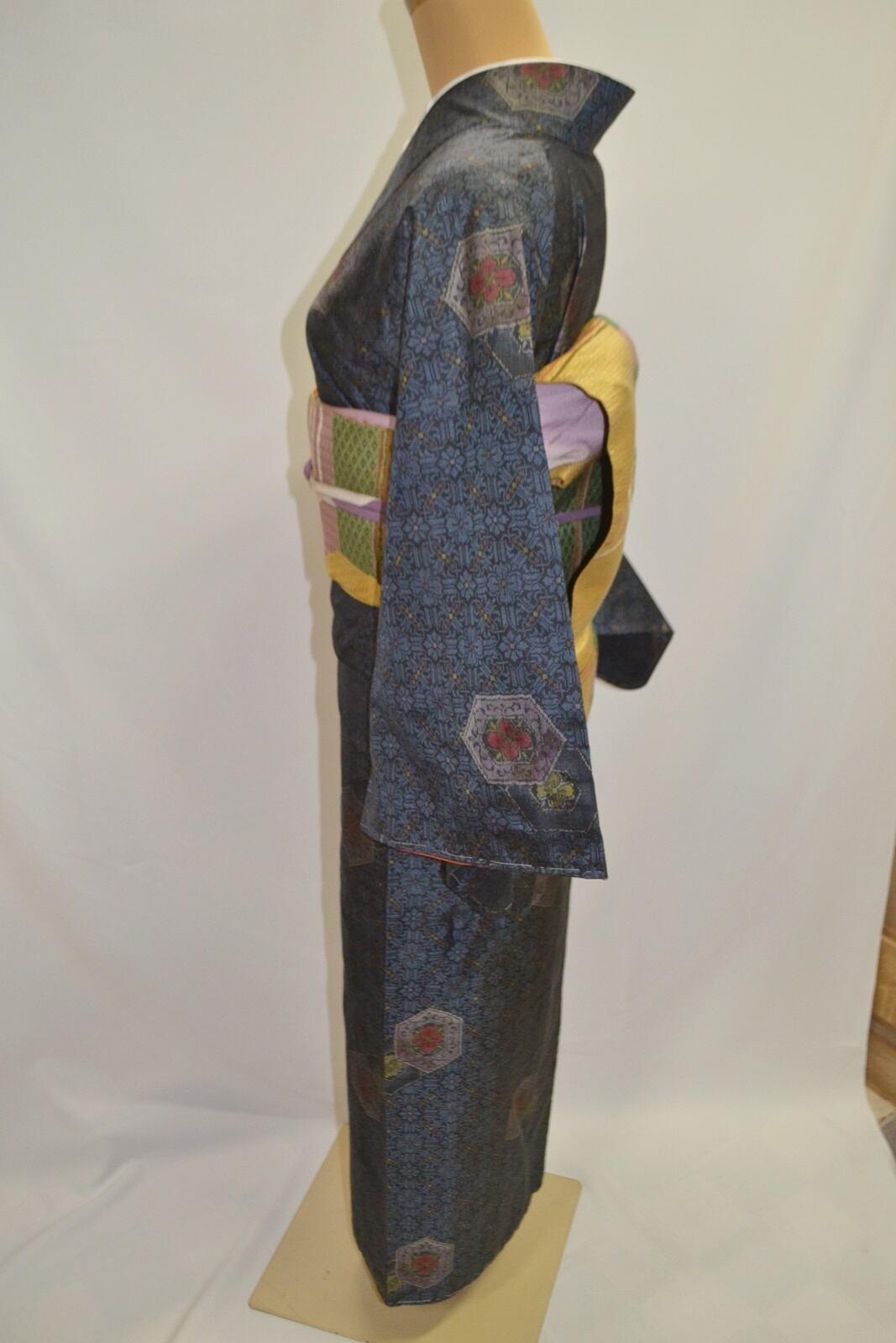 【トールサイズ】光沢のある紬☆紺地の亀甲花紋【横双】