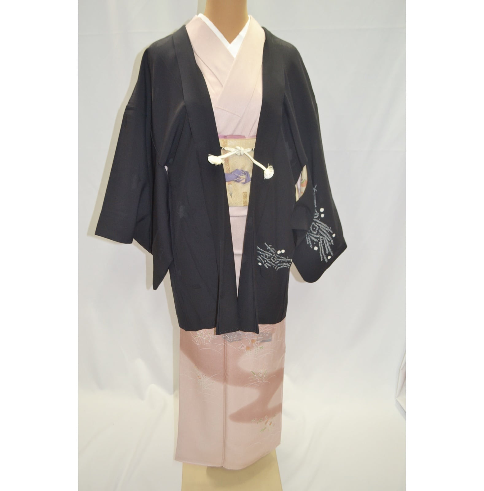 状態:正絹、裏地くすみ、つたの縫い取り紋入り、羽織ひも付
