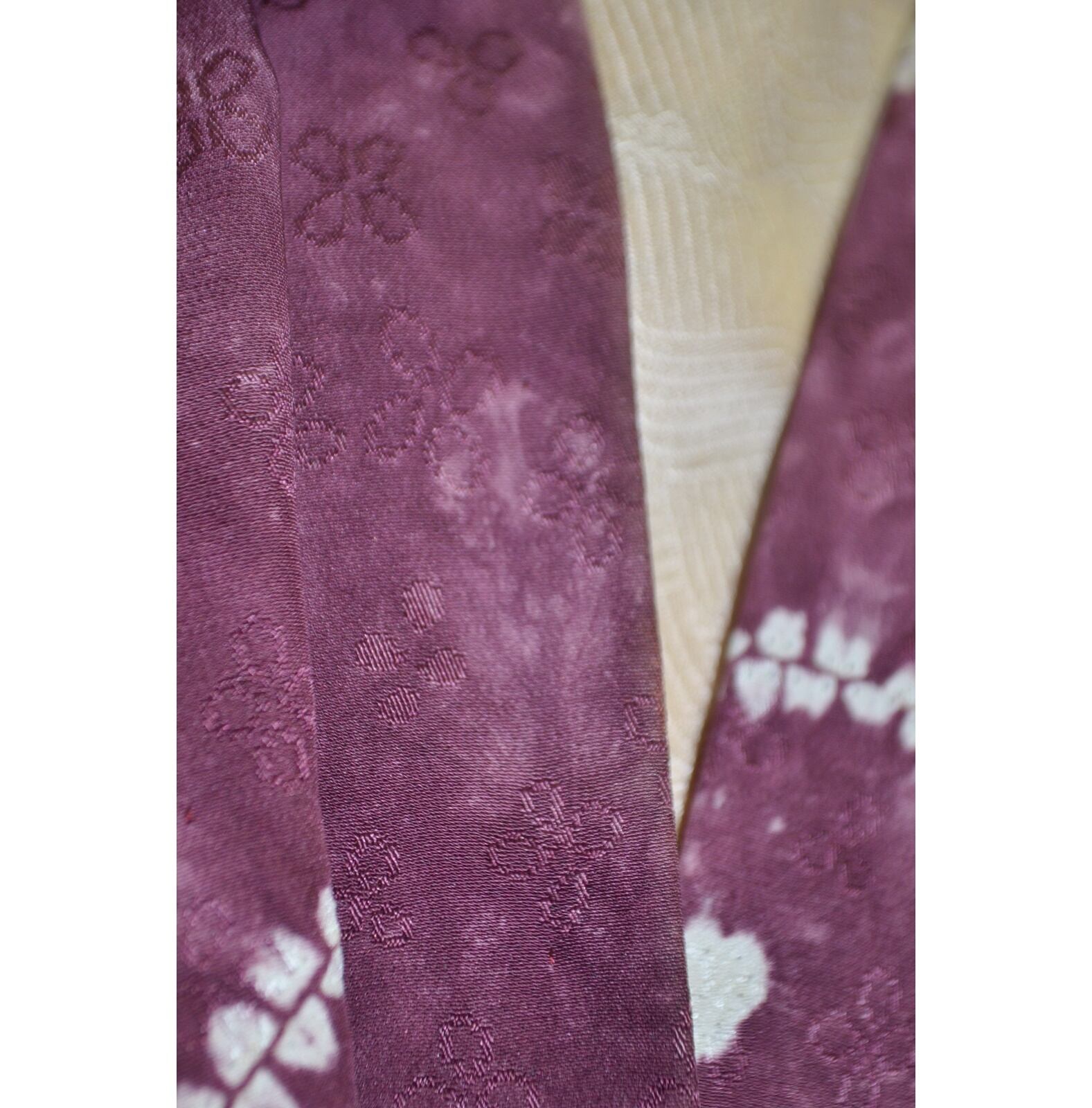 四つ葉のクローバーのような地紋の生地にムラのある染の羽織です。